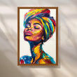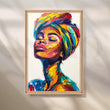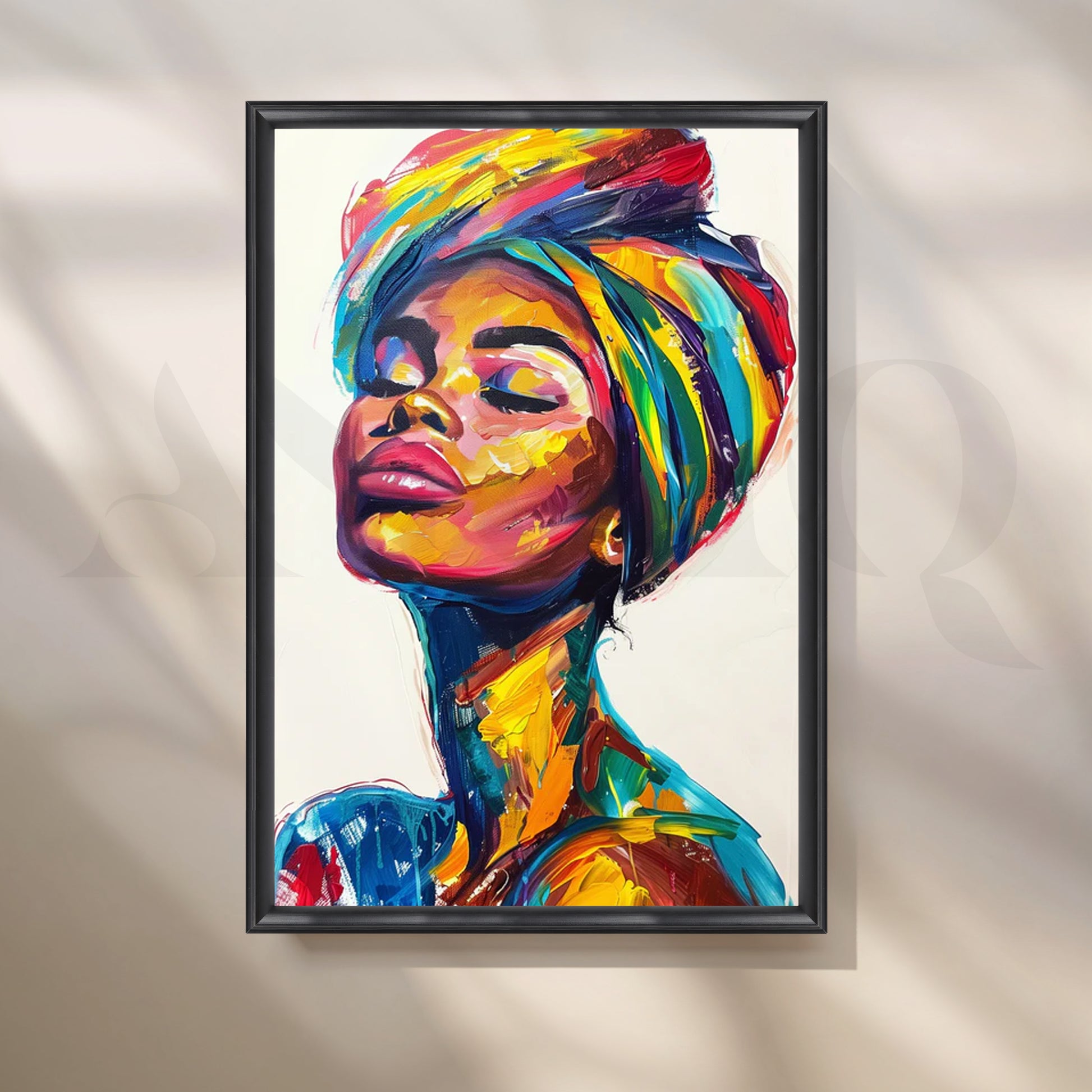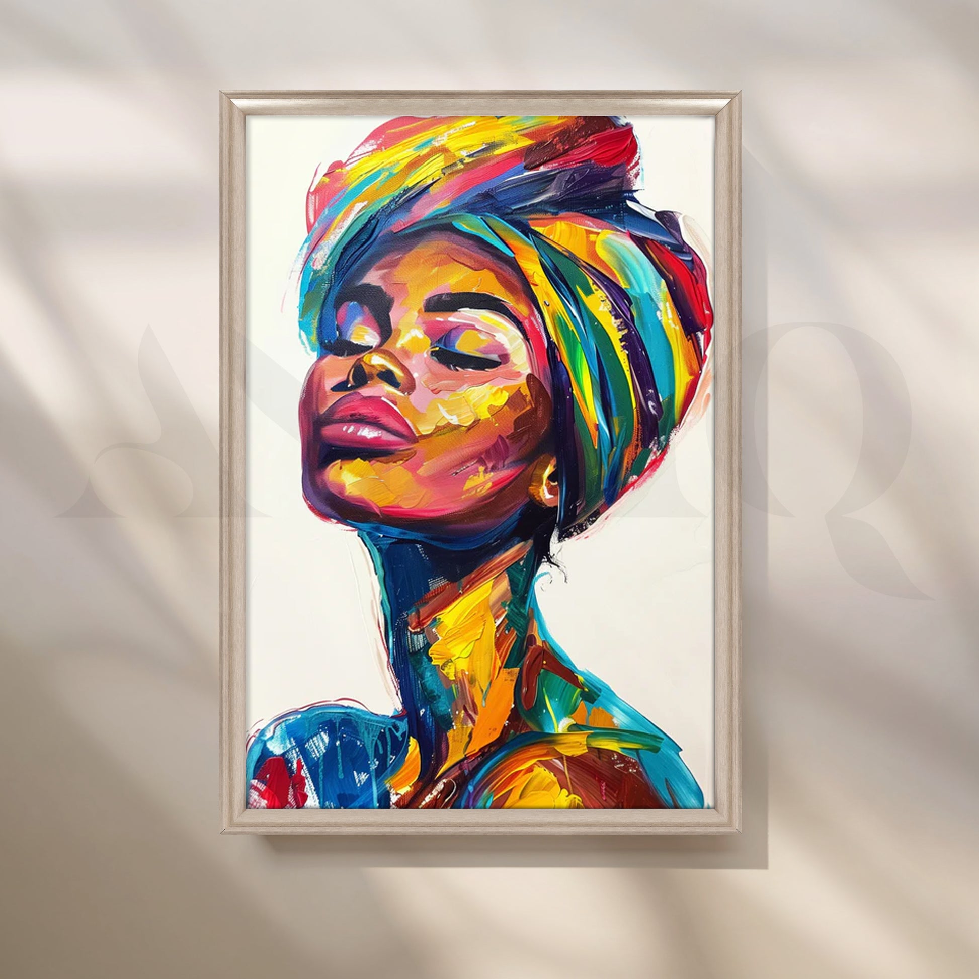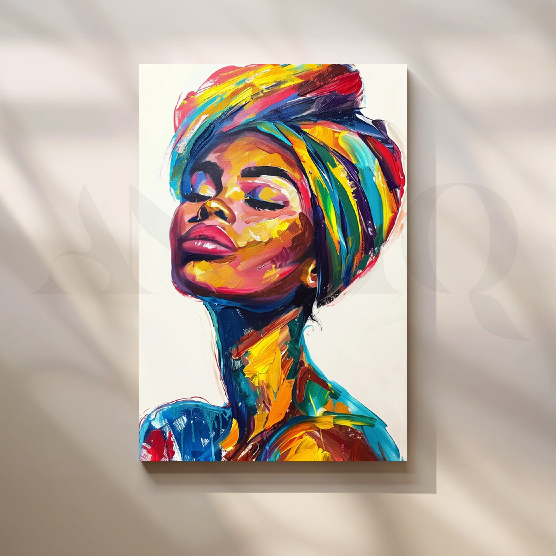 Clean white ground, radiant skin tones, and a rainbow headwrap deliver a fresh, contemporary portrait that pops in natural light. This colorful canvas painting suits modern living rooms and open-plan spaces, adding upscale gallery energy without clutter. Pair with neutral furniture for a luxe accent or use as large wall art above a credenza; perfect for “modern portrait art,” “colorful canvas wall art,” and “boho living room décor.”