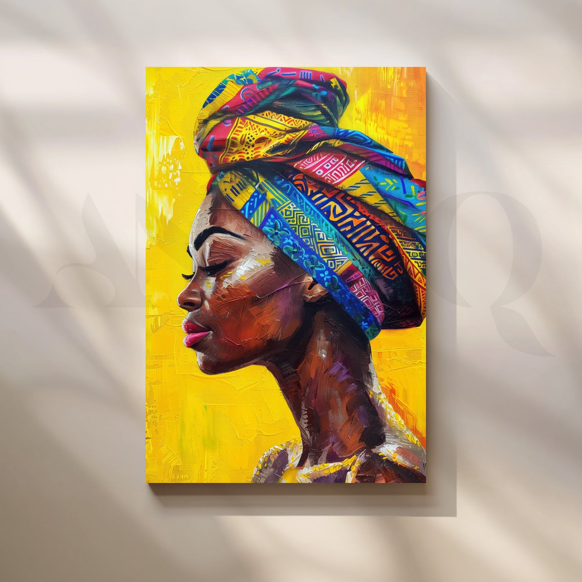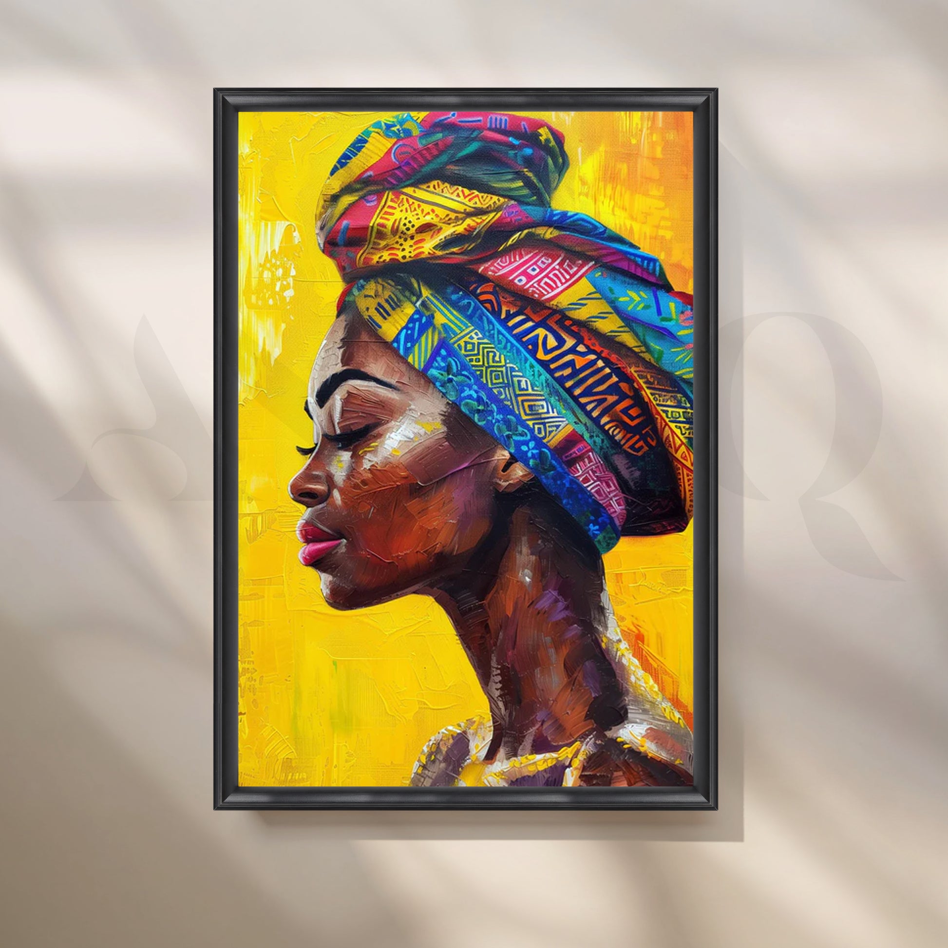 Bold and uplifting, Saffron Muse blends cobalt blue skin tones with a sun-yellow backdrop and a vibrant African headwrap for a striking, contemporary portrait. Rich mixed-media textures and expressive brushwork make this modern wall art a true statement piece—perfect as large living room art, colorful gallery wall décor, or boho bedroom décor. Ideal for buyers searching for “abstract portrait canvas,” “bold wall decor,” and “vibrant canvas painting.”