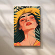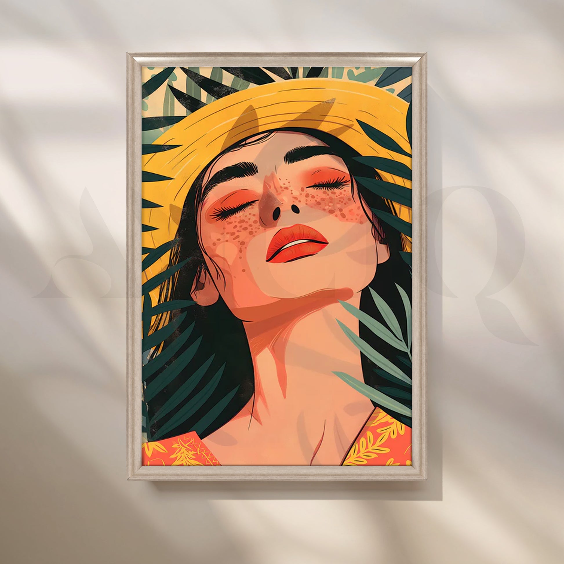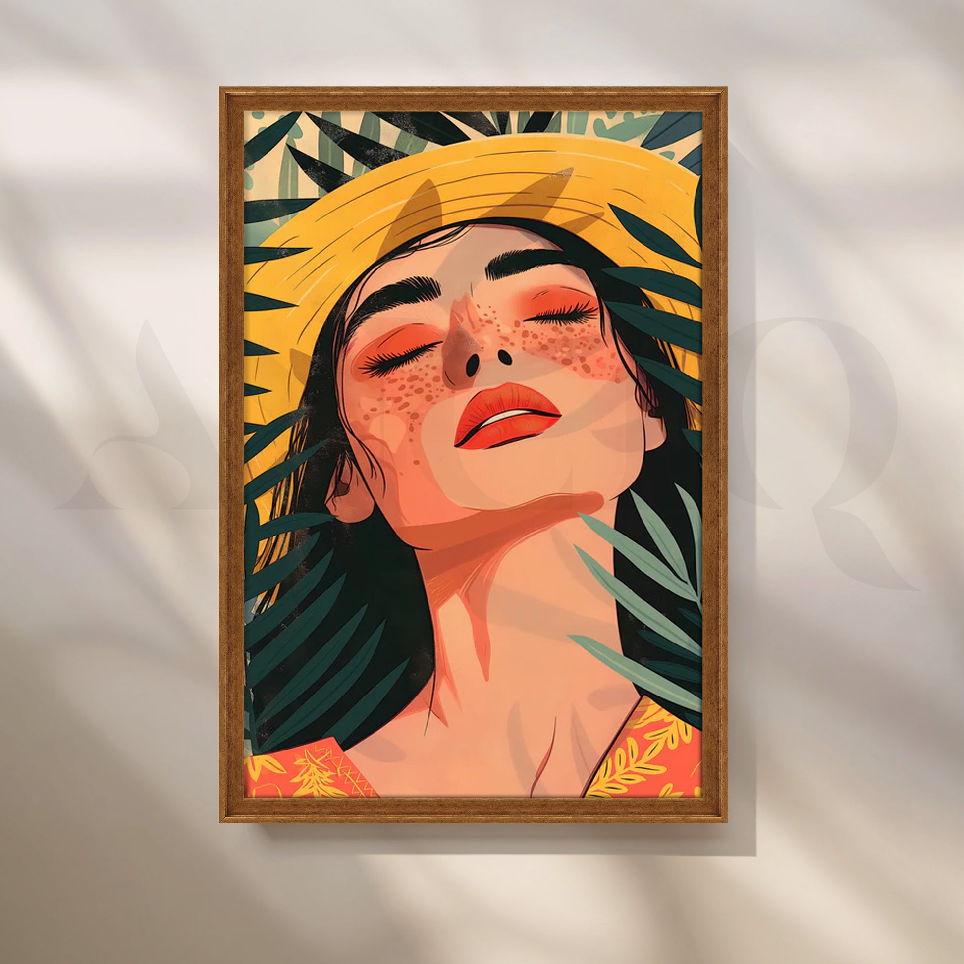Vibrant and uplifting, this contemporary canvas features a freckled woman in a wide-brim hat, eyes closed in sunshine, surrounded by lush palms. Rich greens, mustard yellow and warm coral bring a vacation-fresh pop to modern wall art—ideal for a living room accent, coastal décor, or boho gallery wall. A bold yet breezy illustration that reads as large statement wall art or chic summer décor.