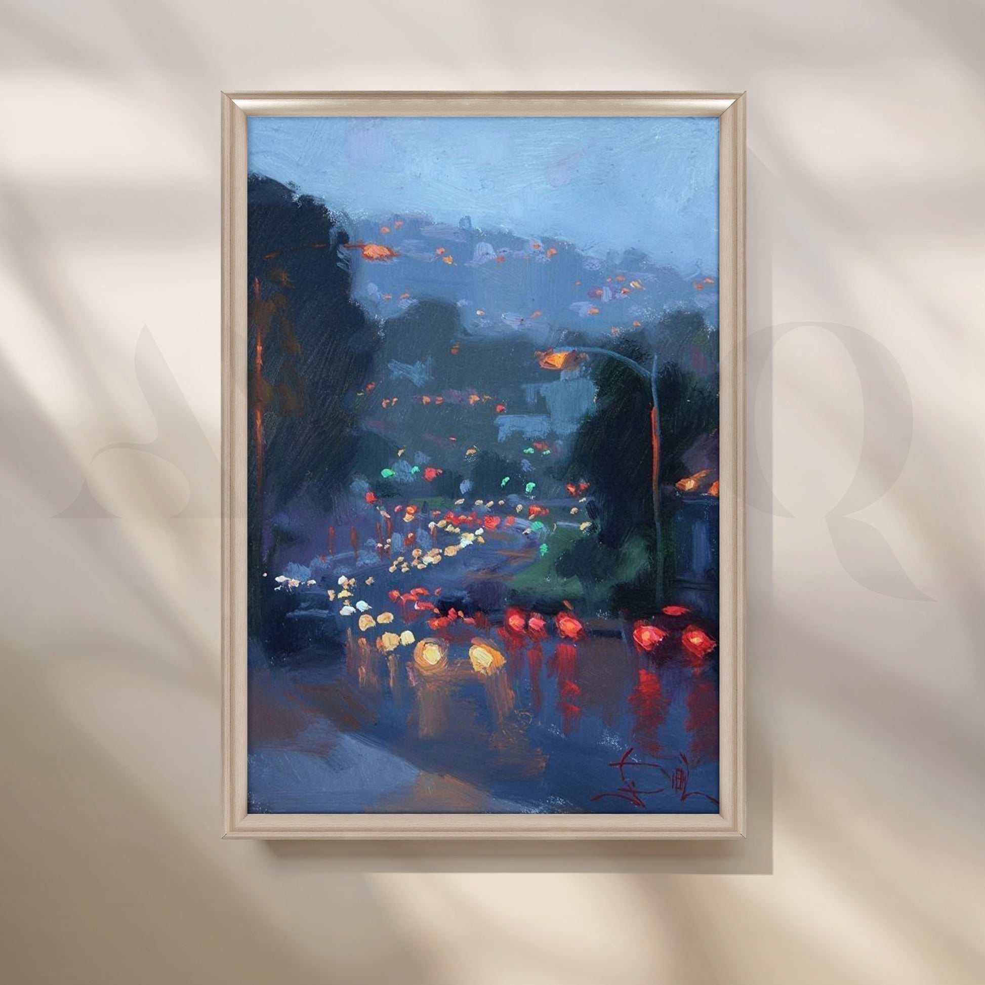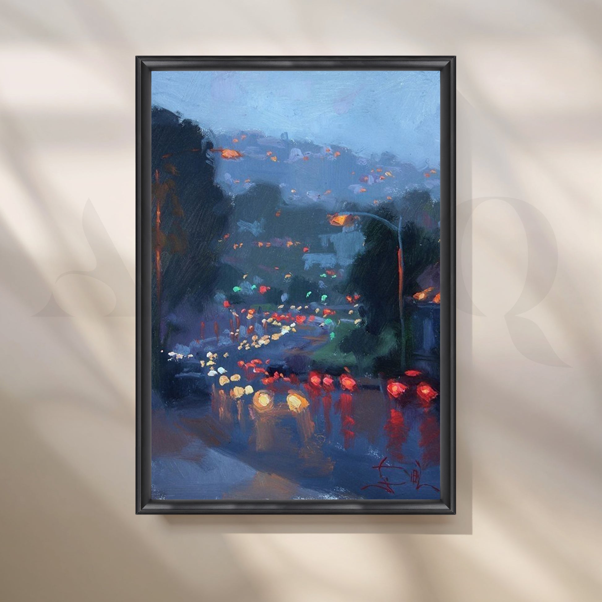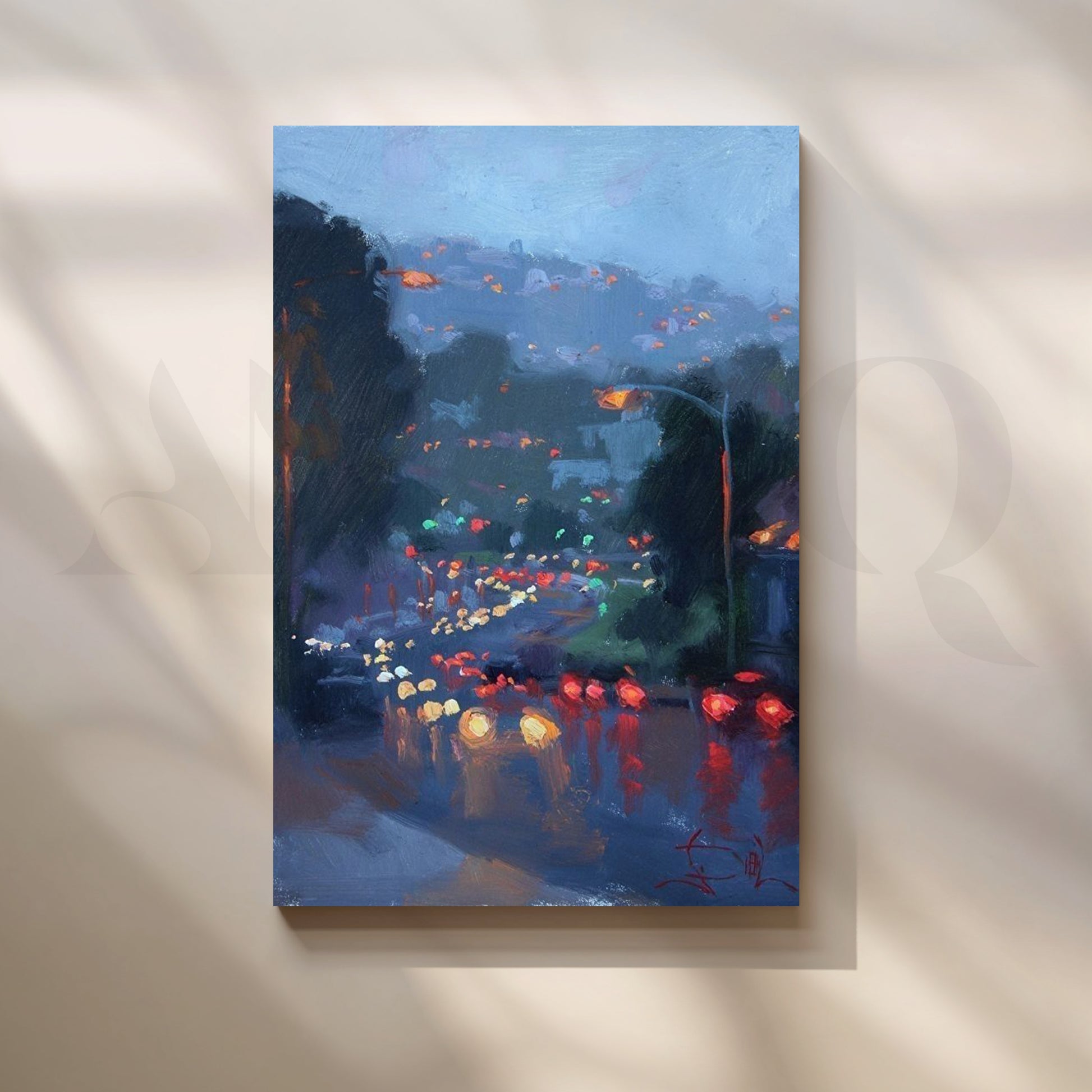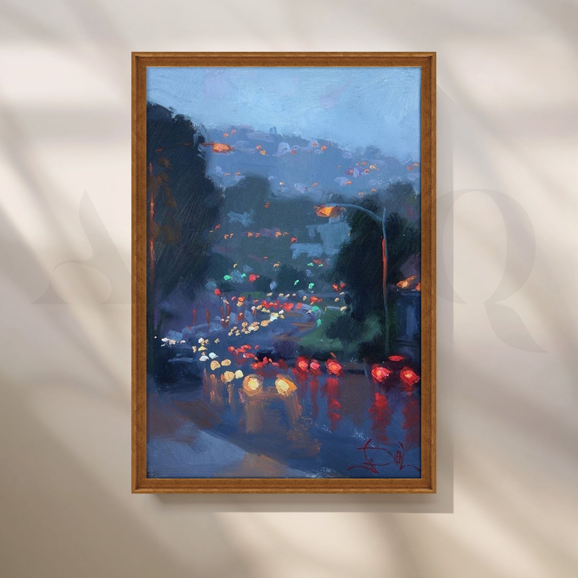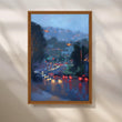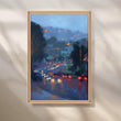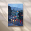 Night traffic glows through drizzle and streetlights—an urban impressionist scene in inky blues with neon reflections. Energize workspaces, studios and living rooms with this contemporary city canvas. Keywords: cityscape wall art, rainy night painting, urban canvas print, modern office décor, skyline lights artwork, impressionist city art.
