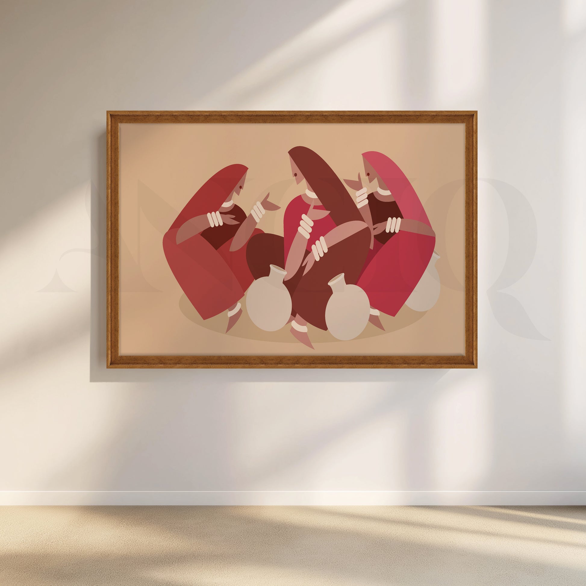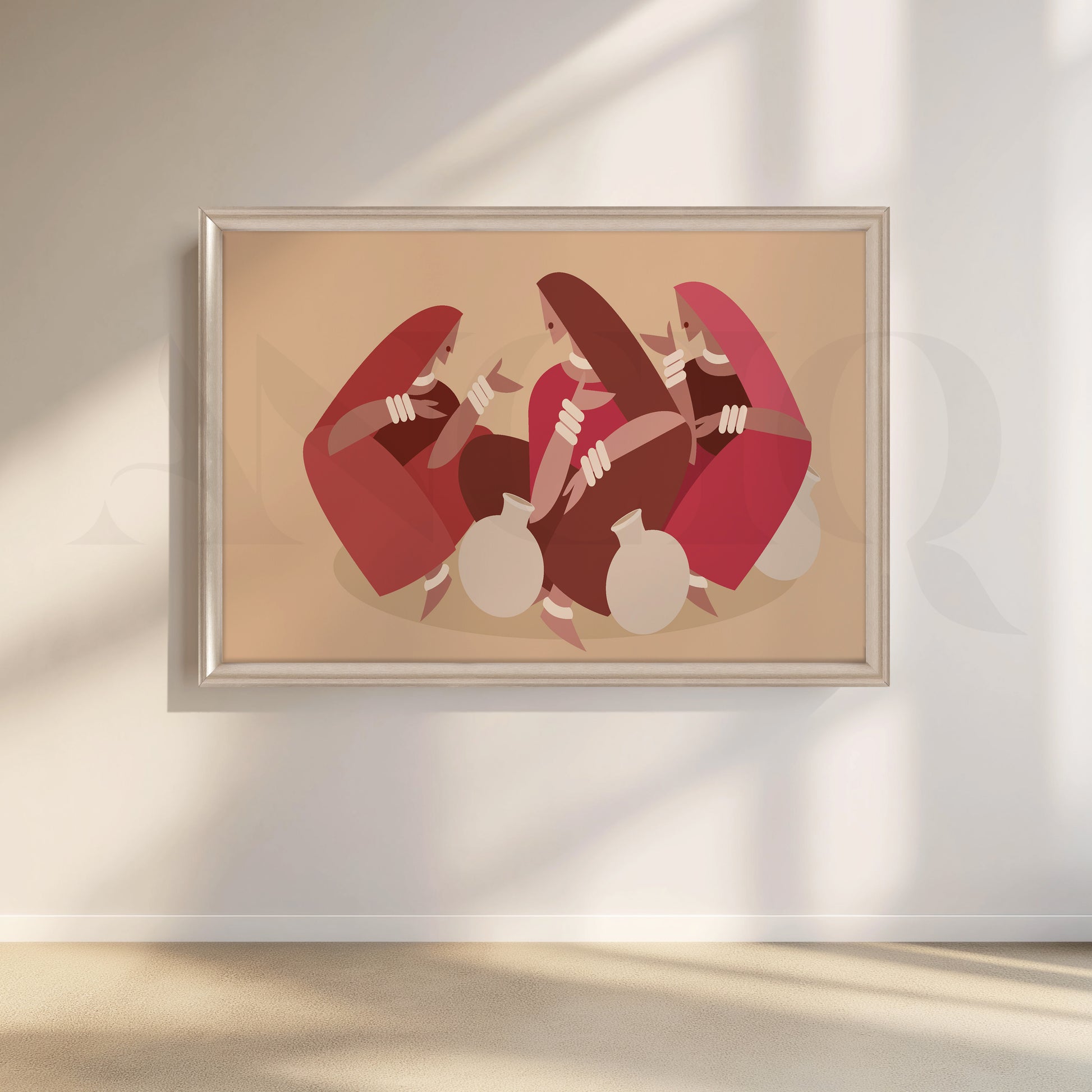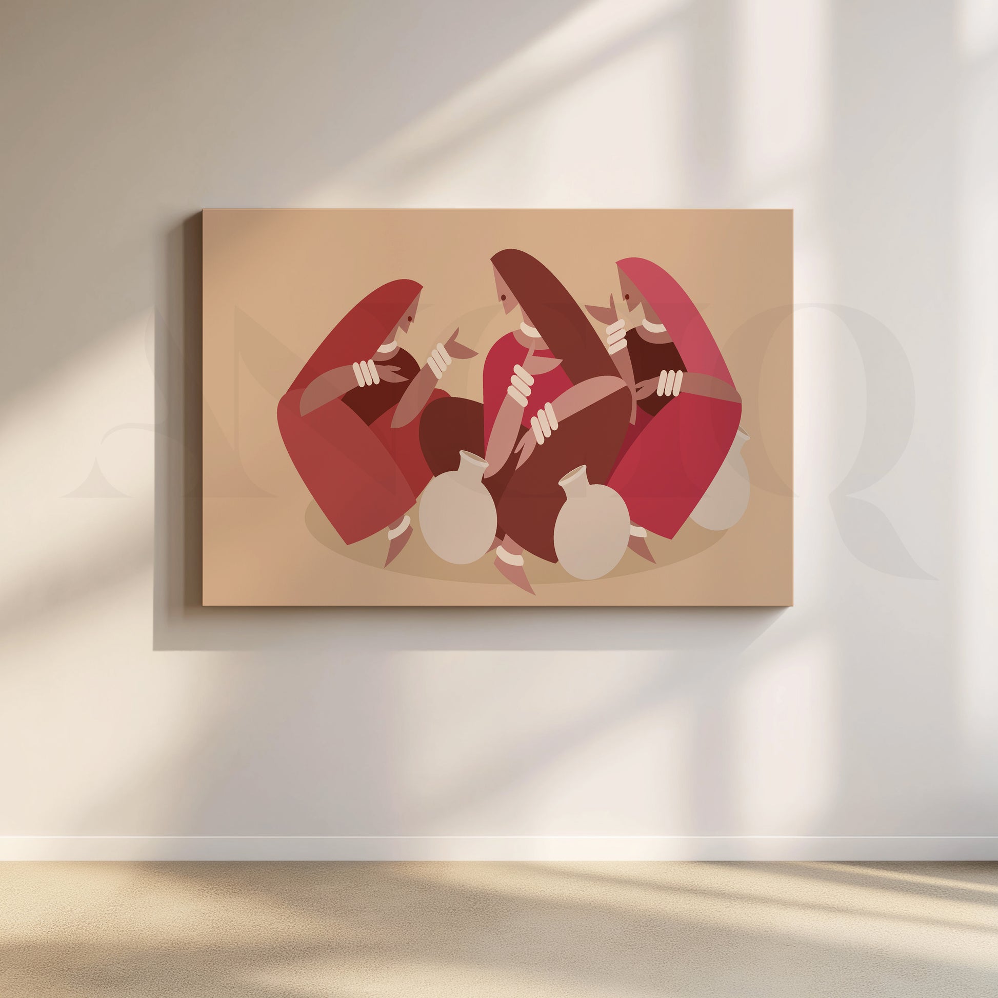 Capture the essence of Rajasthani rural life with this beautiful canvas painting. Three women, dressed in vibrant colors, rest elegantly next to traditional pots (matka). Infused with serenity and cultural richness, this artwork is sure to add a timeless elegance to your home.