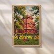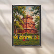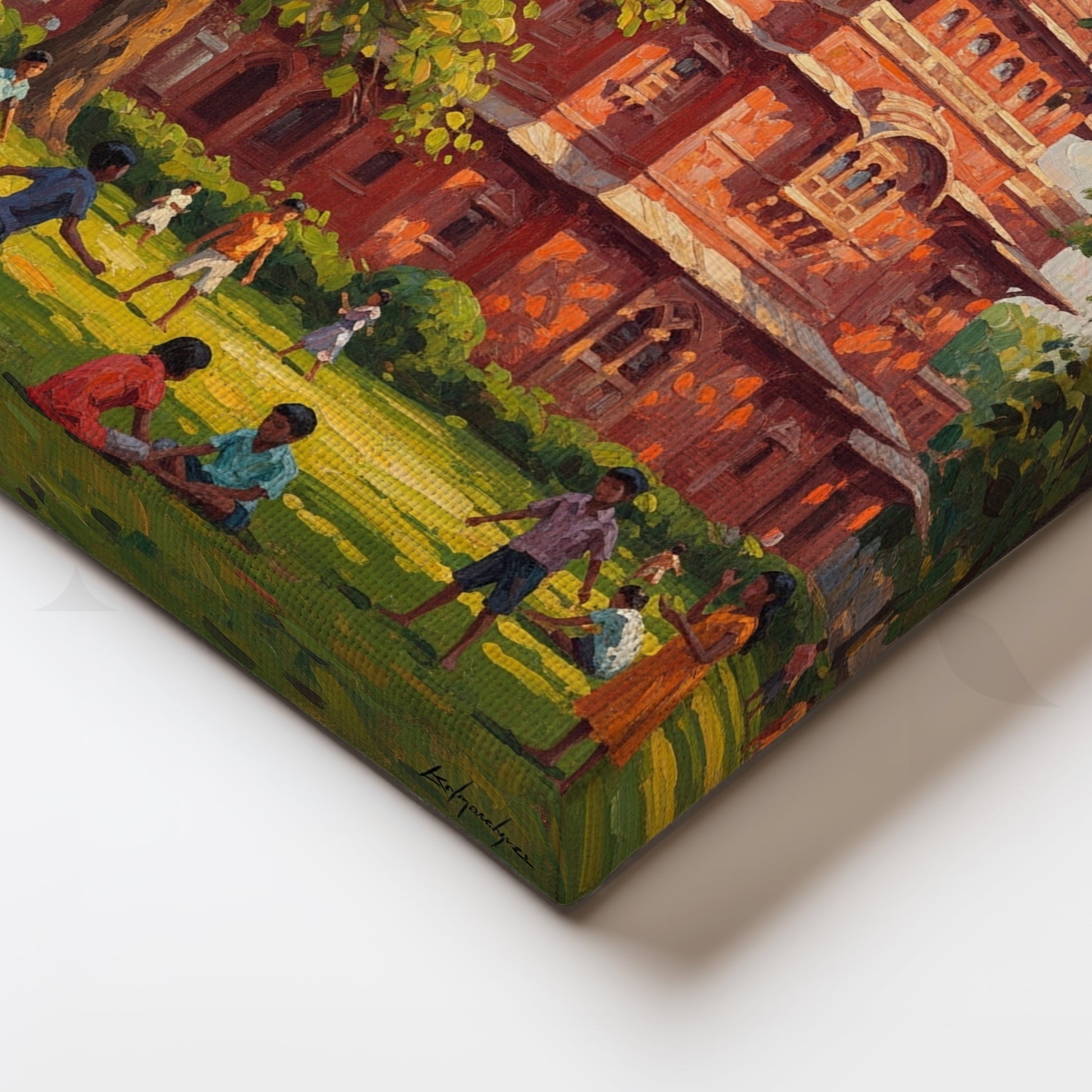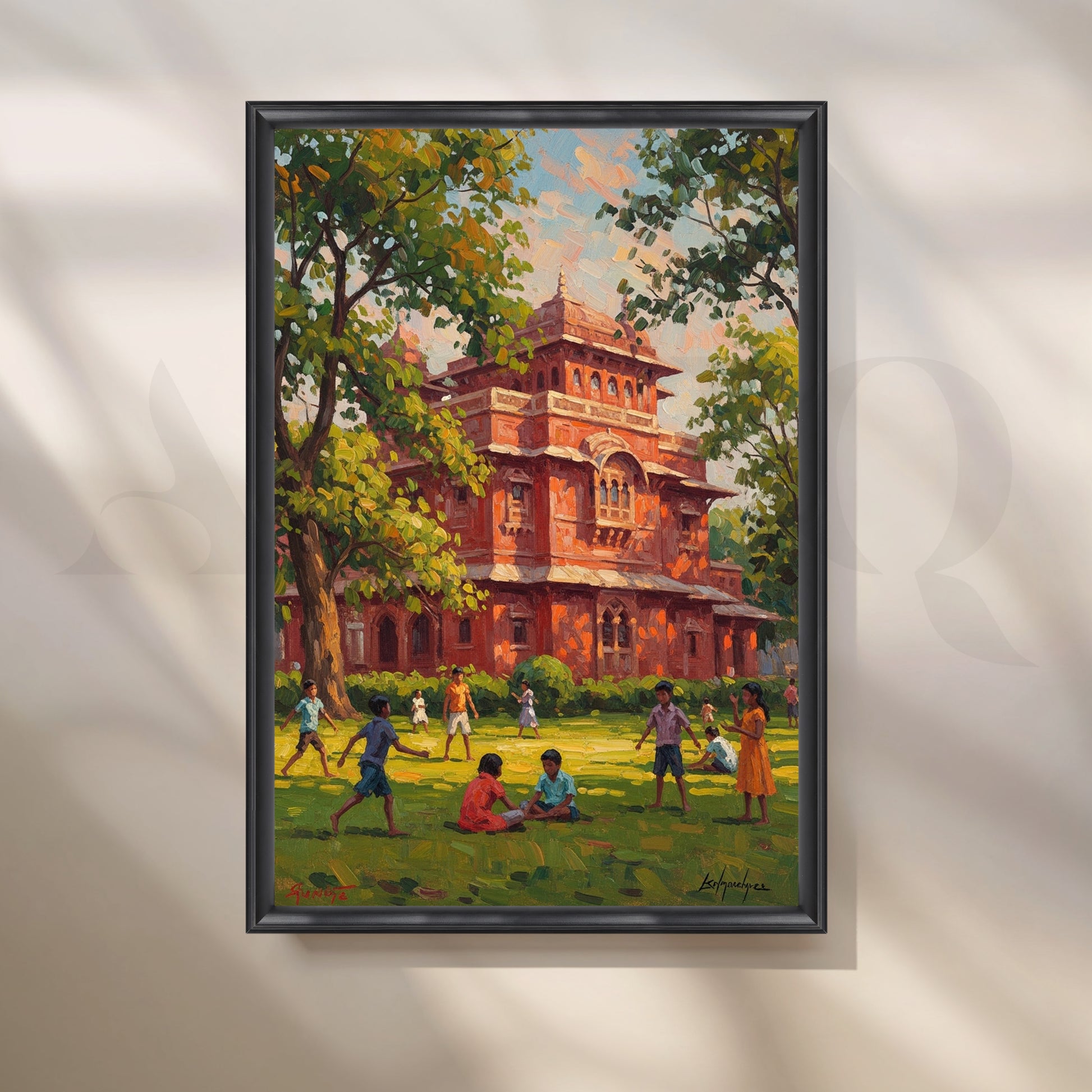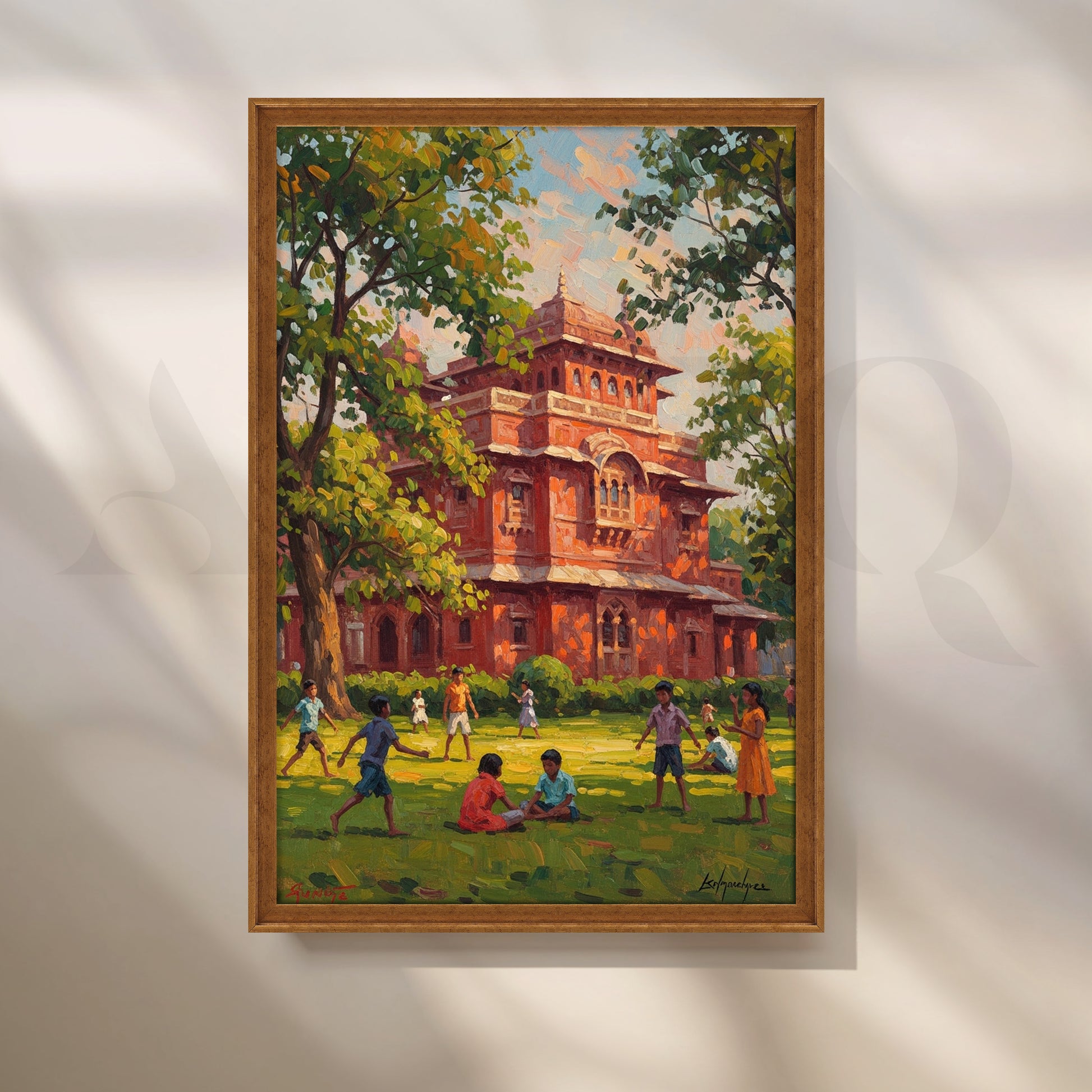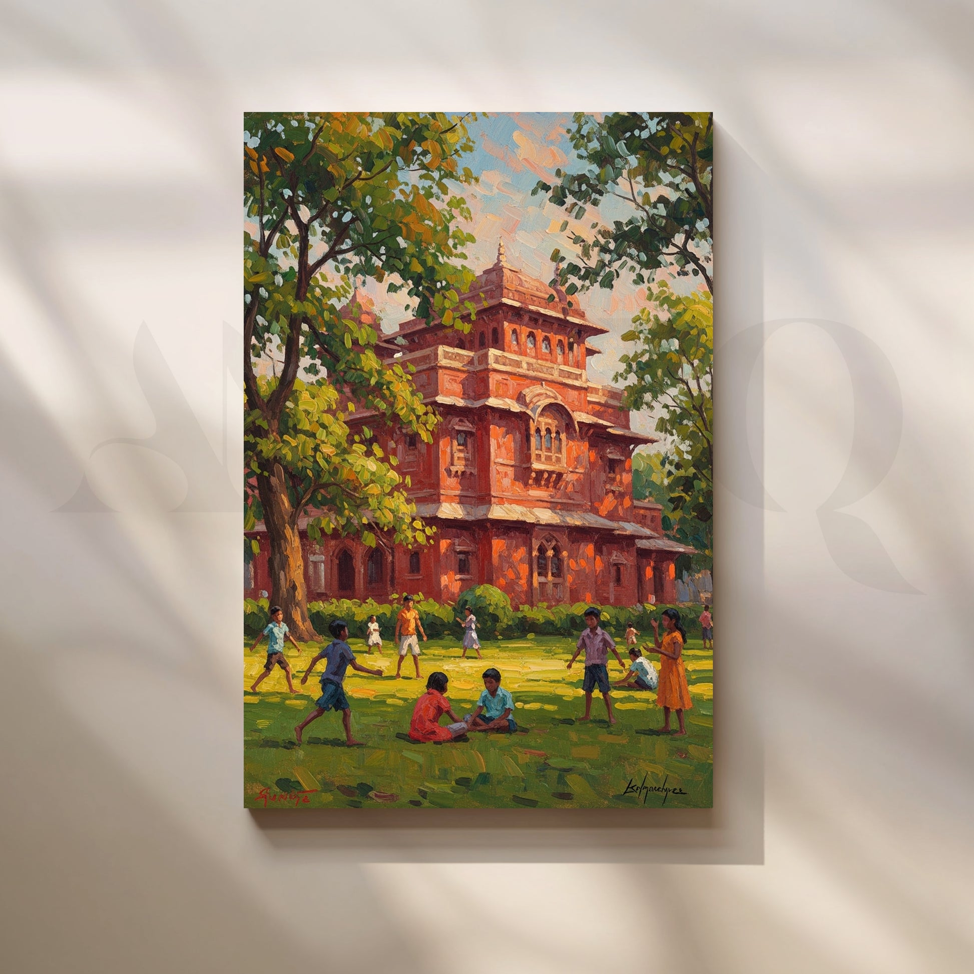 Anciq ‘Red Fort School Day’ illustrates vibrant childhood moments on a sunny green lawn in front of a majestic red-brick heritage building. With playful figures and rich foliage, this cheerful artwork brings joy to kids’ rooms, study areas, or classrooms—ideal for searches like “heritage school art,” “Indian childhood canvas,” or “playground painting.”