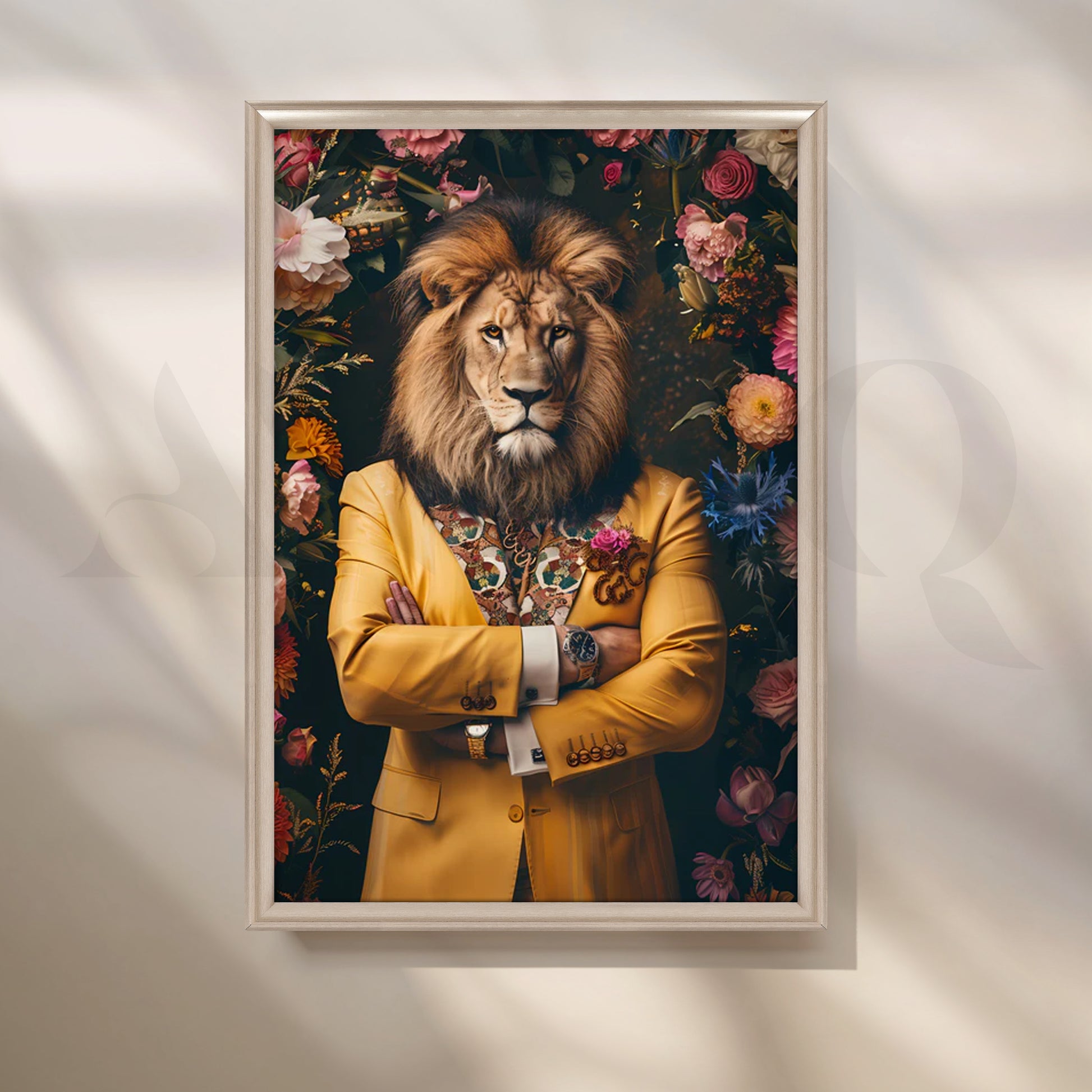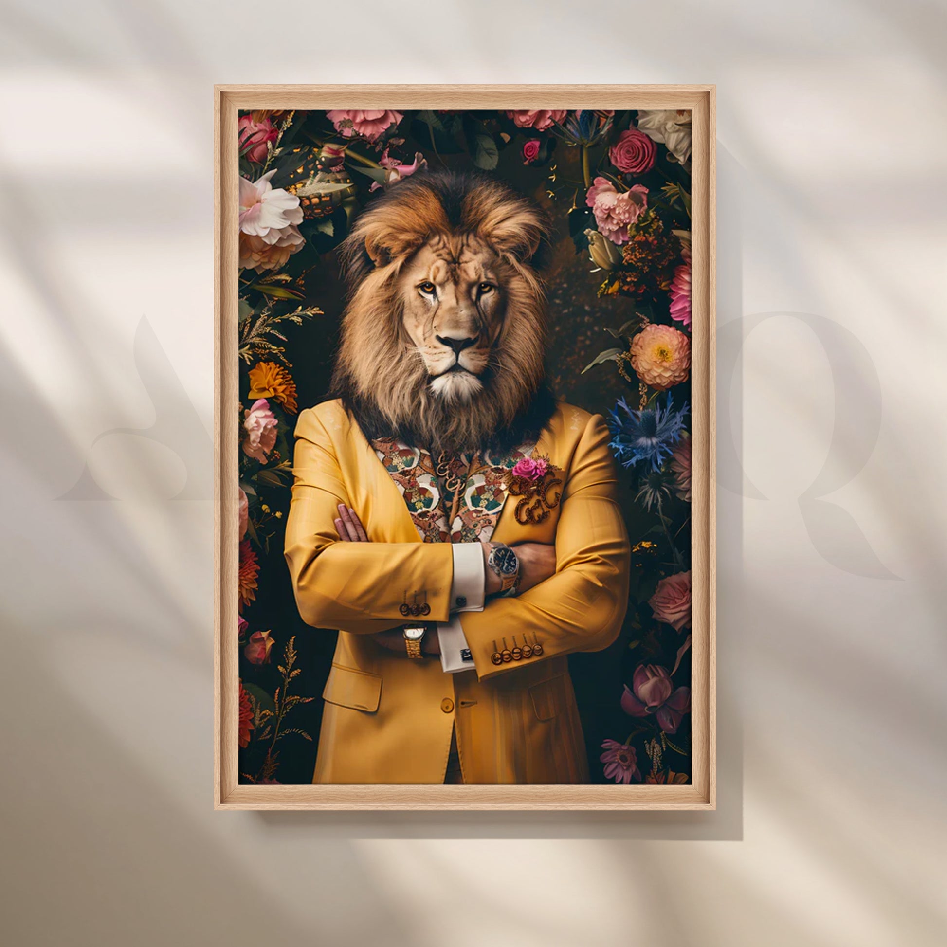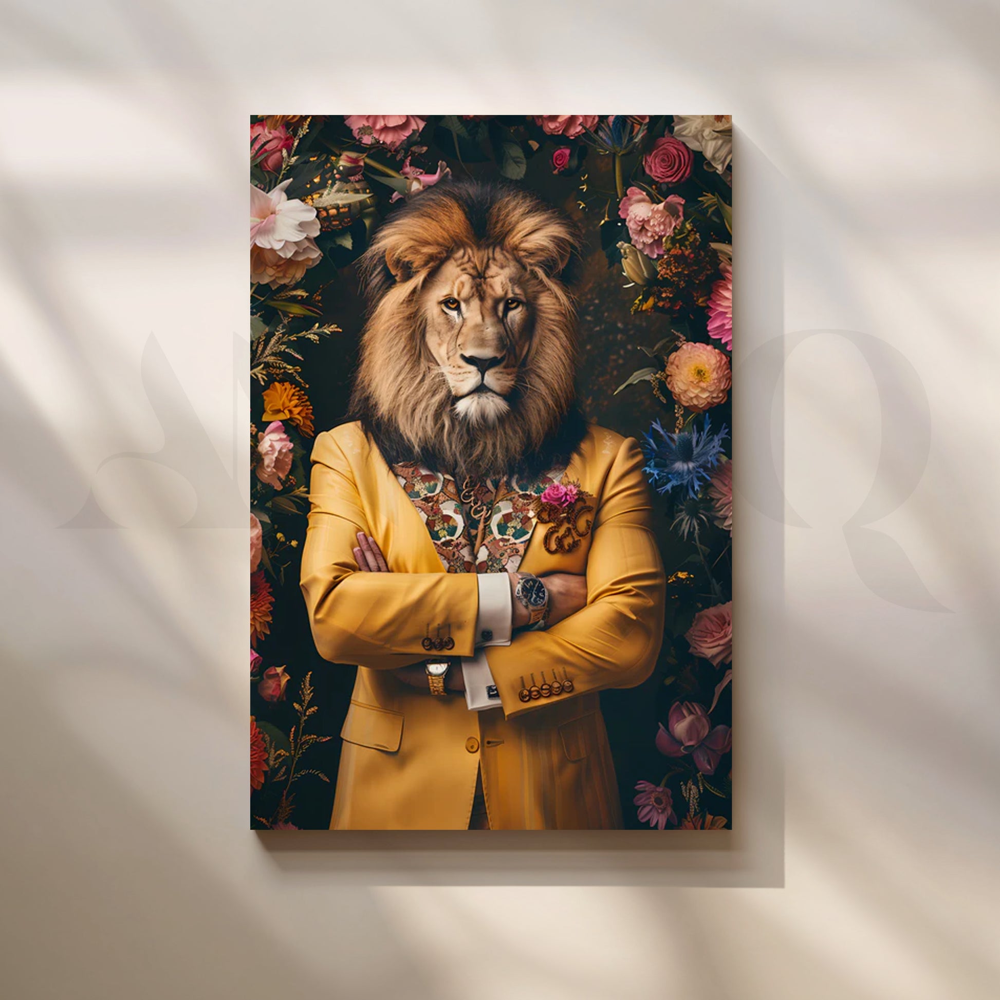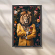 A regal lion in a patterned suit against a lush floral backdrop creates a striking, fashion-forward portrait—part pop art, part vintage botanical. This statement canvas elevates an office, den or dining room with maximalist flair, perfect for eclectic gallery walls. Bold modern wall art that becomes the conversation piece in any large living room or study.