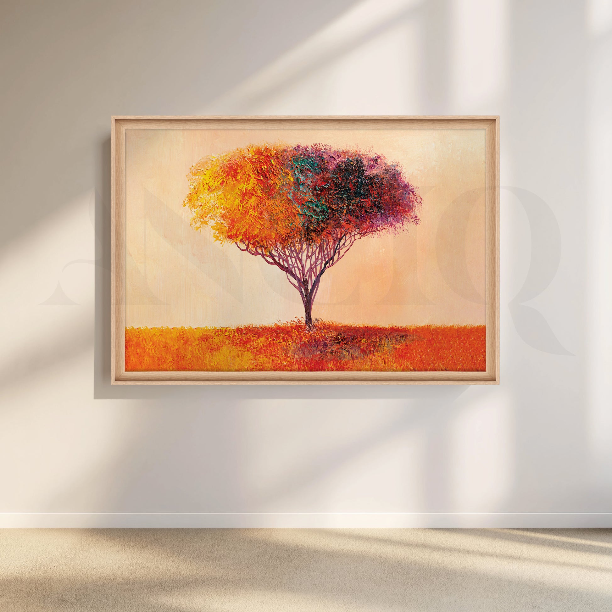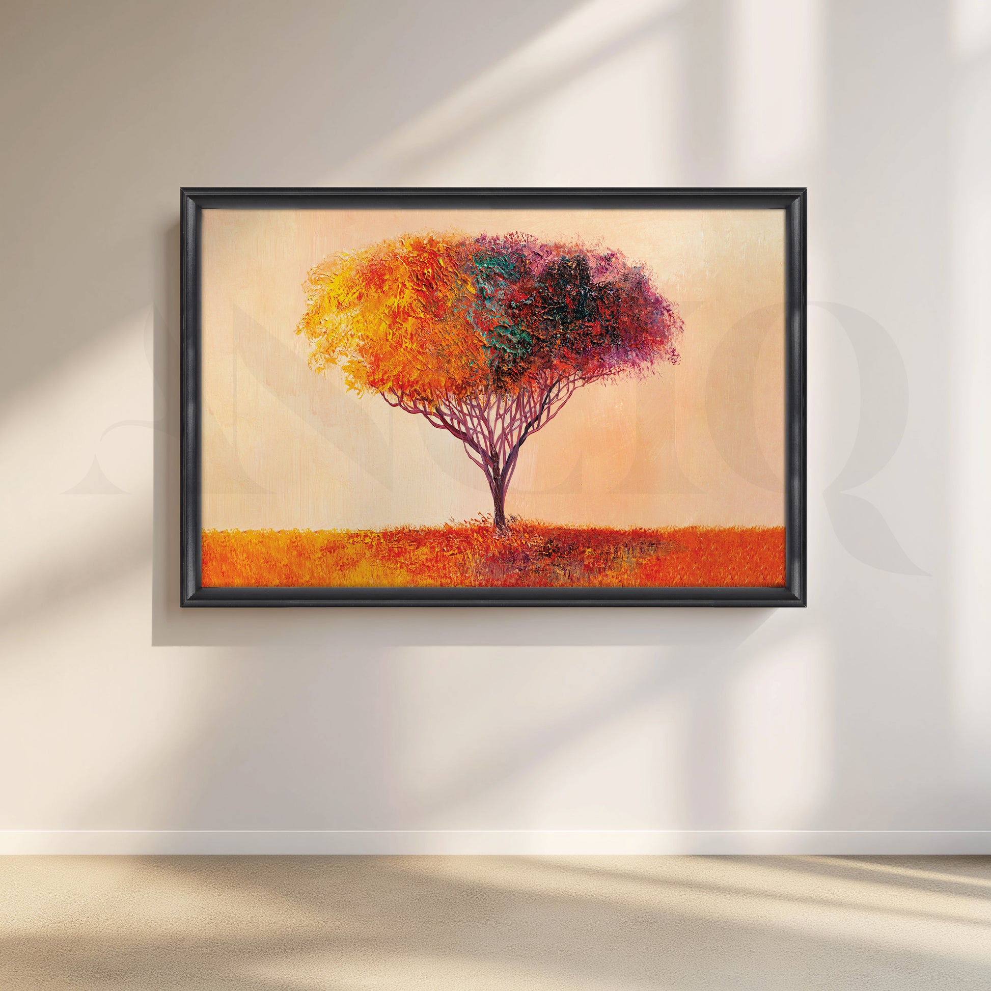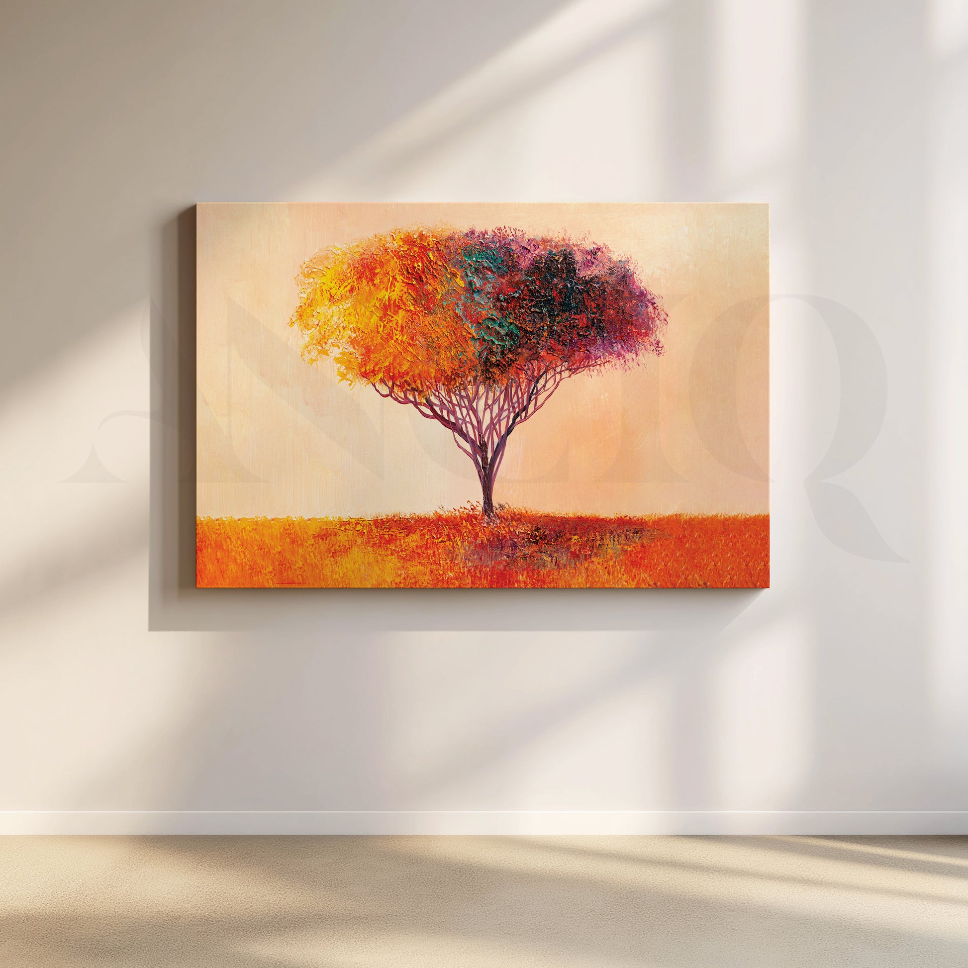 The "Resilient Beauty Canvas Wall Painting" is a vibrant and abstract depiction of a tree. The tree is full of life and color, with a strong trunk and branches that reach out towards the sky. The painting is made with high-quality materials and is sure to last for years to come. It is a beautiful and unique piece of art that will add a touch of whimsy to any home.