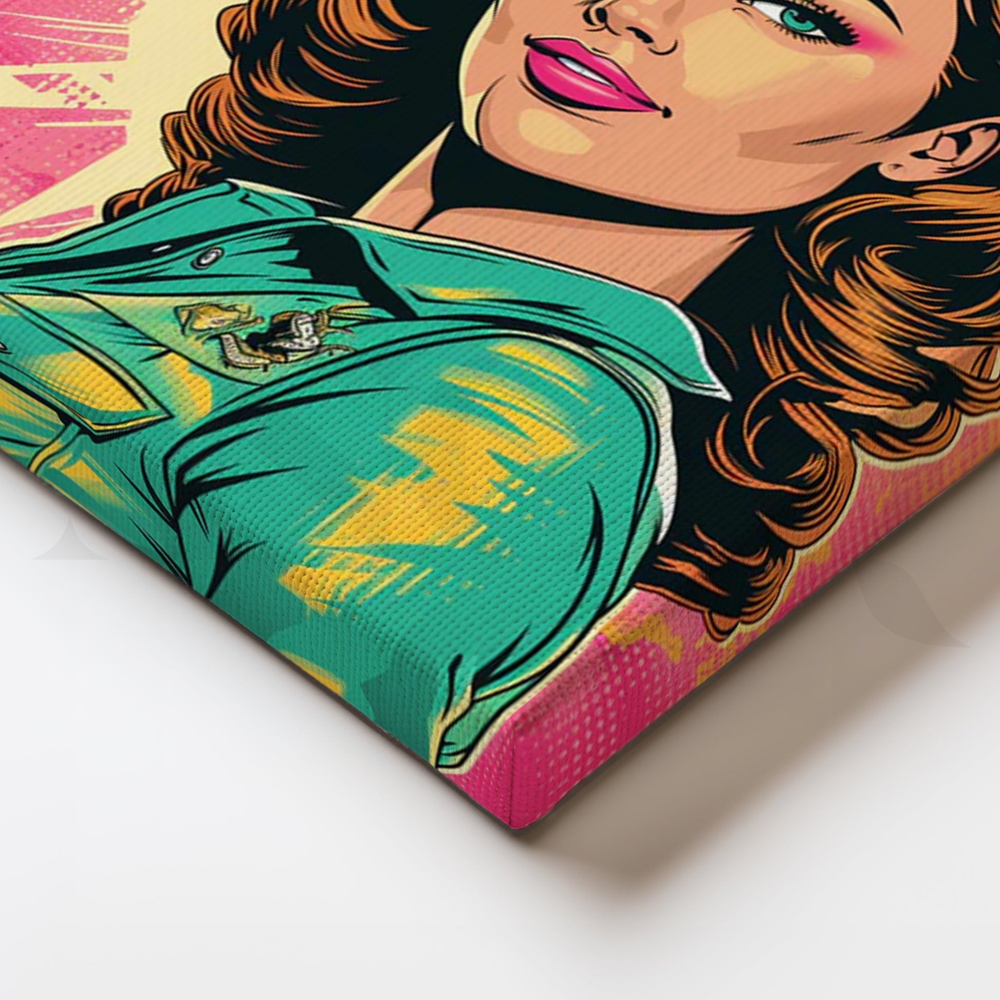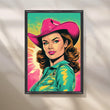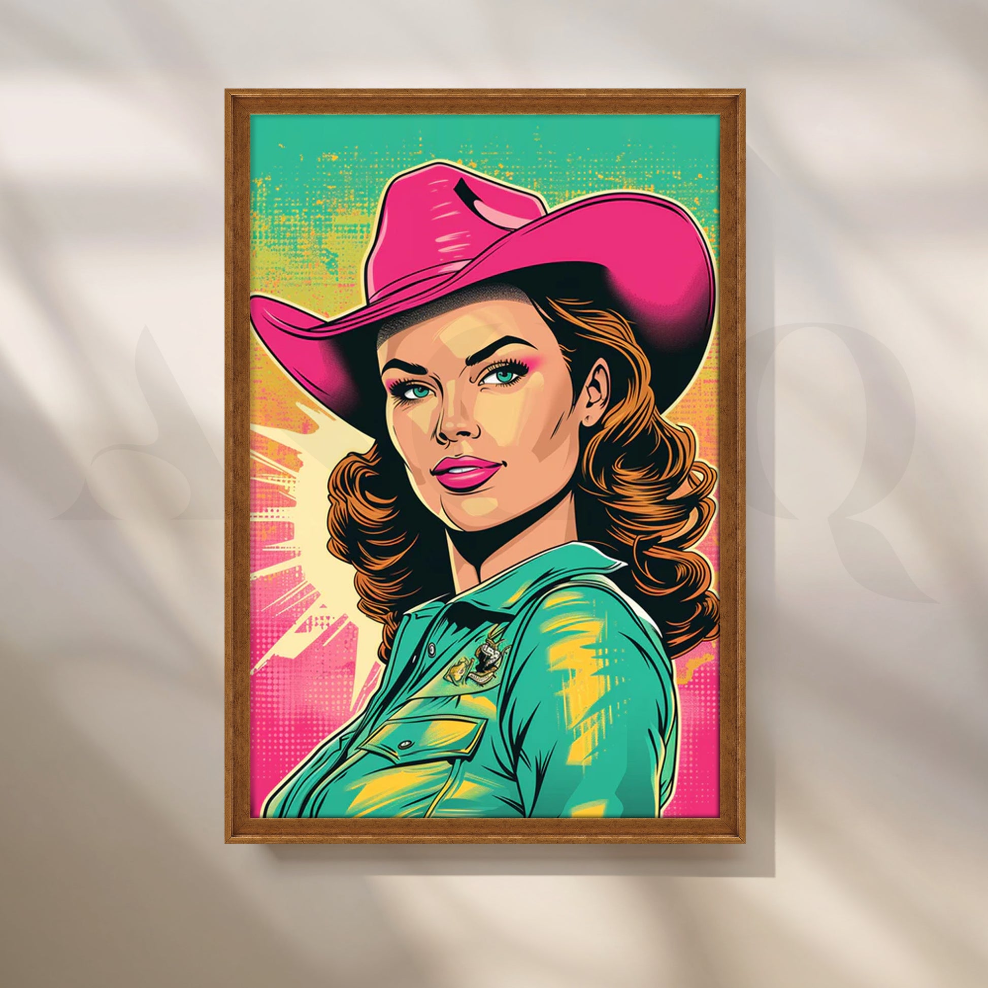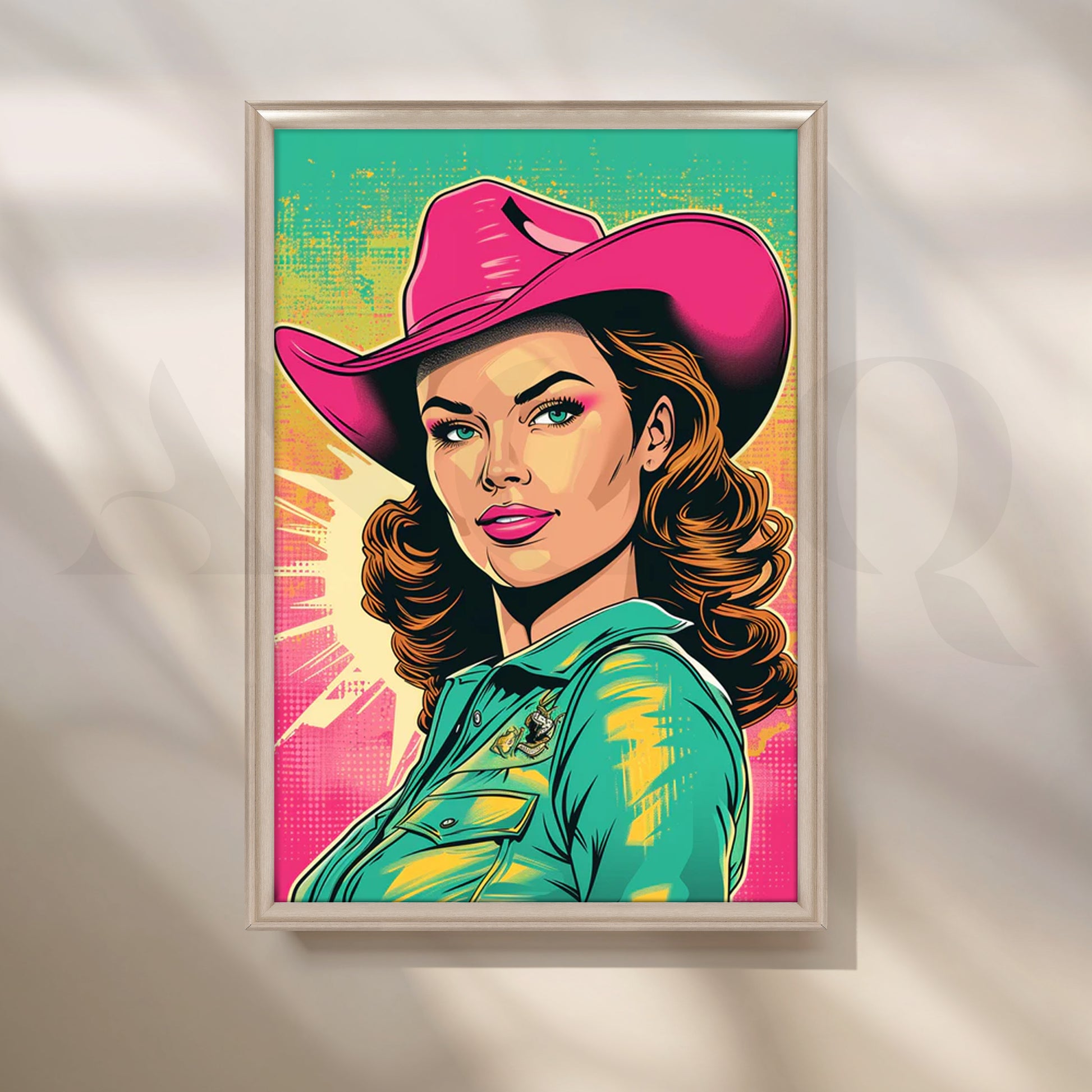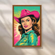 Bold comic-style cowgirl in hot-pink hat with teal jacket and retro halftone background—vibrant pop art that energizes modern spaces. Keywords: cowgirl wall art, pop art portrait, retro comic poster, neon pink teal artwork, Western pop art canvas, colorful wall decor for living room, bar, or entertainment room.