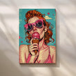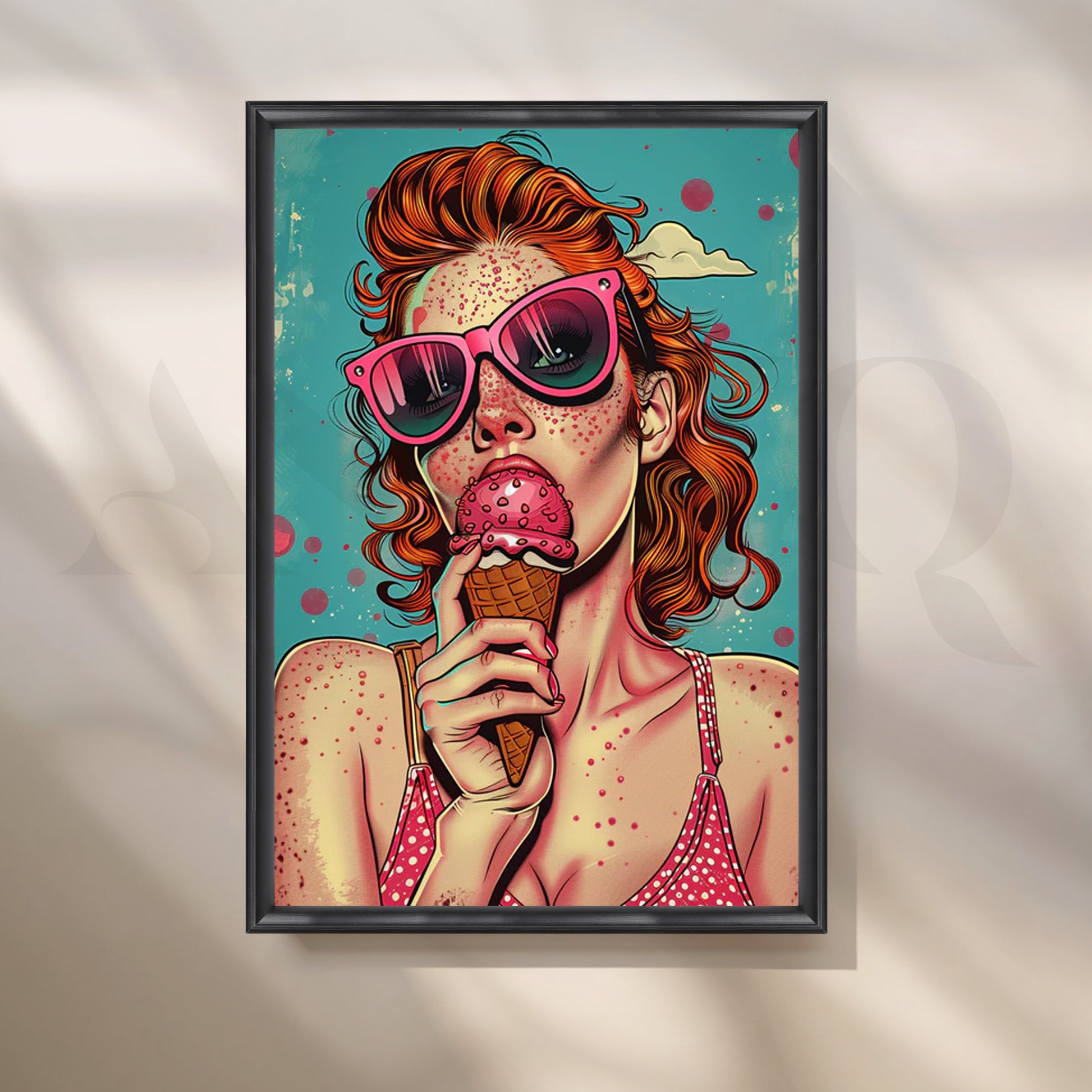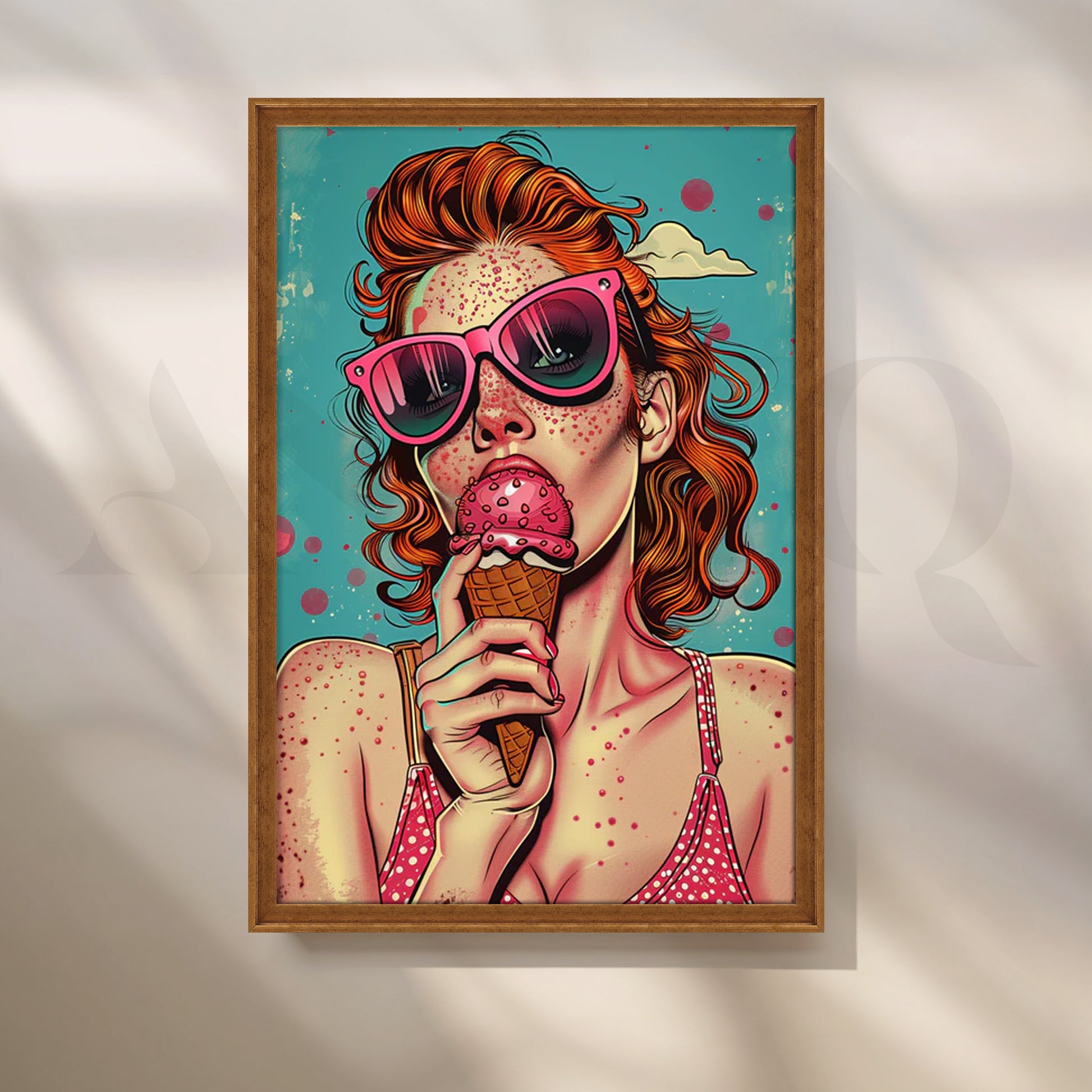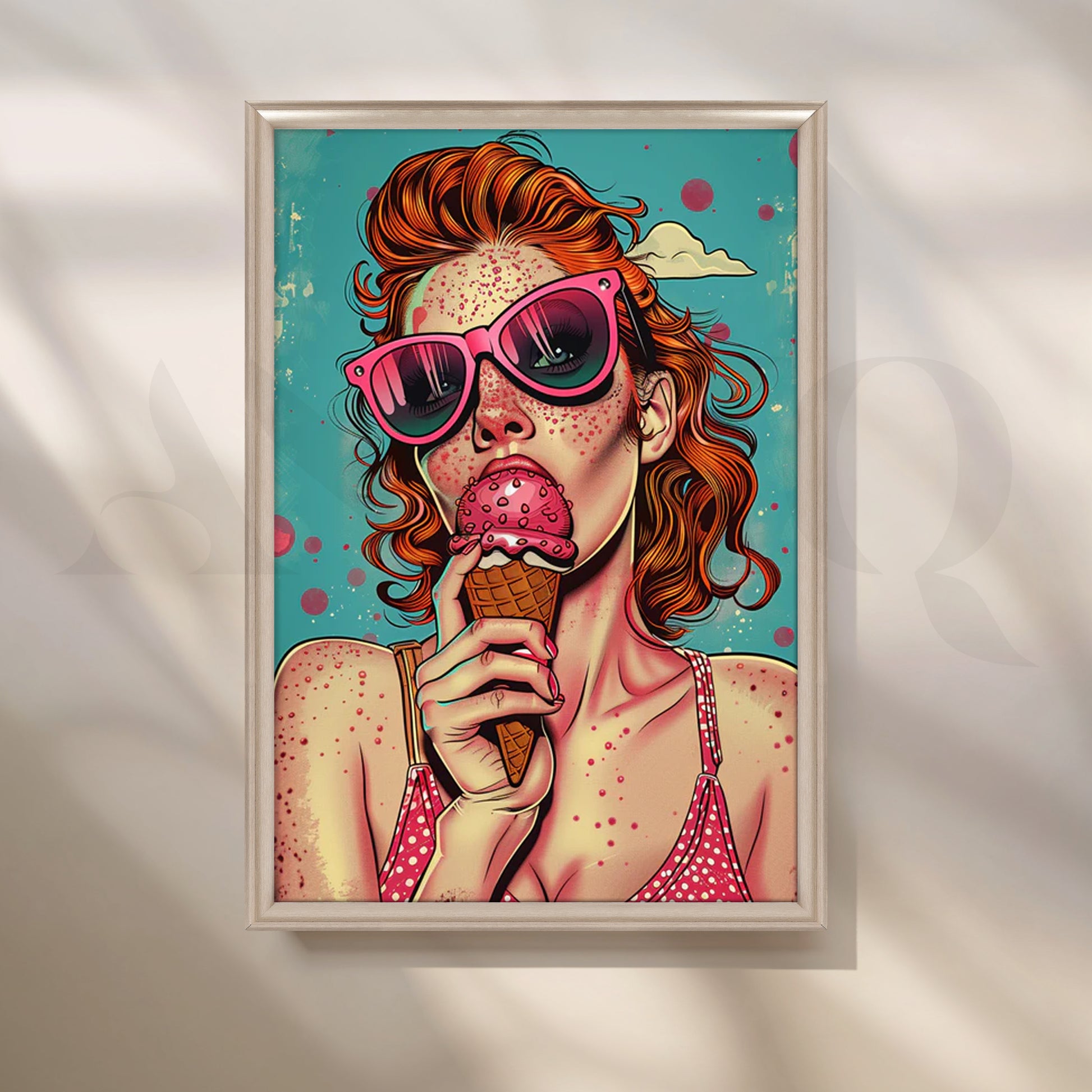 A fizzy blast of retro-cool: teal sky, bubblegum-pink sunglasses, strawberry cone, and sun-kissed freckles rendered in bold comic linework and halftone dots. This playful piece radiates beach-day nostalgia and diner-chic vibes—perfect for kitchens, cafes, game rooms, dorms, or any space that craves color and fun. Crisp outlines, saturated pinks and aquas, and a cheeky summertime attitude make it an instant statement. Keywords: summer pop art print, ice cream wall art, retro comic poster, teal pink decor, freckled girl canvas, vintage pin-up style illustration, kitchen cafe artwork, playful modern wall decor, sunny beach vibe art, colorful graphic portrait.