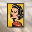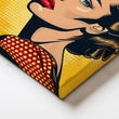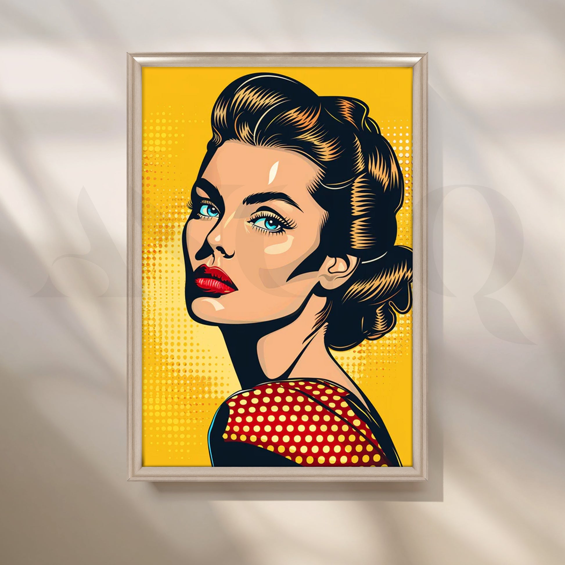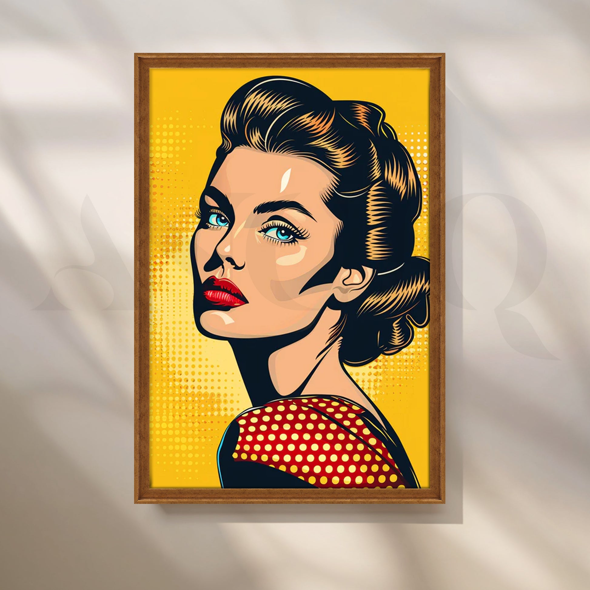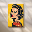 Striking pop-art portrait of a retro beauty—teal eyes, red lips, and a polka-dot shoulder—set against a bold yellow halftone backdrop. This graphic comic-style artwork brings instant attitude to contemporary spaces. Keywords: pop art portrait, retro comic wall art, yellow wall decor, polka dot poster, bold graphic canvas, modern living room artwork, statement pop painting.