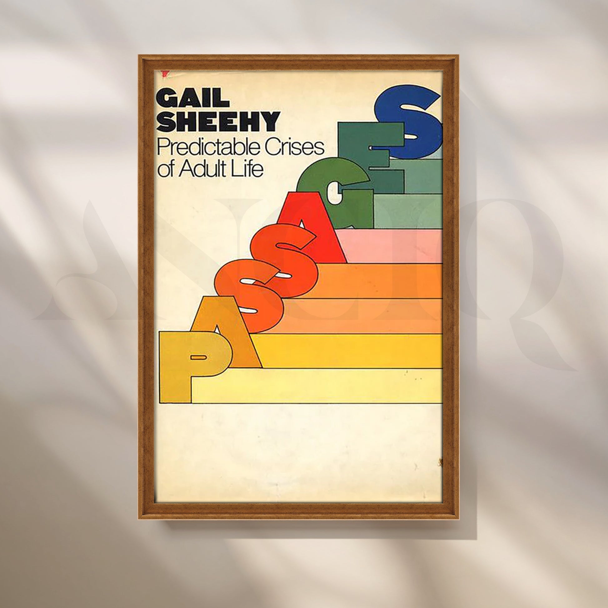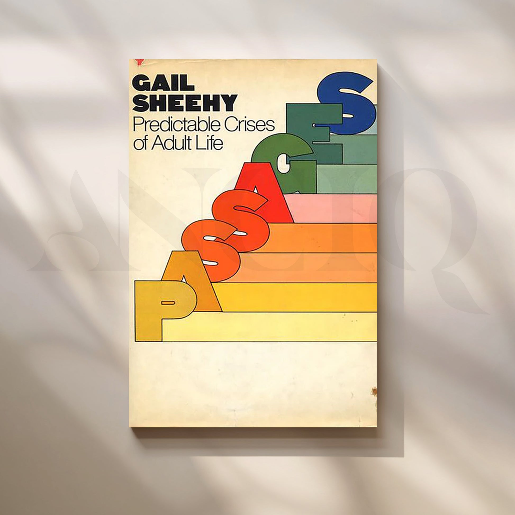 Iconic 1970s graphic design: the word “PASSAGES” climbs a stair-step rainbow from mustard to marine against a creamy, time-worn field. Bold sans-serif typography and warm retro hues turn this classic self-development cover into mid-century modern wall art—perfect for libraries, studies, counseling spaces, or anyone who loves vintage book design. Faithful, high-resolution reproduction with subtle patina preserves the original’s charm and symbolism of growth through life stages.