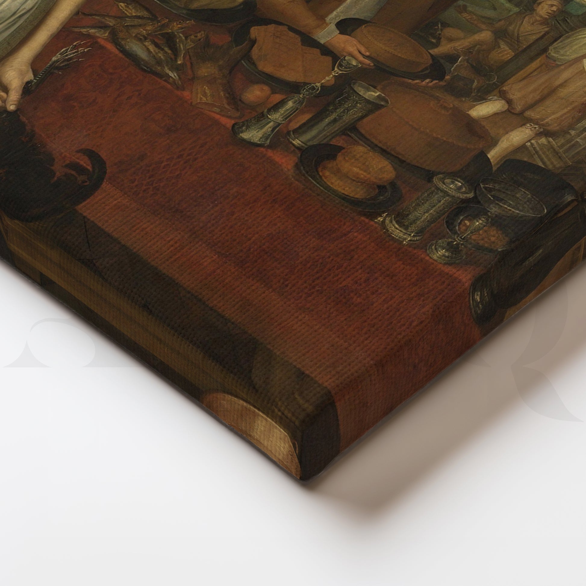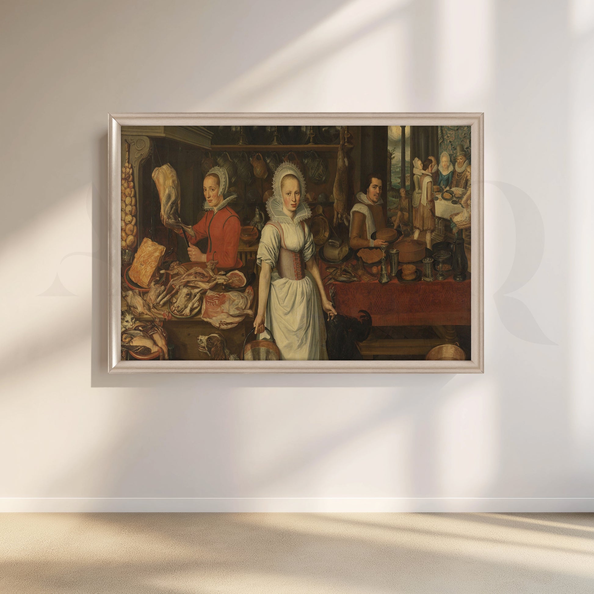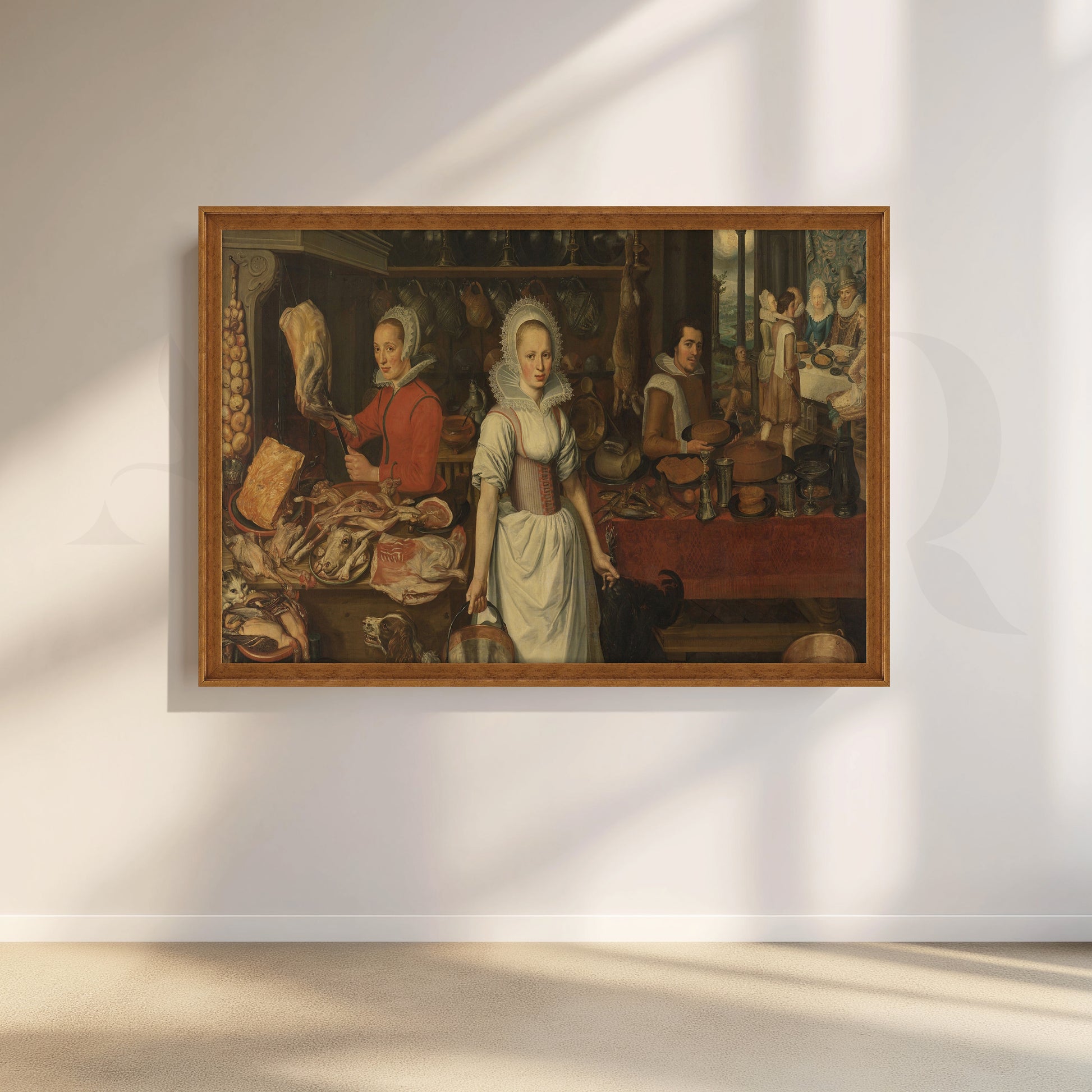 Having a piece of history. This beautiful painting is a detailed kitchen scene, filled with religious symbolism from the parable of the rich man and the poor Lazarus. The rich colors and exquisite detail characteristic of Dutch Golden Age painting bring this art to life.