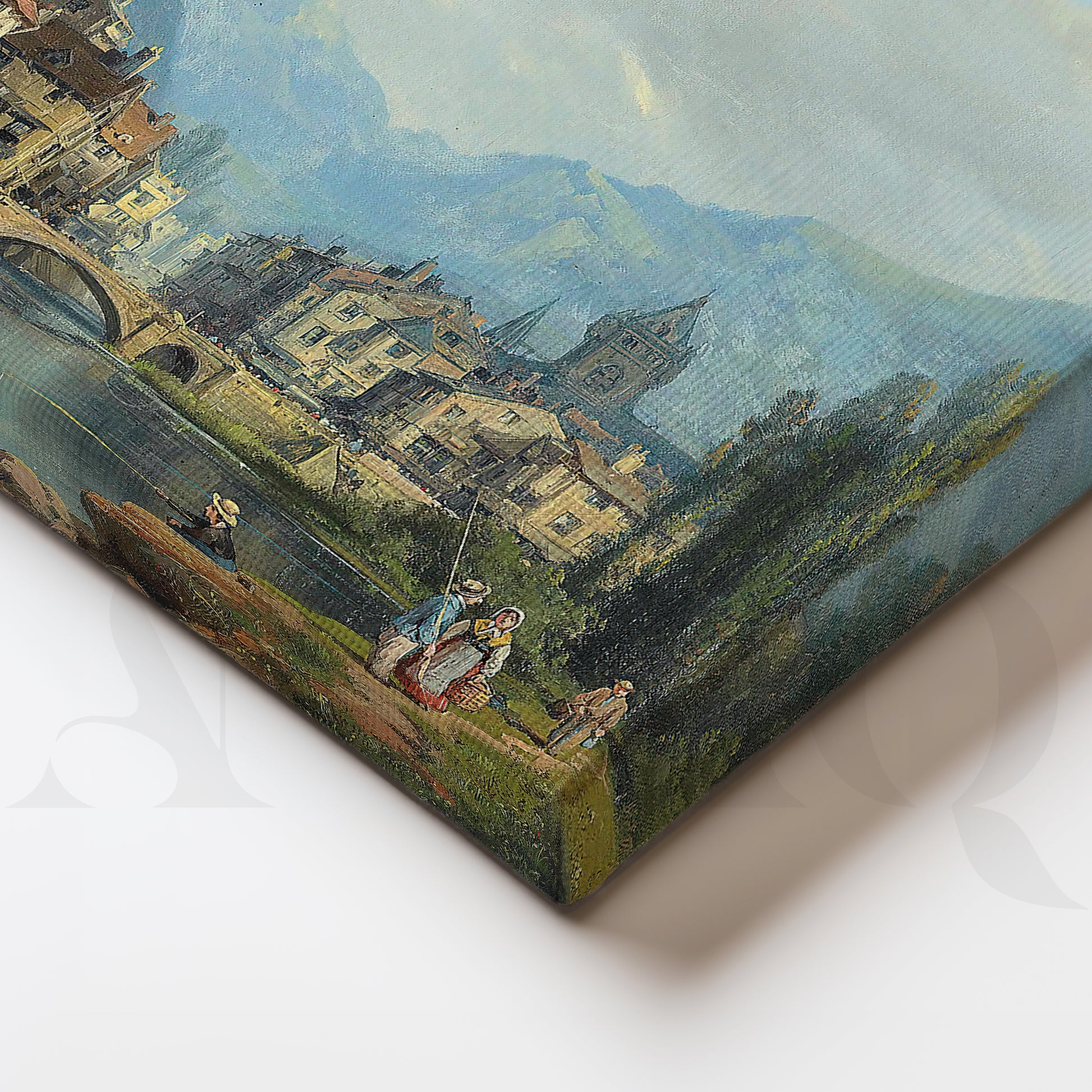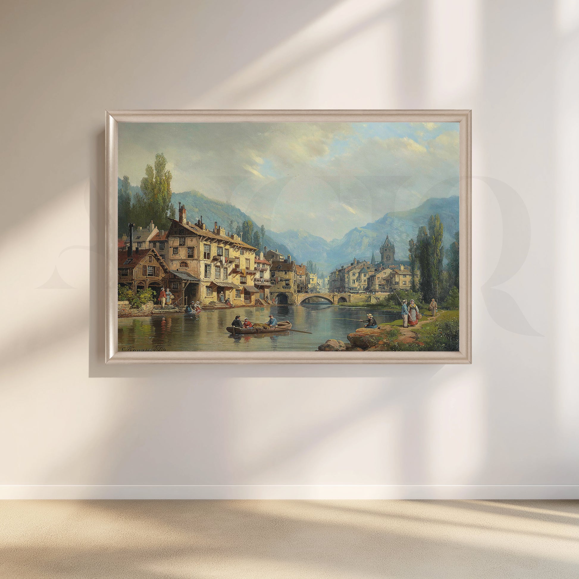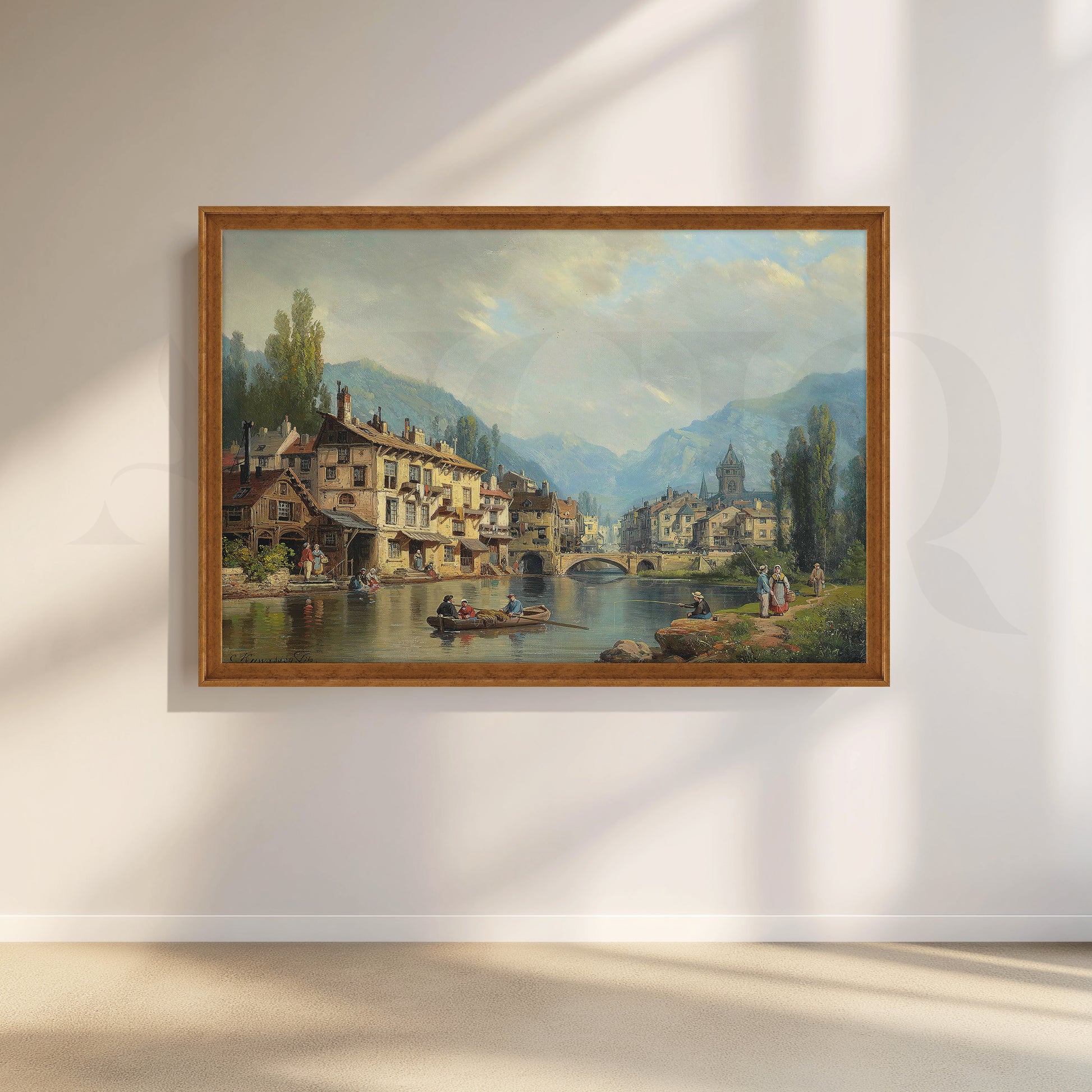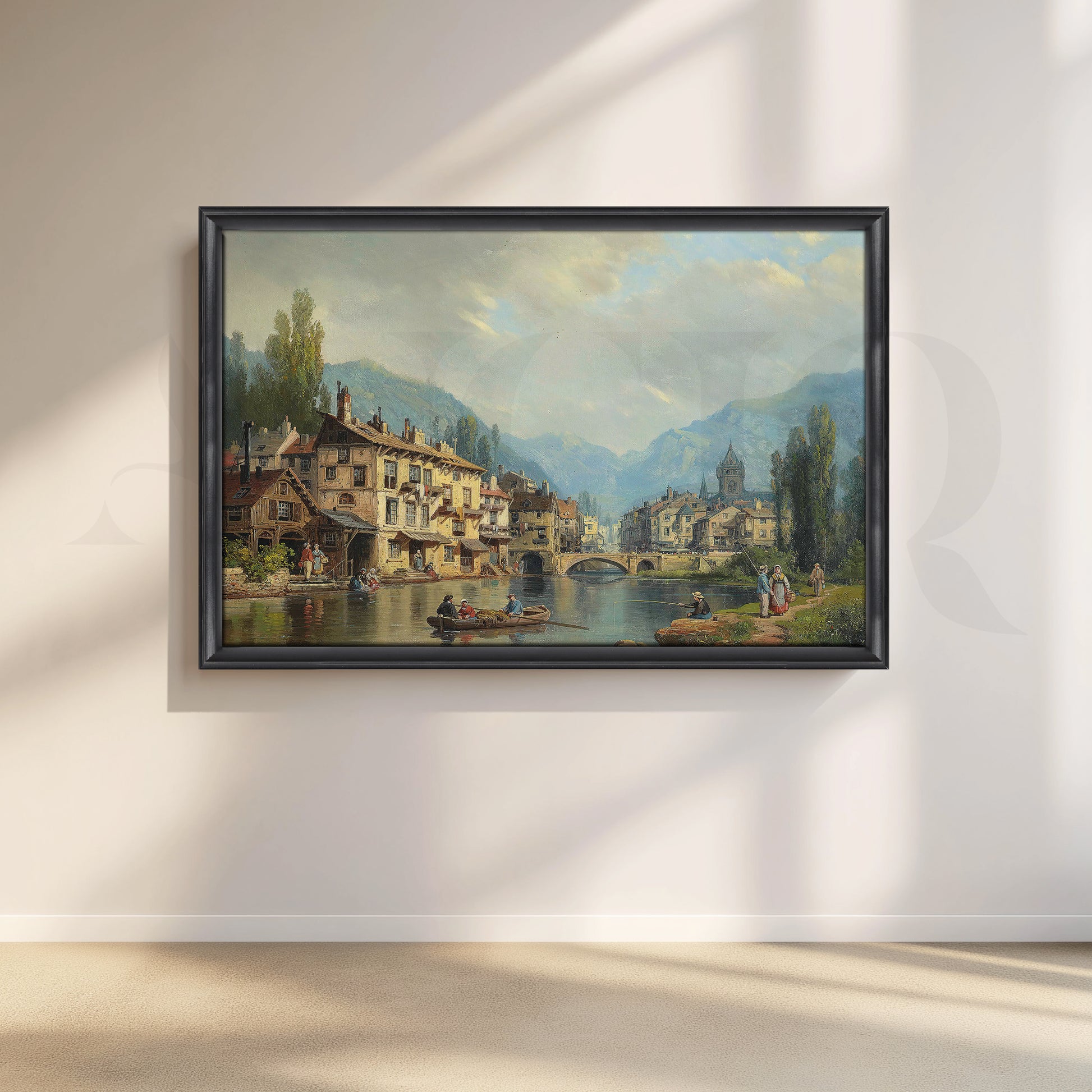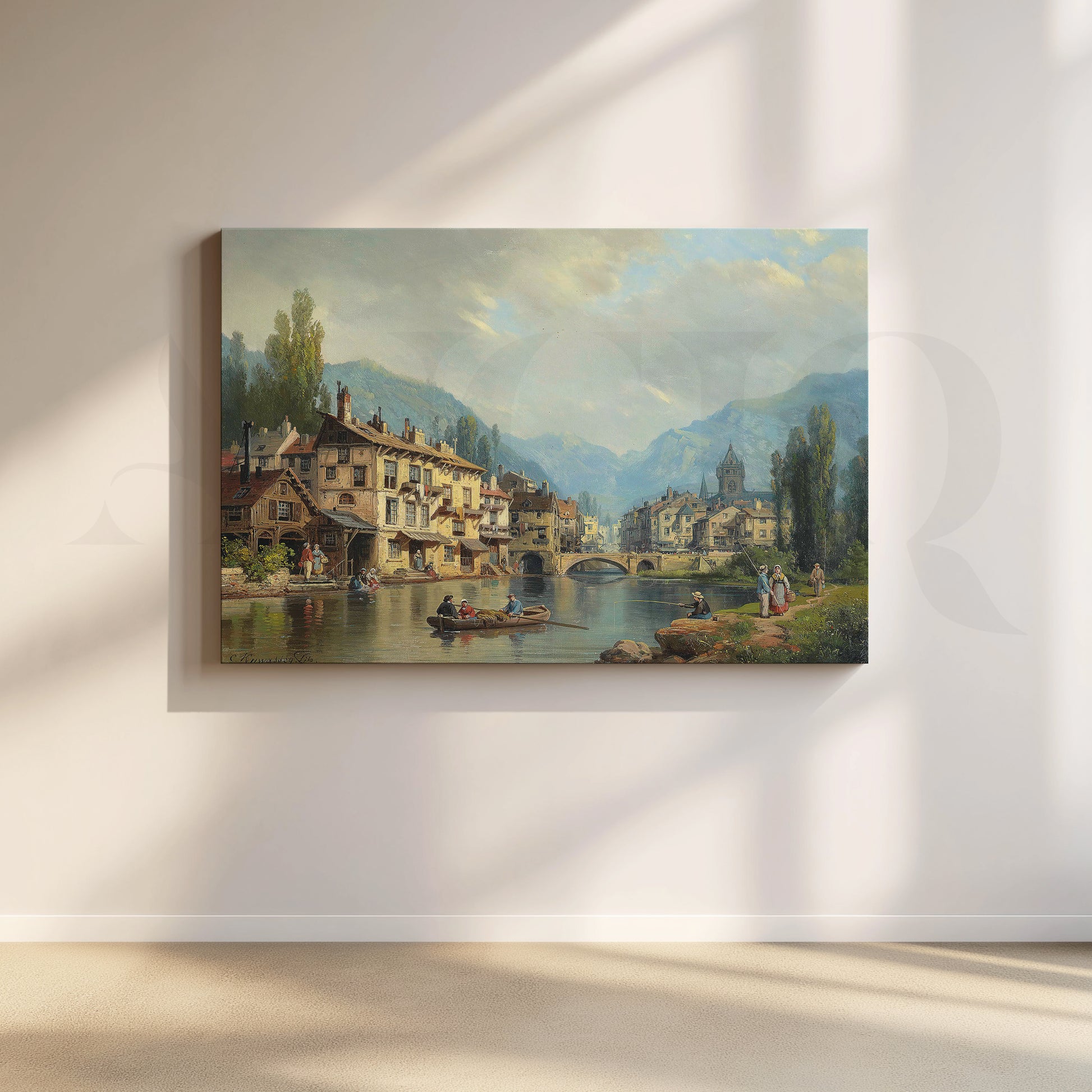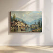 Bring old-world charm to your walls with this riverside European town canvas artwork. Quaint houses, boats and distant mountains create a calm, storybook landscape. Perfect as living room wall art, bedroom décor or office statement piece for those who love travel, vintage cityscapes and scenic canvas artwork.