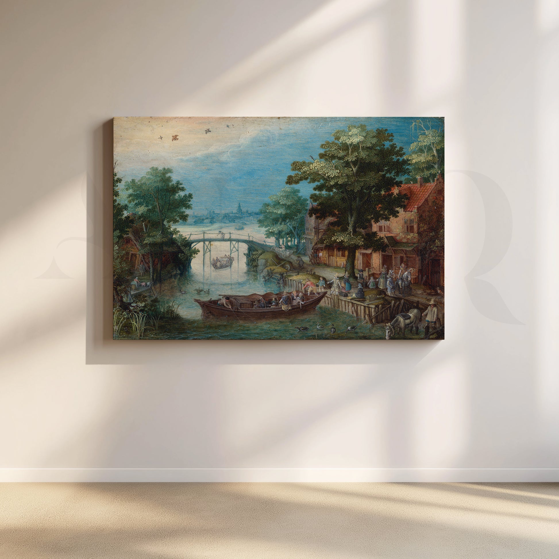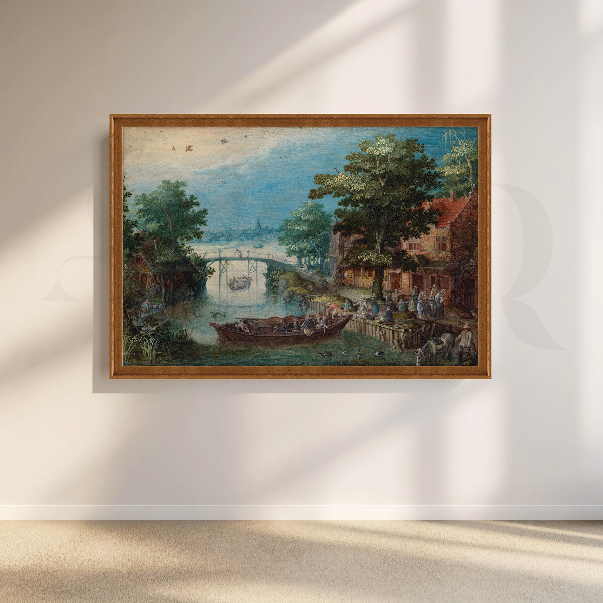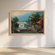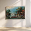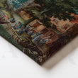 This riverside village boats canvas artwork features a busy canal scene with wooden houses, trees and gently gliding boats. Ideal hallway or dining room wall art, it adds vintage European charm, detailed storytelling and soft blue-green hues to your décor, creating a welcoming focal point on any feature wall.
