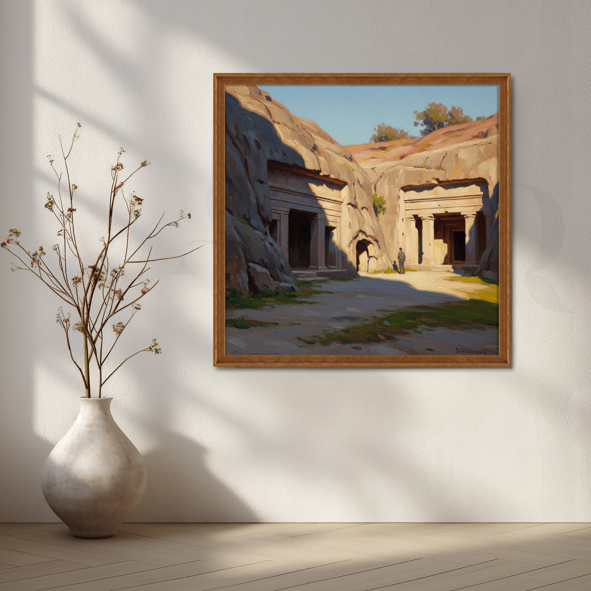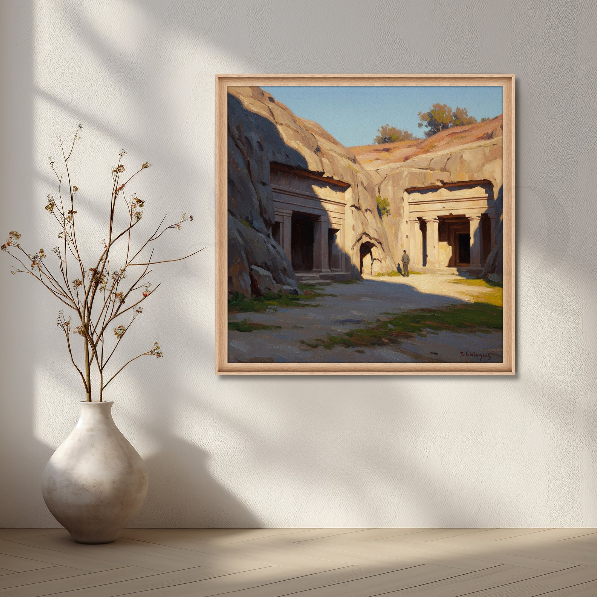 Celebrate ancient architecture with Rock-Cut Heritage Canvas Artwork, featuring serene stone temples bathed in natural sunlight. This artwork beautifully combines historical charm and peaceful tones, ideal for living rooms, study spaces, or gallery walls seeking a touch of cultural depth.