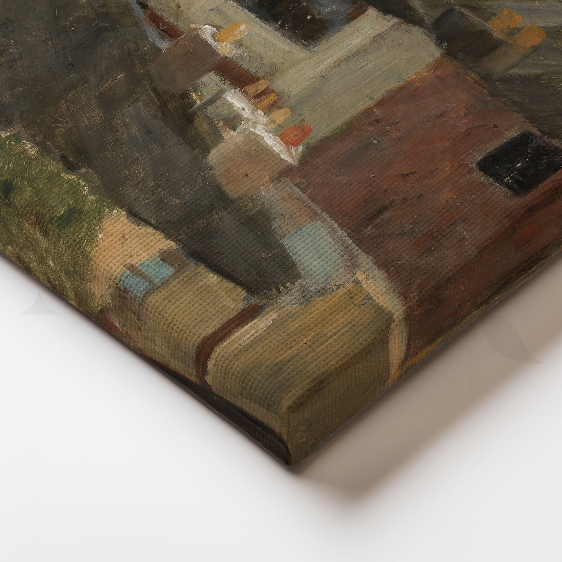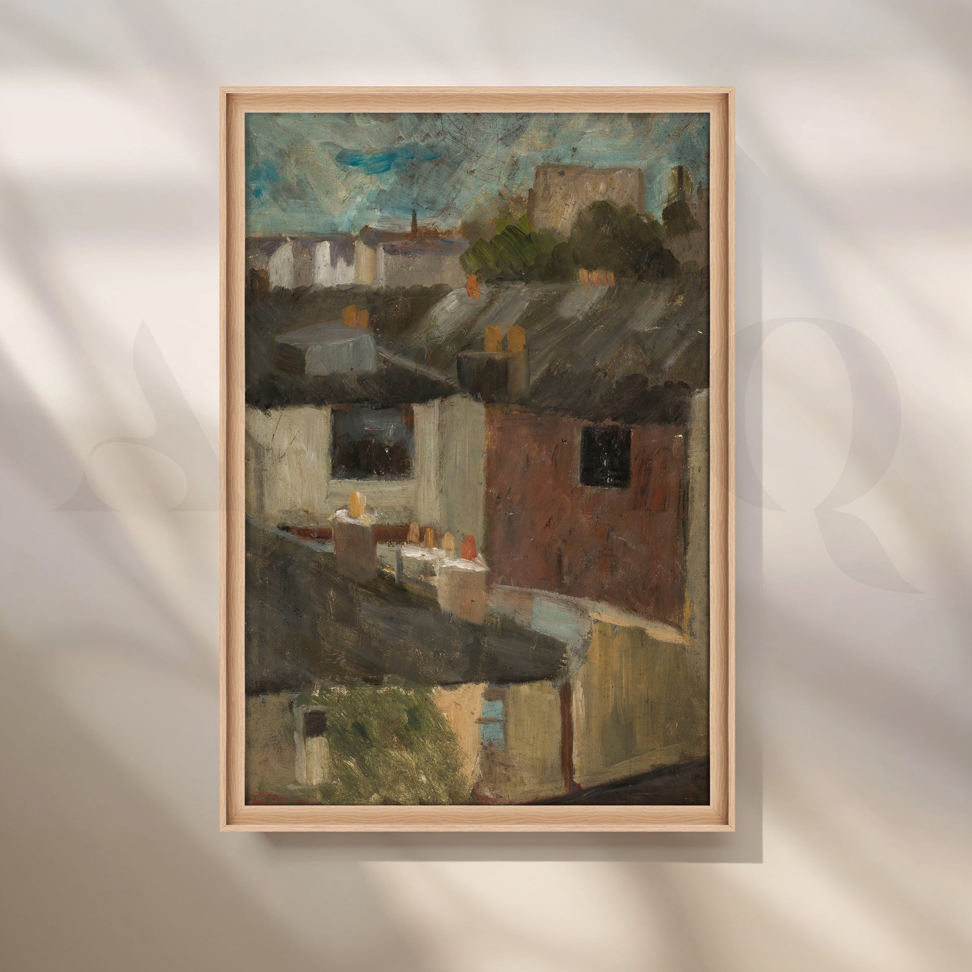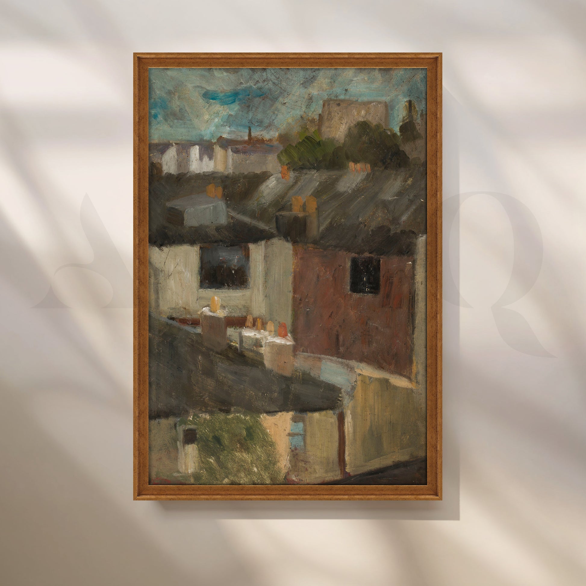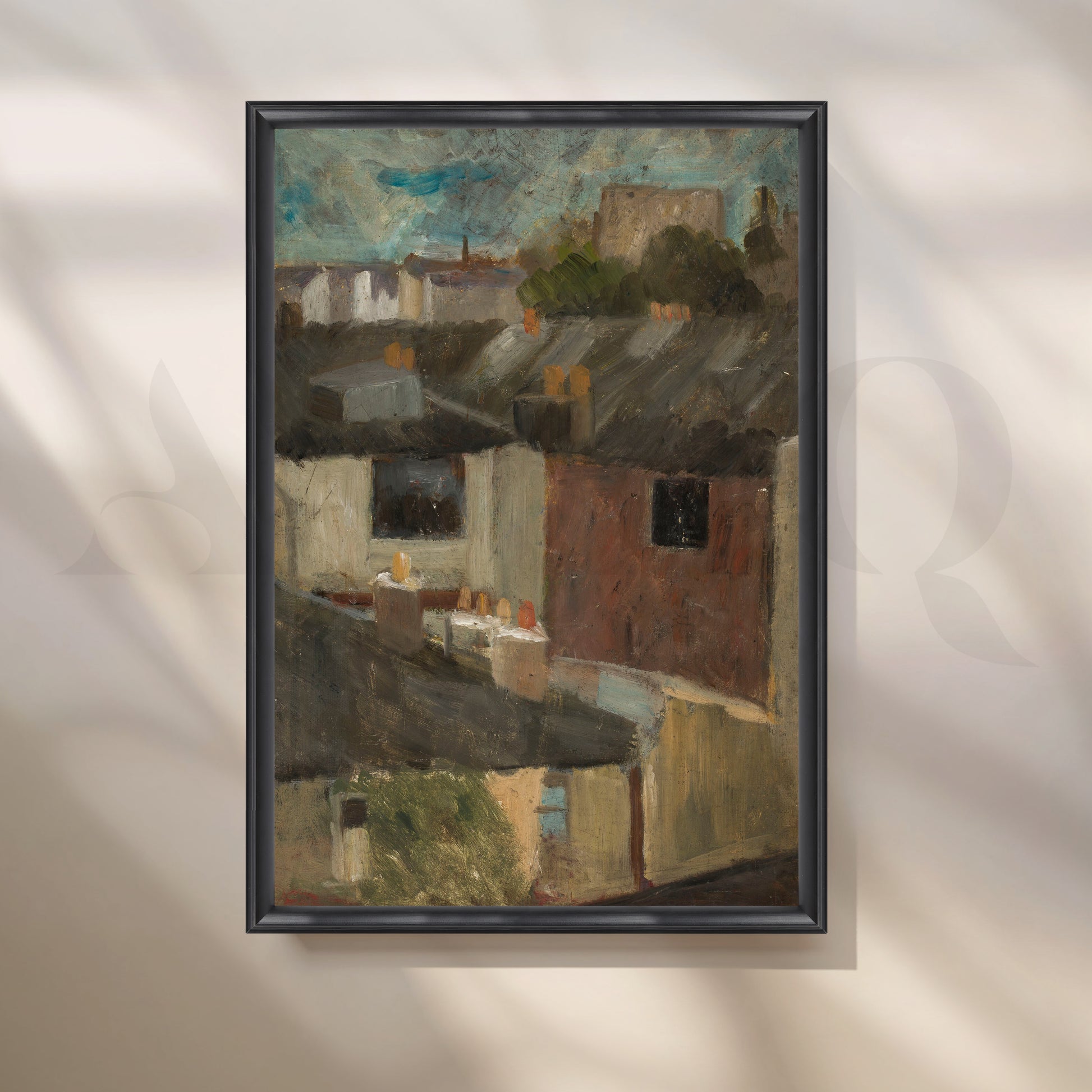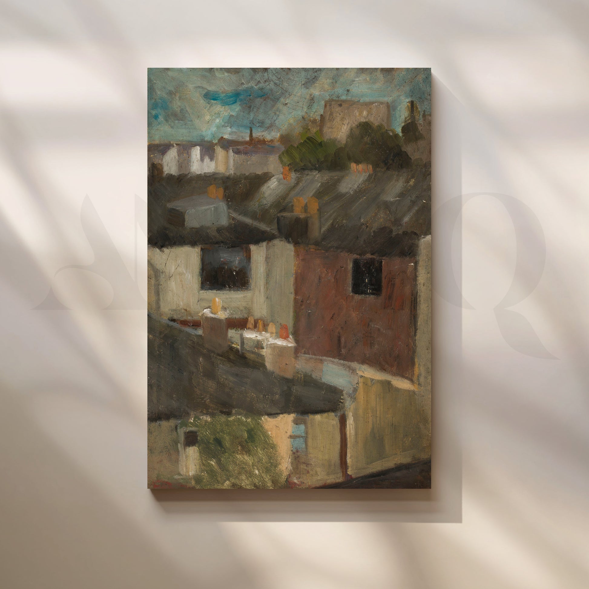 An intimate view across weathered rooftops captures the quiet poetry of the city at day’s end—earthy reds, slate greys and soft sky blues rendered in rich, layered brushwork. Perfect for lofts, hallways, living rooms or home offices seeking a sophisticated, modern cityscape. Keywords: urban landscape canvas, European rooftops painting, neutral wall art, contemporary city print, modern hallway decor, townhouse living room art.