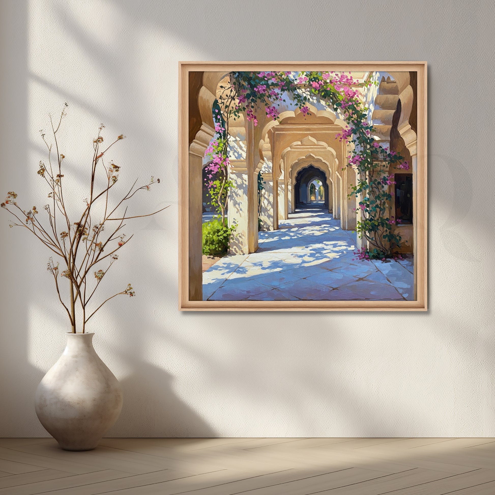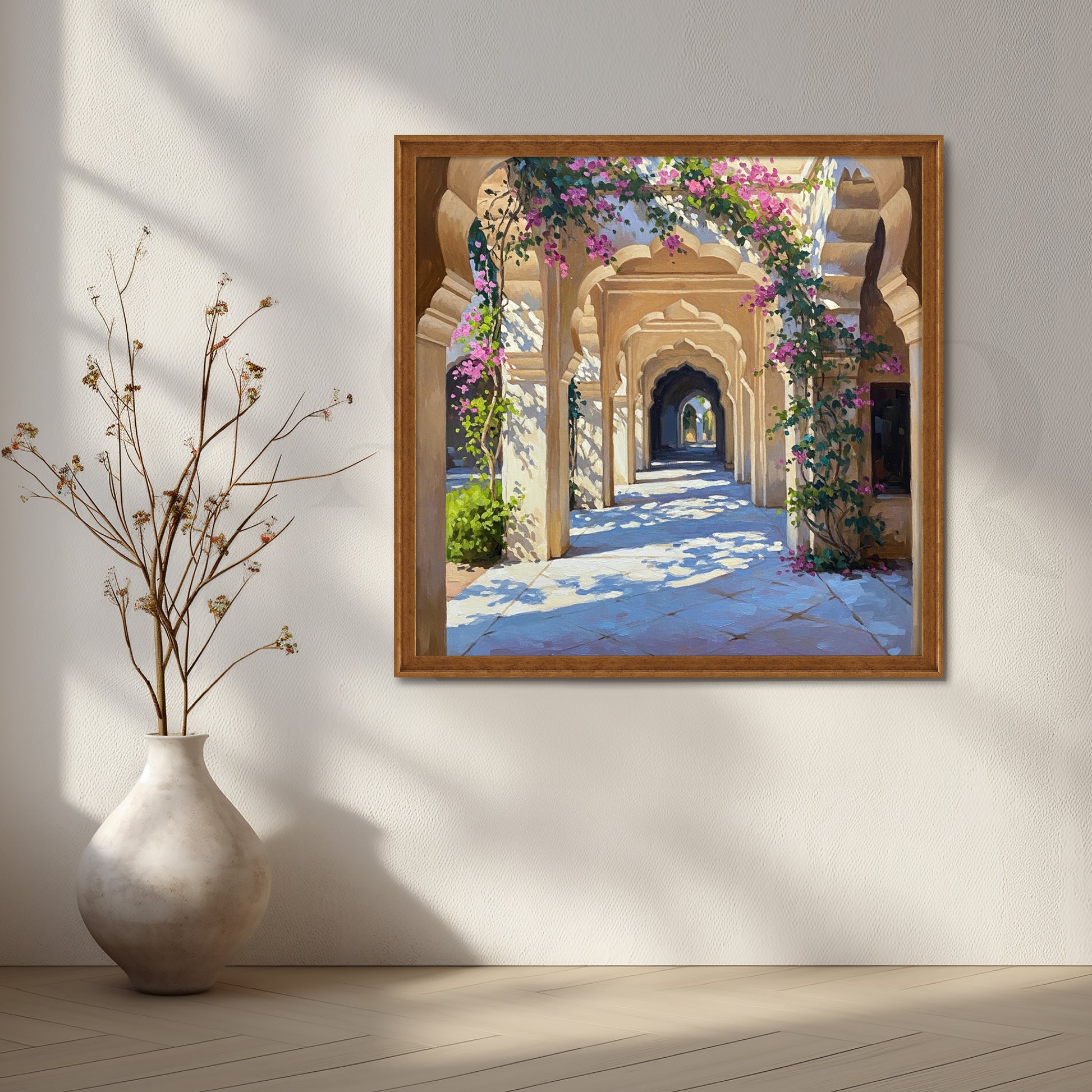 Experience royal elegance with Royal Archway Garden Canvas Artwork. Sunlit arches, intricate stone corridors, and blooming vines create a luxurious and peaceful ambiance. A perfect statement piece for hallways, offices, or interiors inspired by Indian heritage and architecture.
