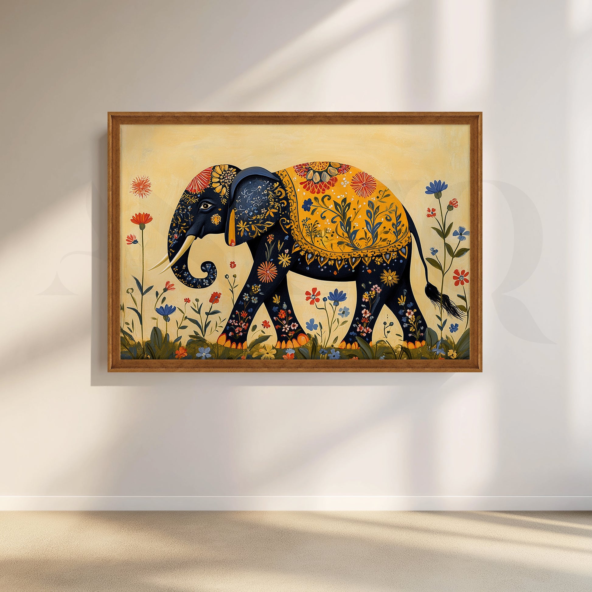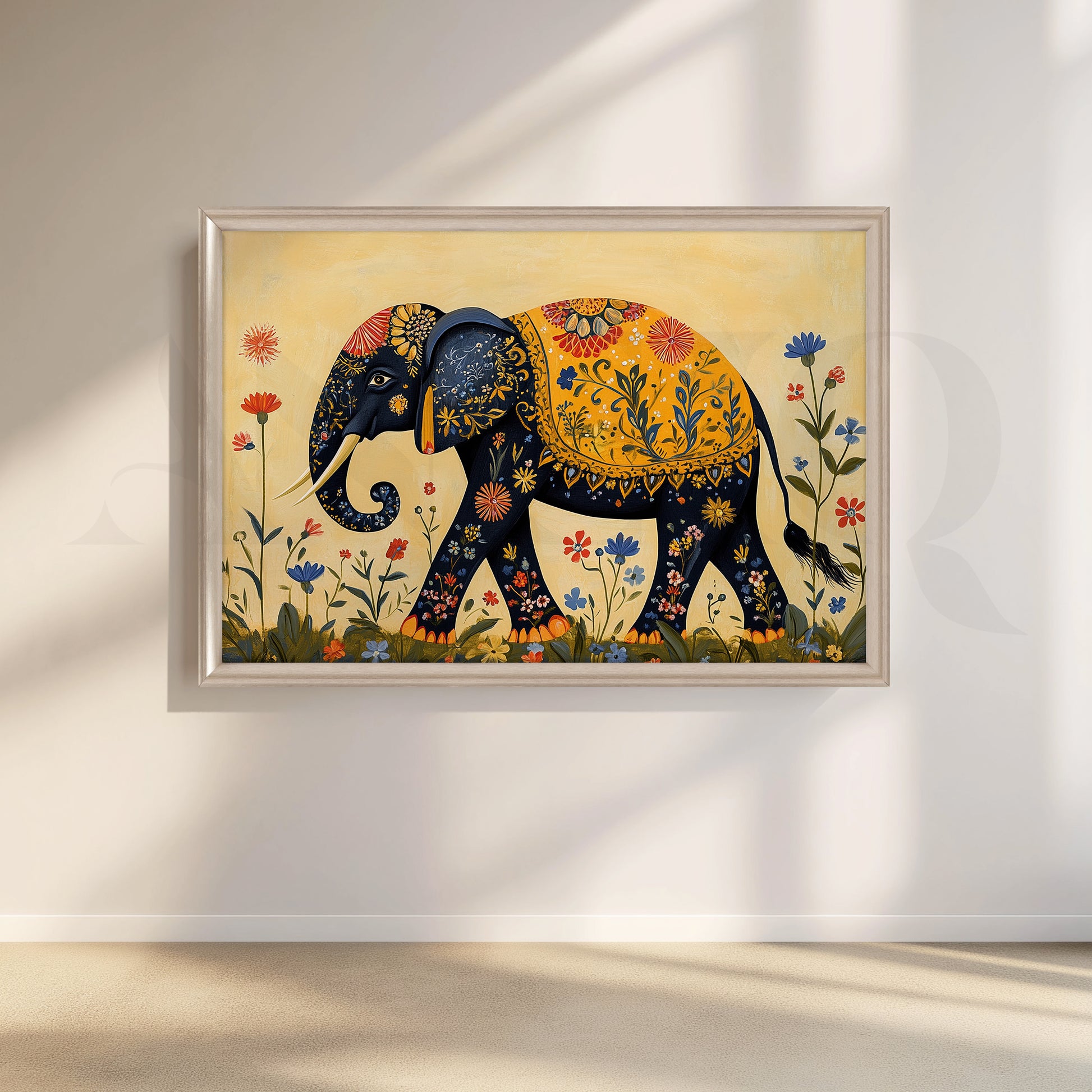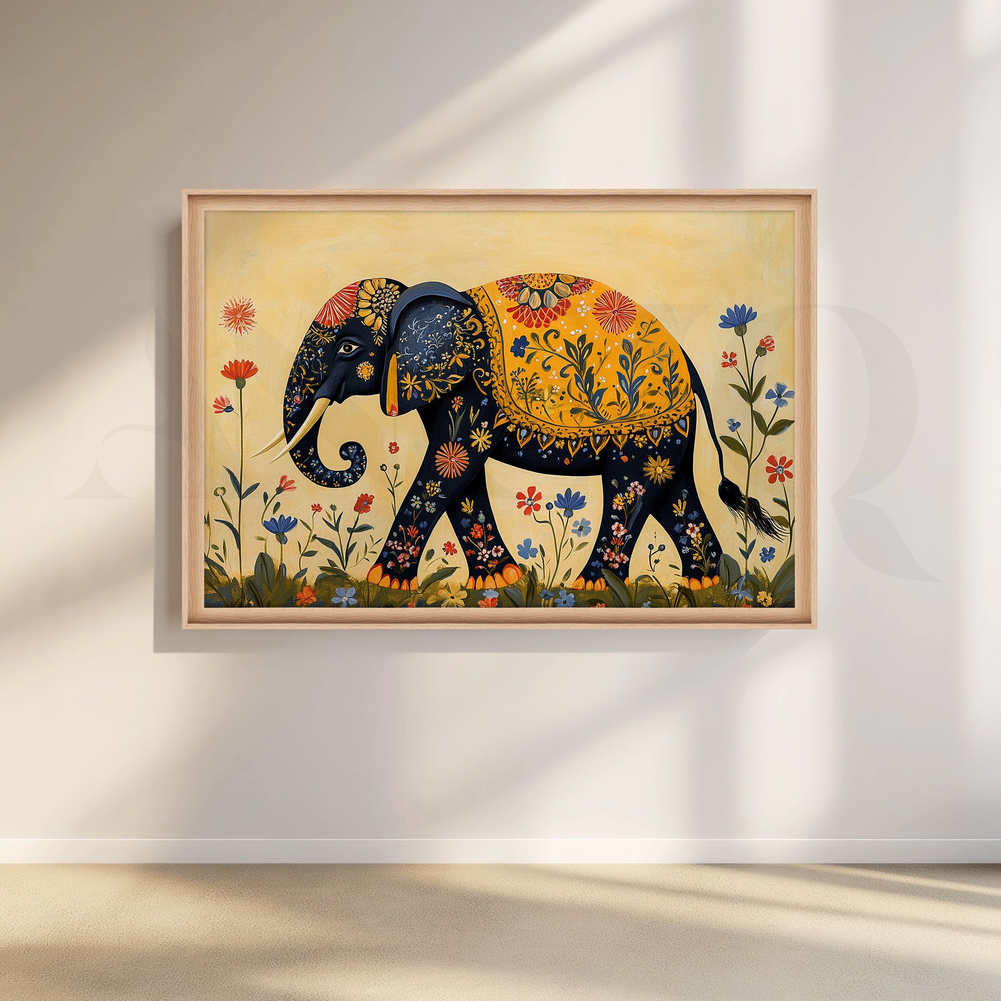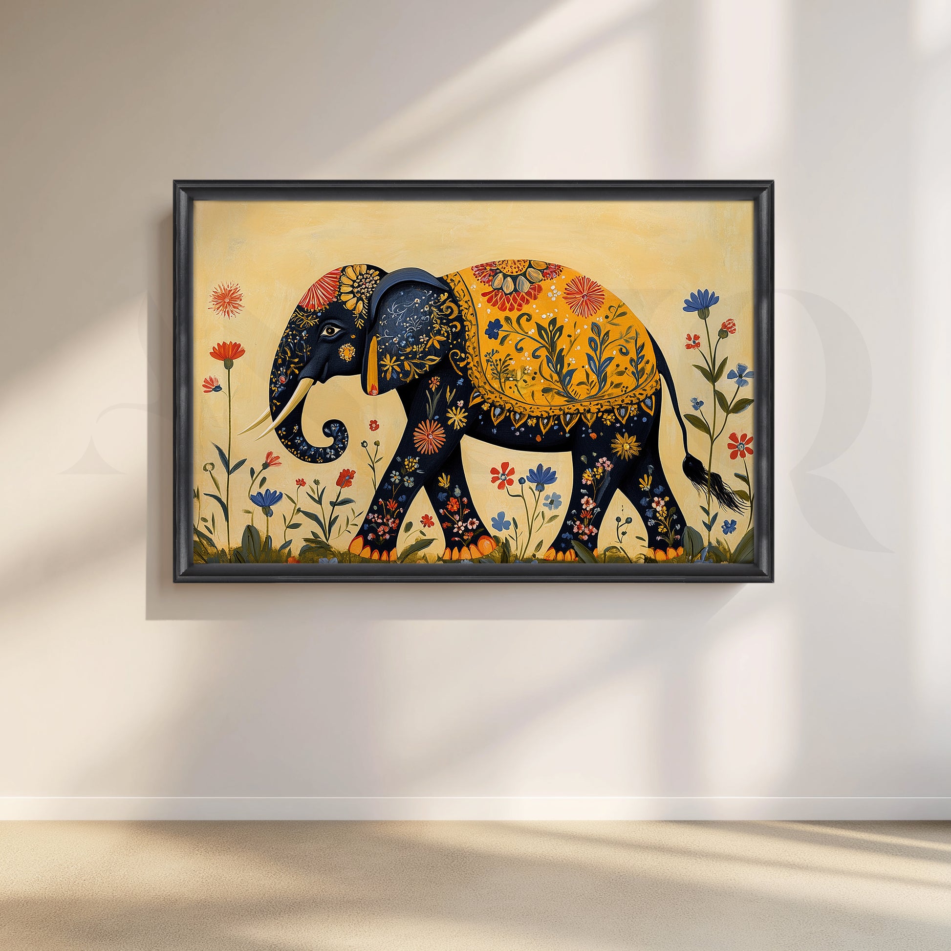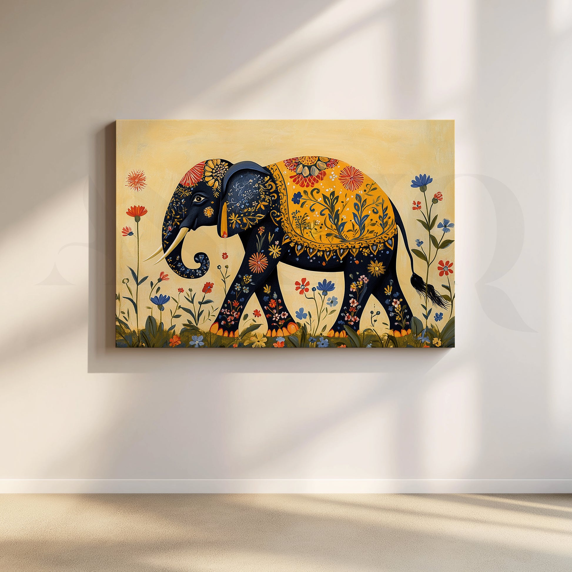 Royal Floral Elephant Indian Canvas Wall Art depicts a richly adorned elephant walking through a meadow of colourful flowers on a soft yellow backdrop. This detailed ethnic painting brings a regal, heritage touch to living rooms, entryways and dining spaces.