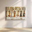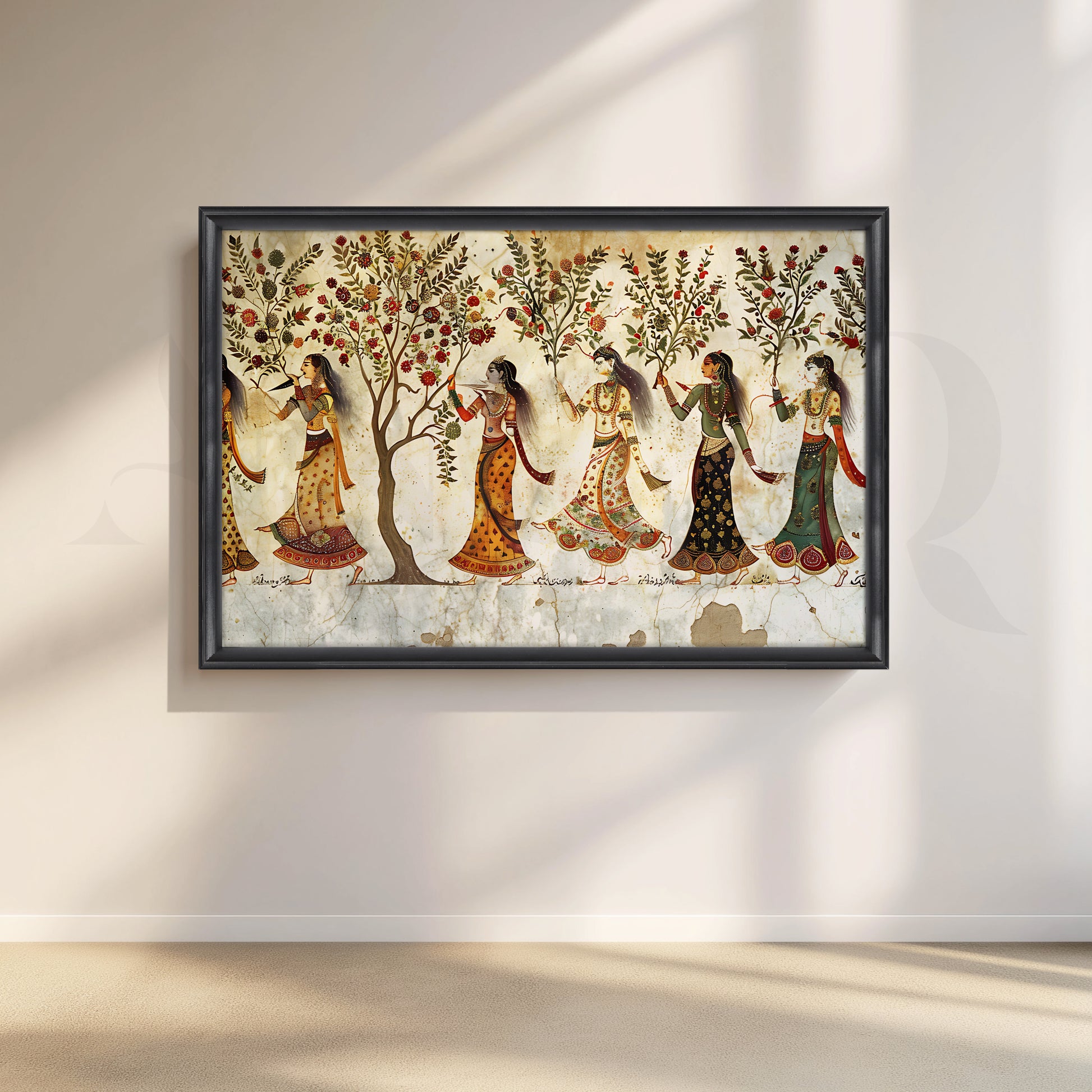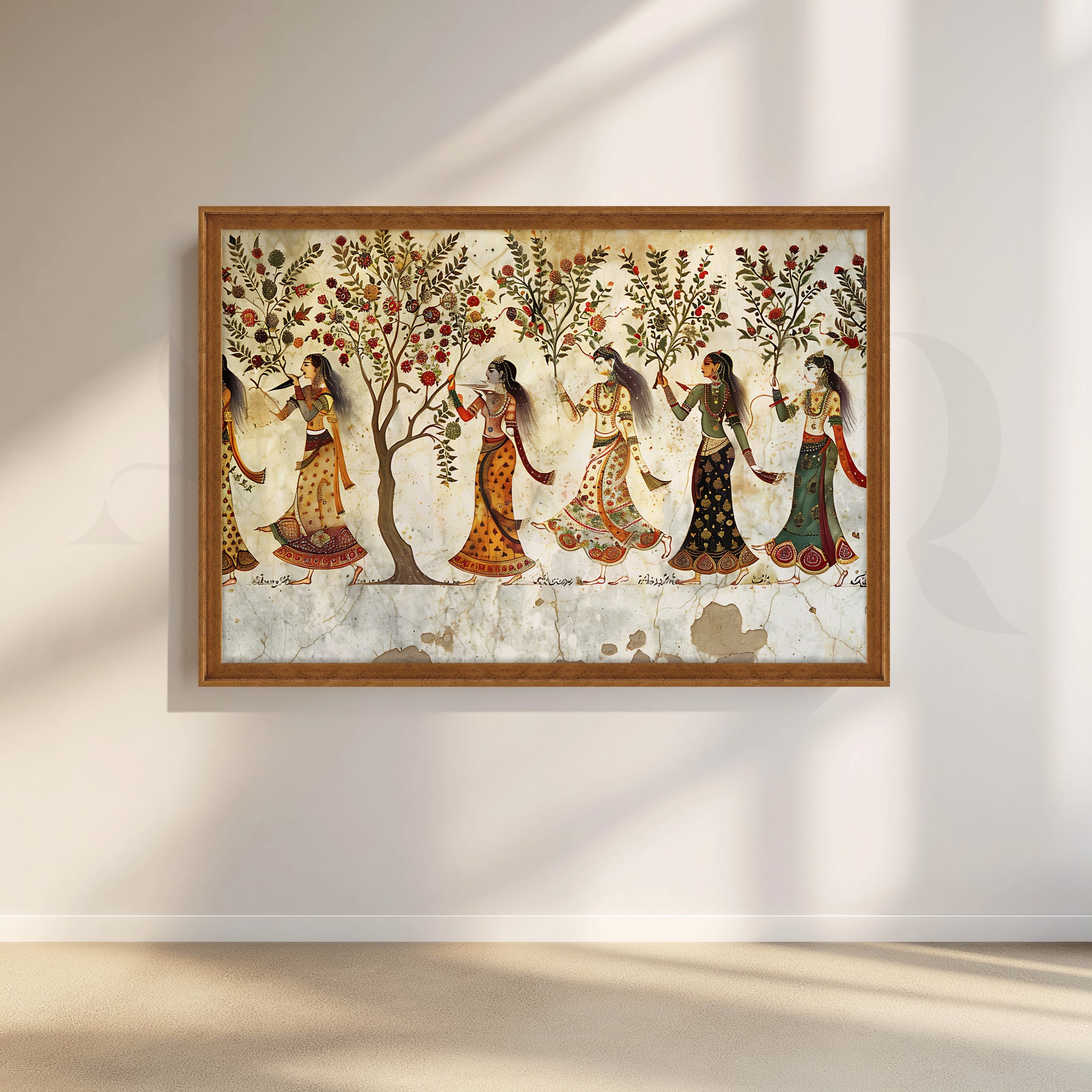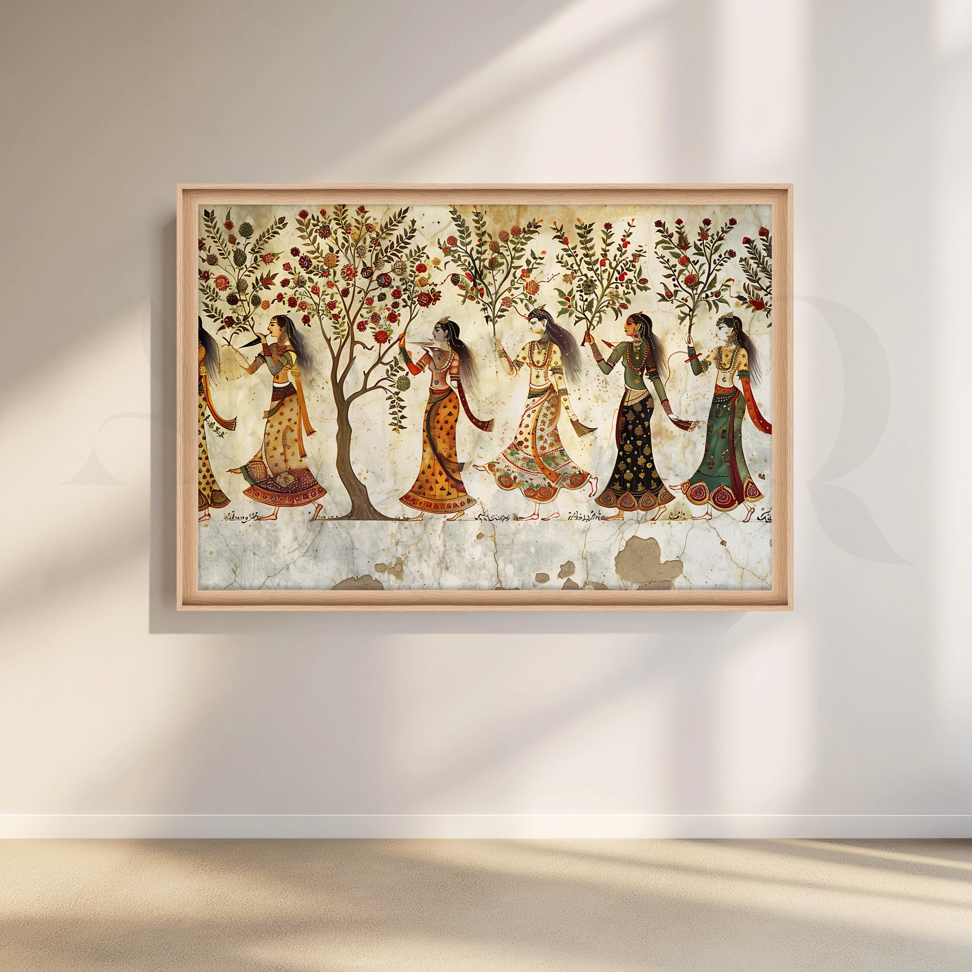 Celebrate timeless Indian heritage with this canvas painting depicting graceful royal women gathering in a blooming orchard. The traditional attire, earthy textures, and floral tree motifs create a vintage Rajasthani look perfect for corridor walls, entrances, or traditional spaces.