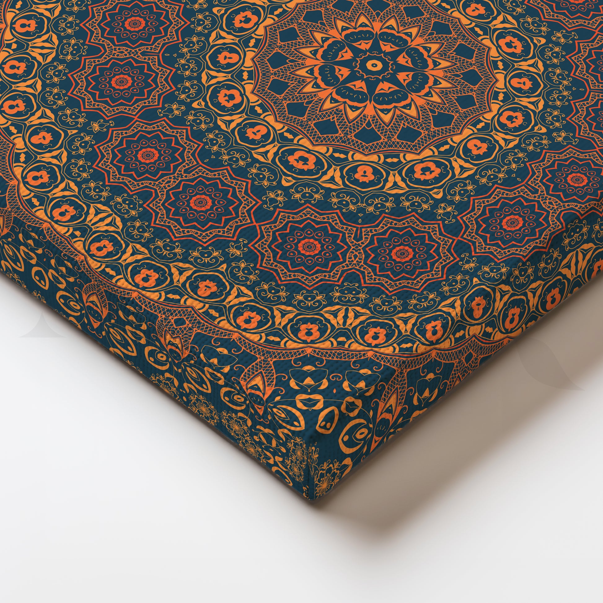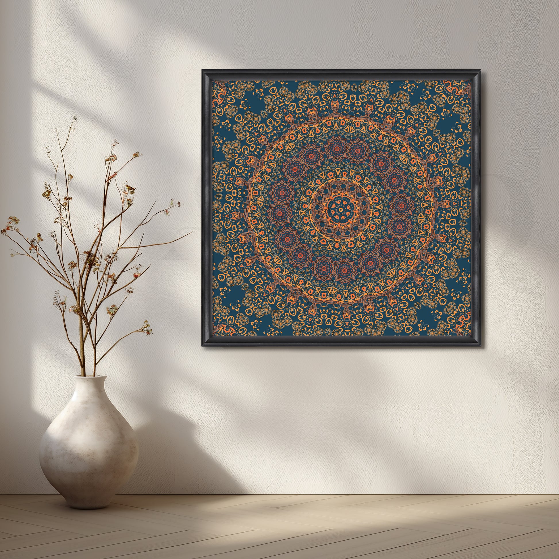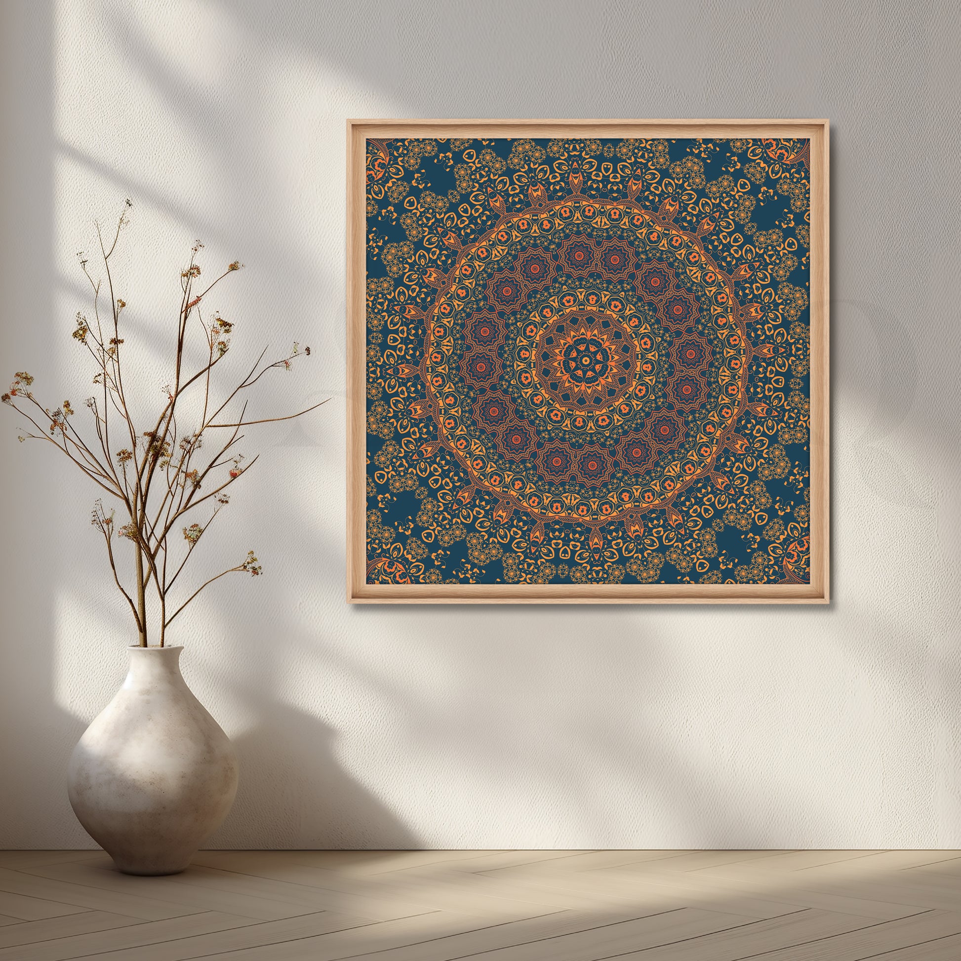This Anciq artwork showcases a regal mandala pattern in deep blue, gold, and rust tones—perfect for adding symmetry and serenity to modern living rooms or meditation spaces. Keywords: mandala wall art, bohemian pattern canvas, geometric decor, royal blue mandala painting, spiritual home art.