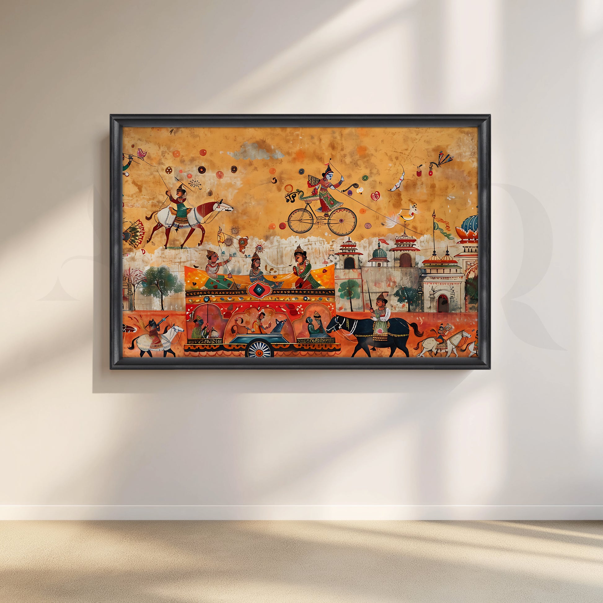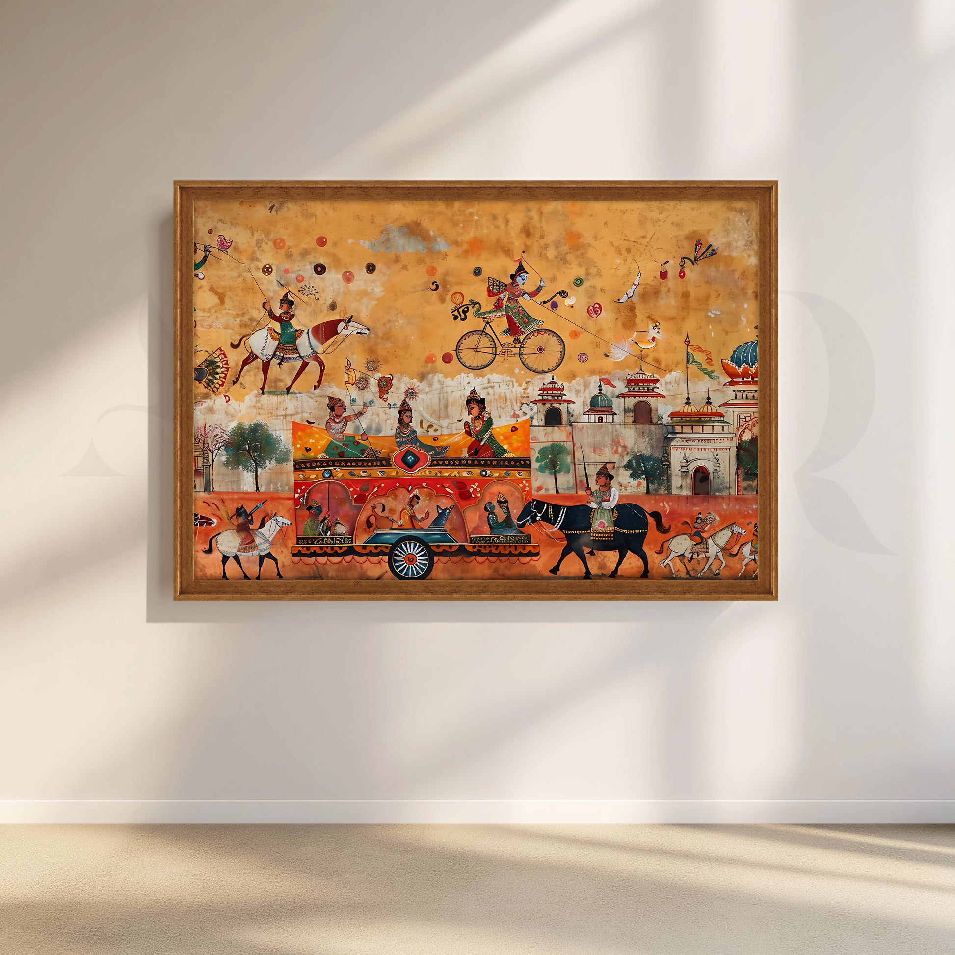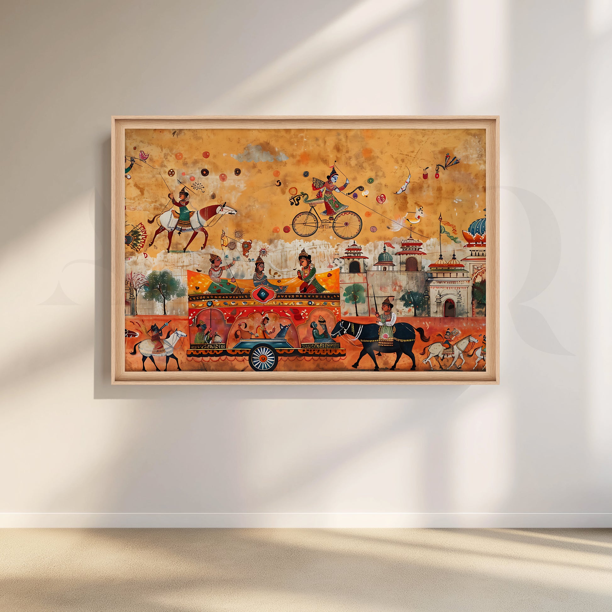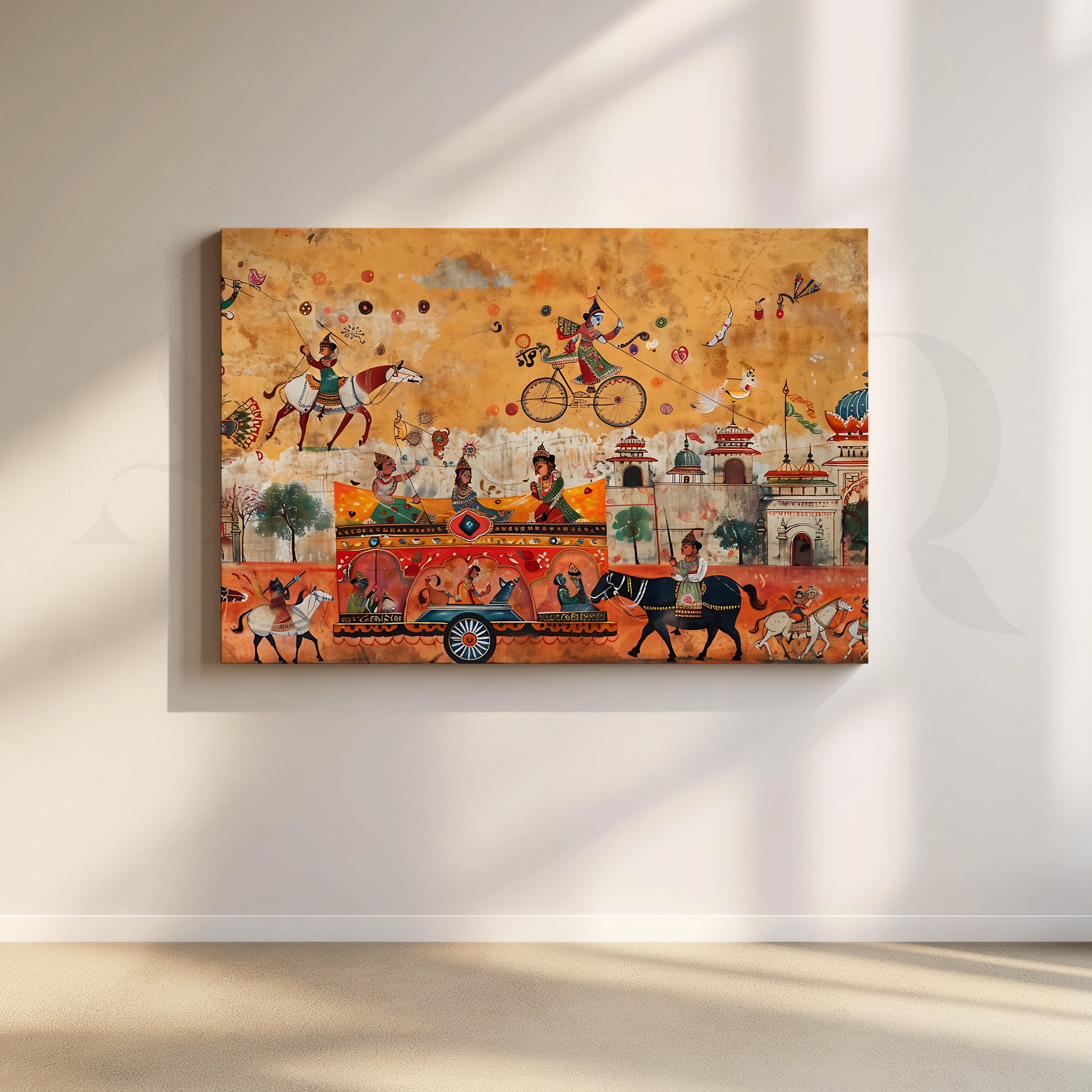 Anciq’s Royal Parade of Joy canvas artwork bursts with movement and festivity. Horses, musicians, and a grand chariot glide through a lively townscape filled with playful figures and intricate architecture, all painted in warm ochre and coral tones. Every inch tells a story of celebration and cultural pride, echoing the charm of Indian folk traditions.