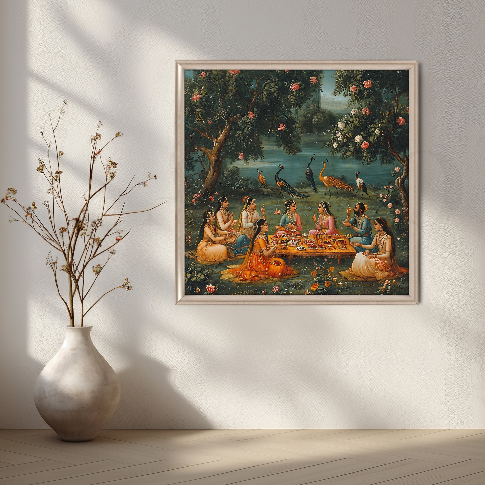 This detailed canvas artwork features elegantly dressed women enjoying a lakeside feast beneath flowering trees and surrounded by peacocks. Rich in Indian miniature style, the scene evokes leisure, culture, and harmony. Perfect for dining areas, cultural cafés, or spaces that celebrate Indian aesthetics, this painting serves as both conversation starter and artistic statement