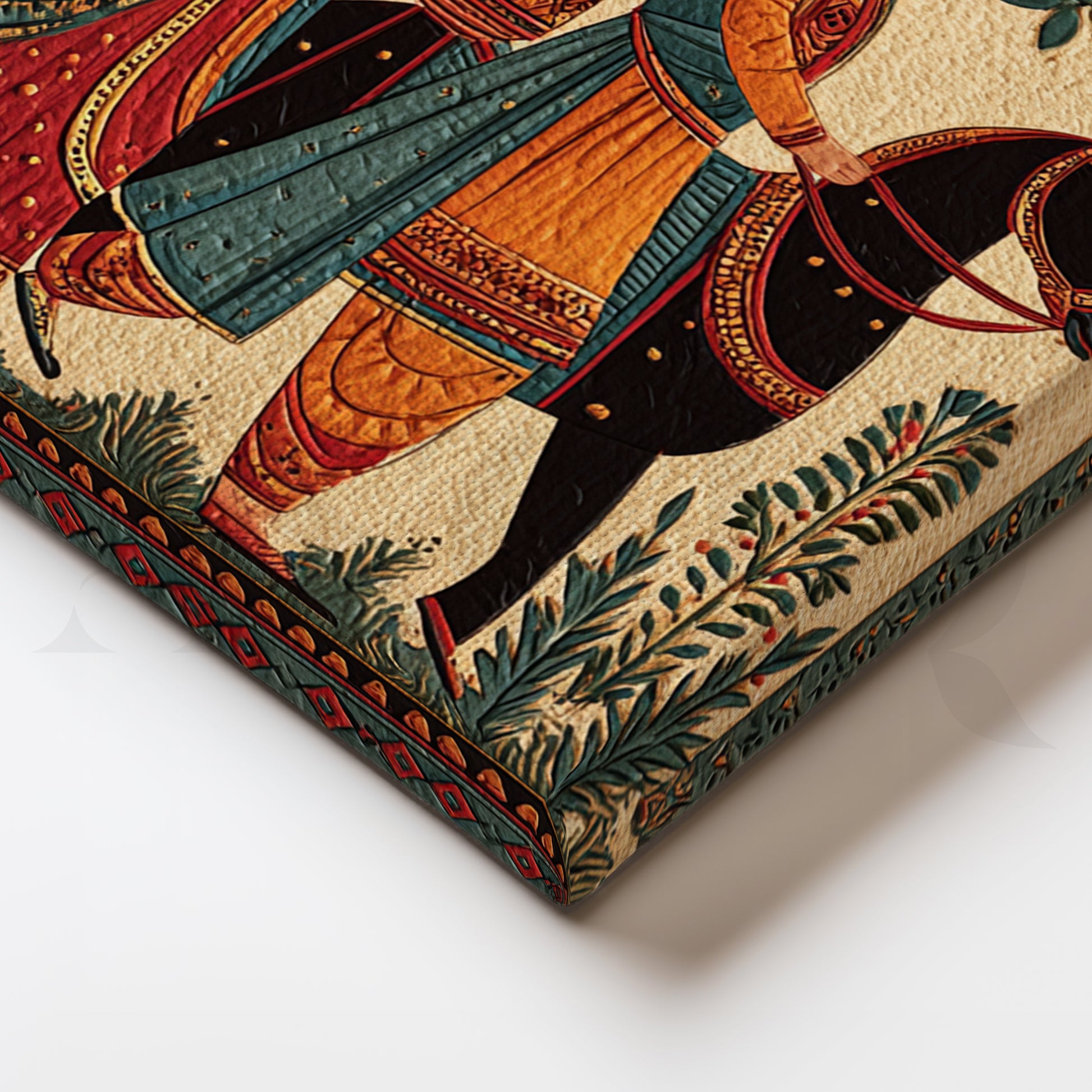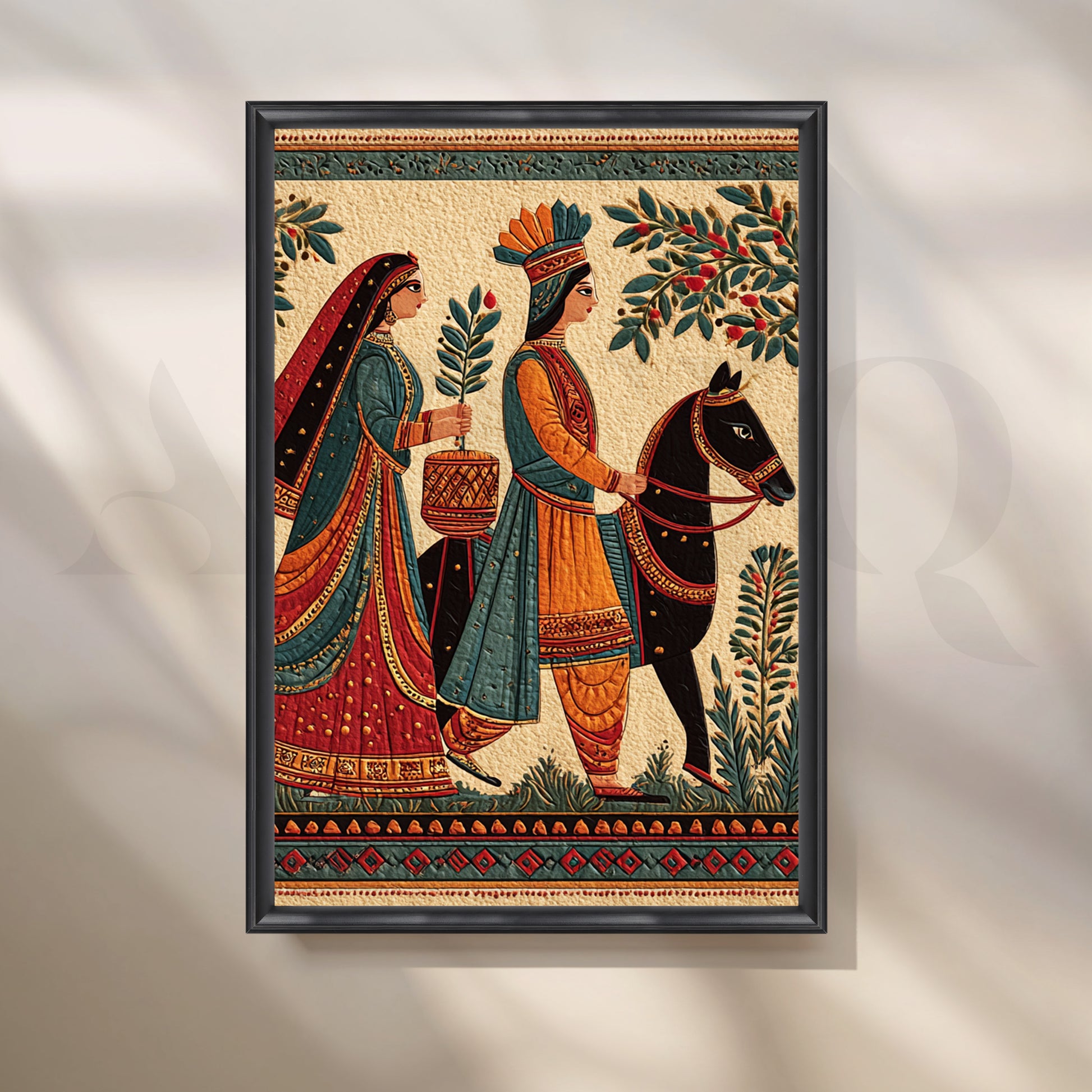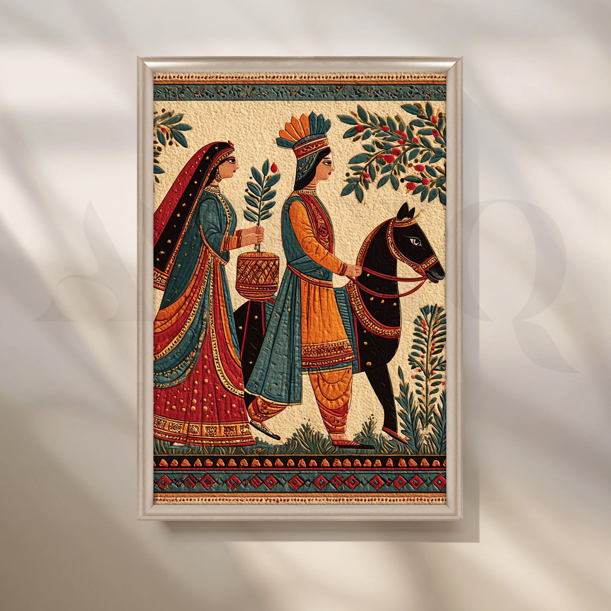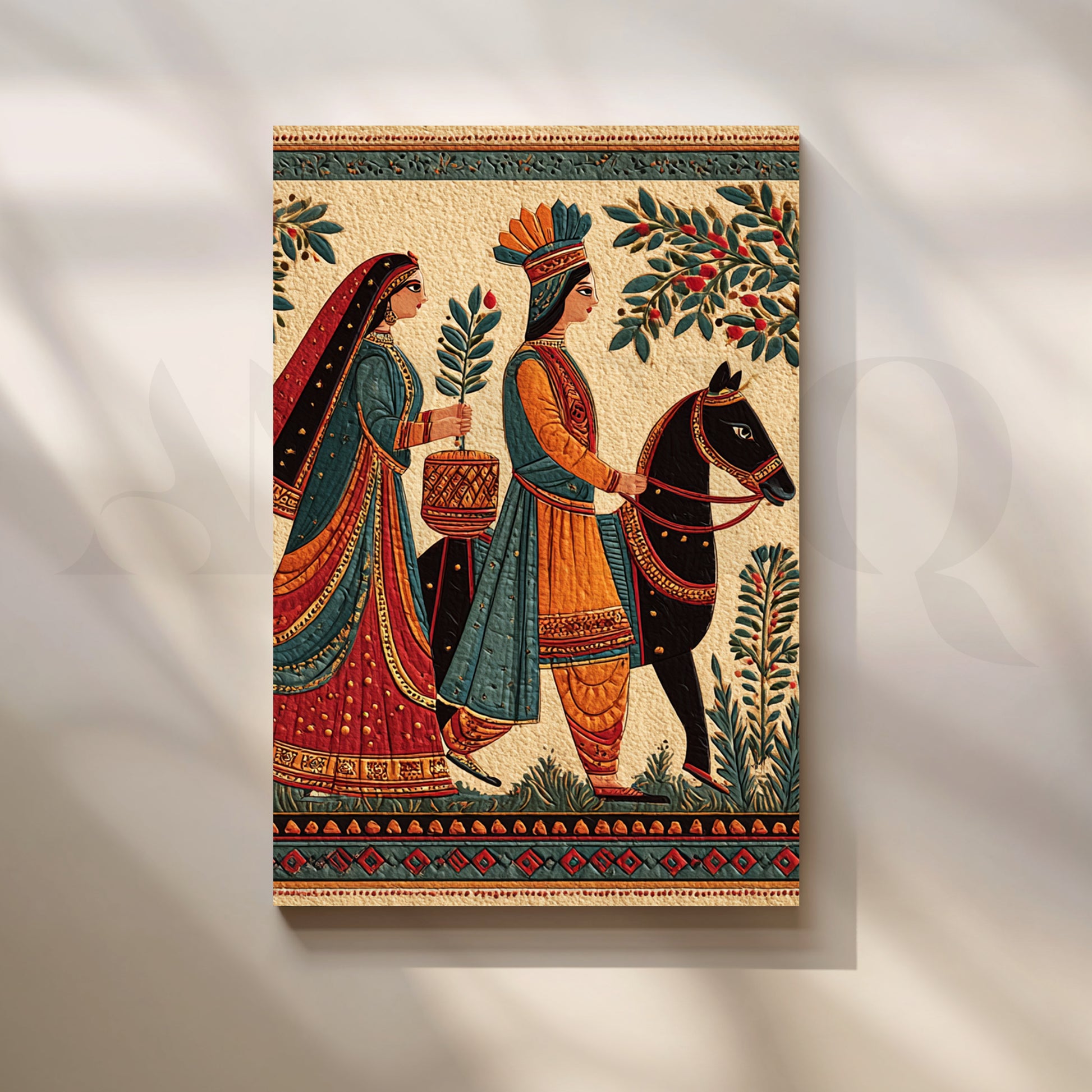 Evoking heritage miniature and Madhubani sensibilities, this detailed scene depicts a regal couple in a ceremonial march—rich textiles, foliage and borders in earthy reds and teals. A storytelling centerpiece for corridors and lounges. Keywords: Indian wedding art, folk narrative painting, Madhubani style canvas, traditional procession wall art, heritage home decor, ethnic living room artwork, cultural storytelling print.