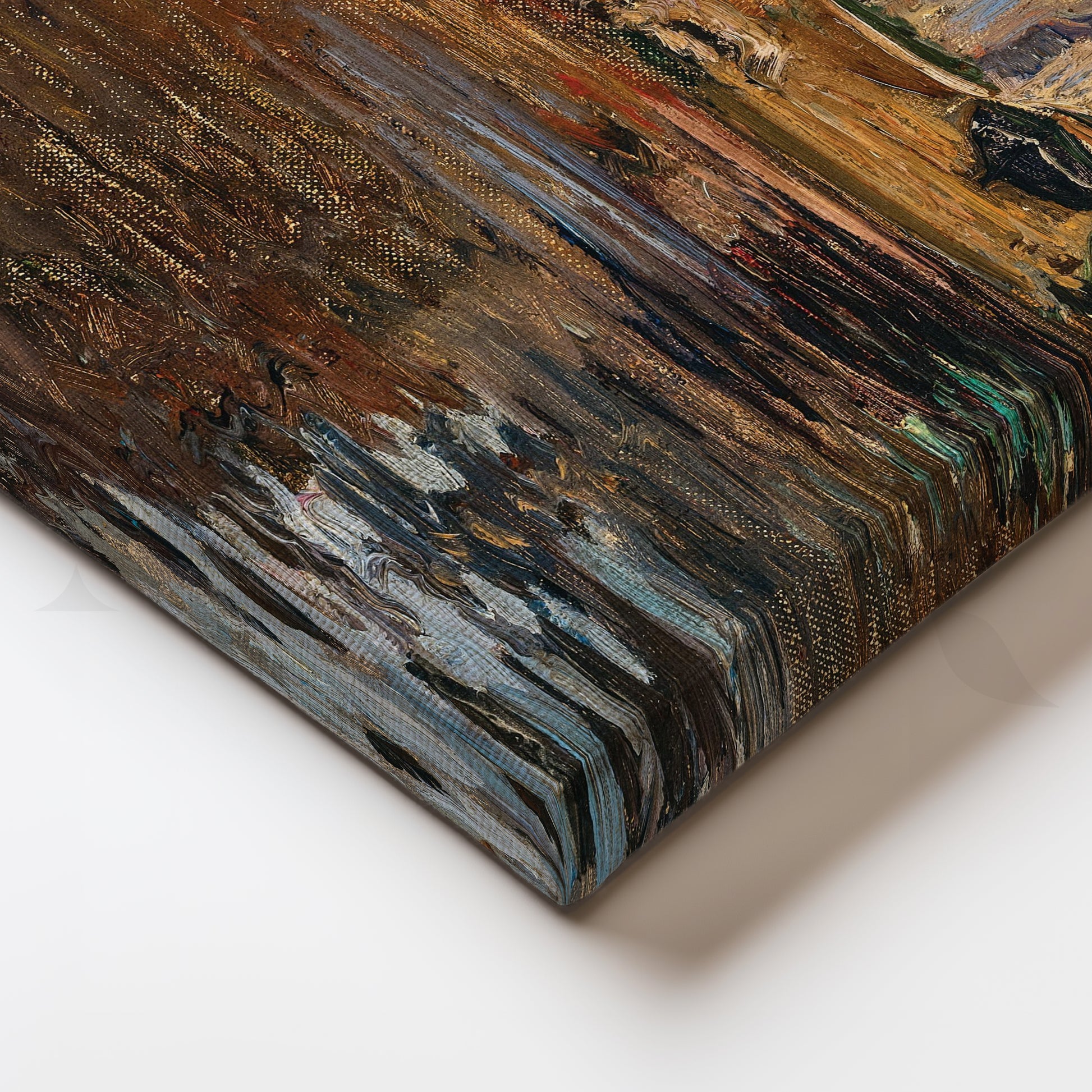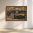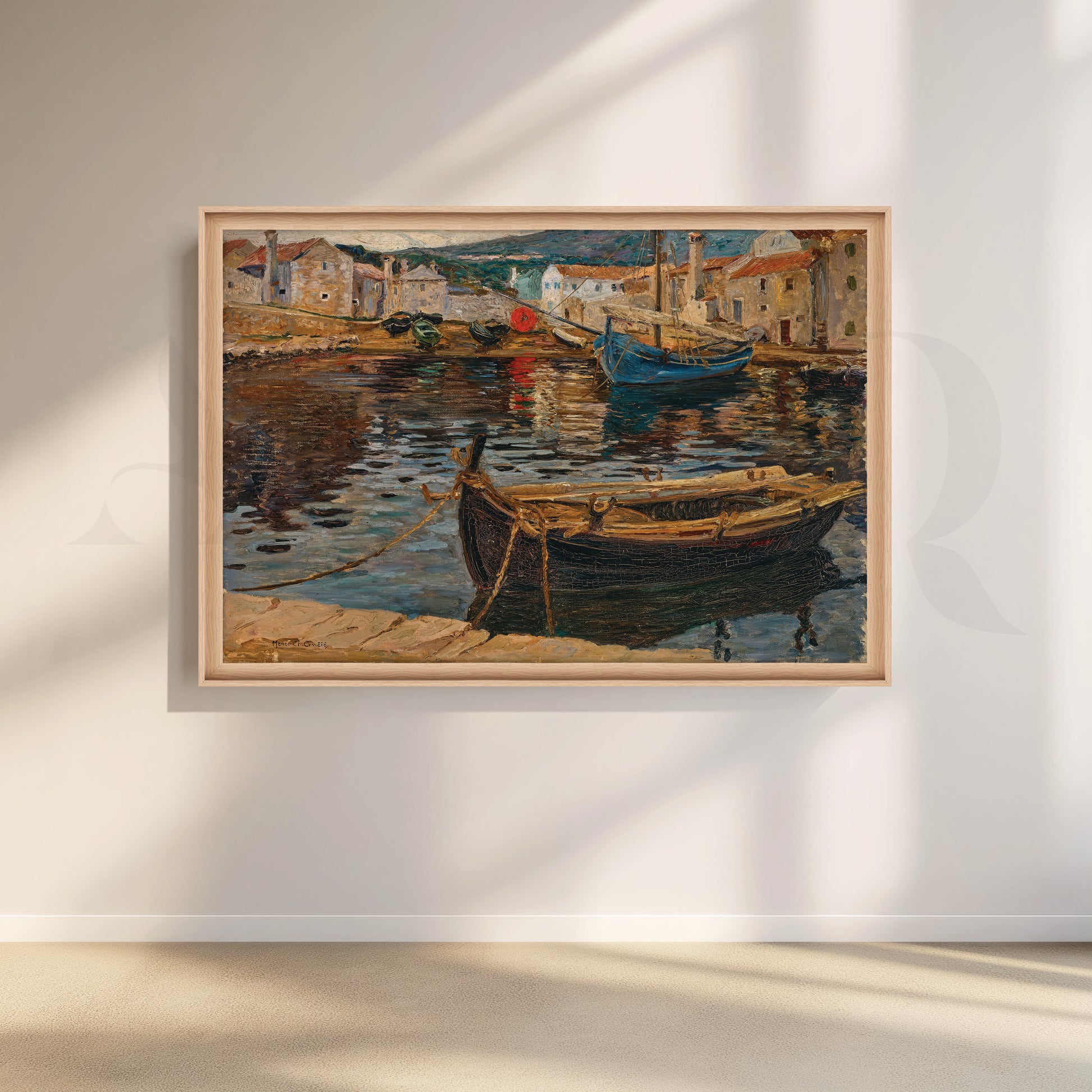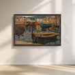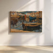 This canvas artwork captures a rustic harbor with moored wooden boats and shimmering water reflecting stone houses and warm evening light. Rich browns and deep blues add character to dining rooms, hallways, and coastal homes. A great choice for buyers looking for fishing village wall art, Mediterranean harbor prints, and seaside canvas decor.