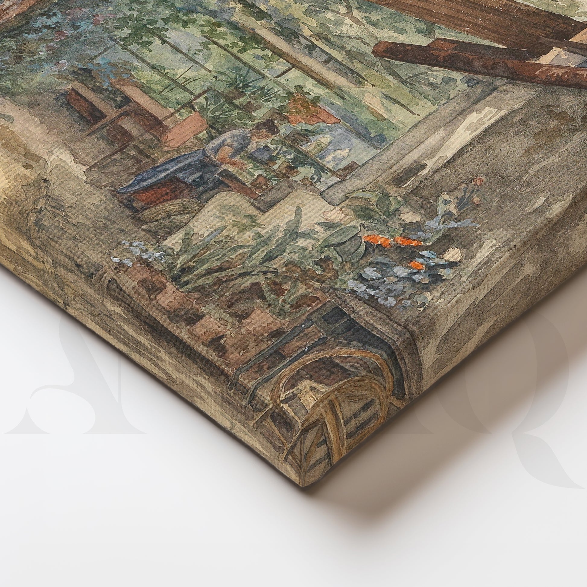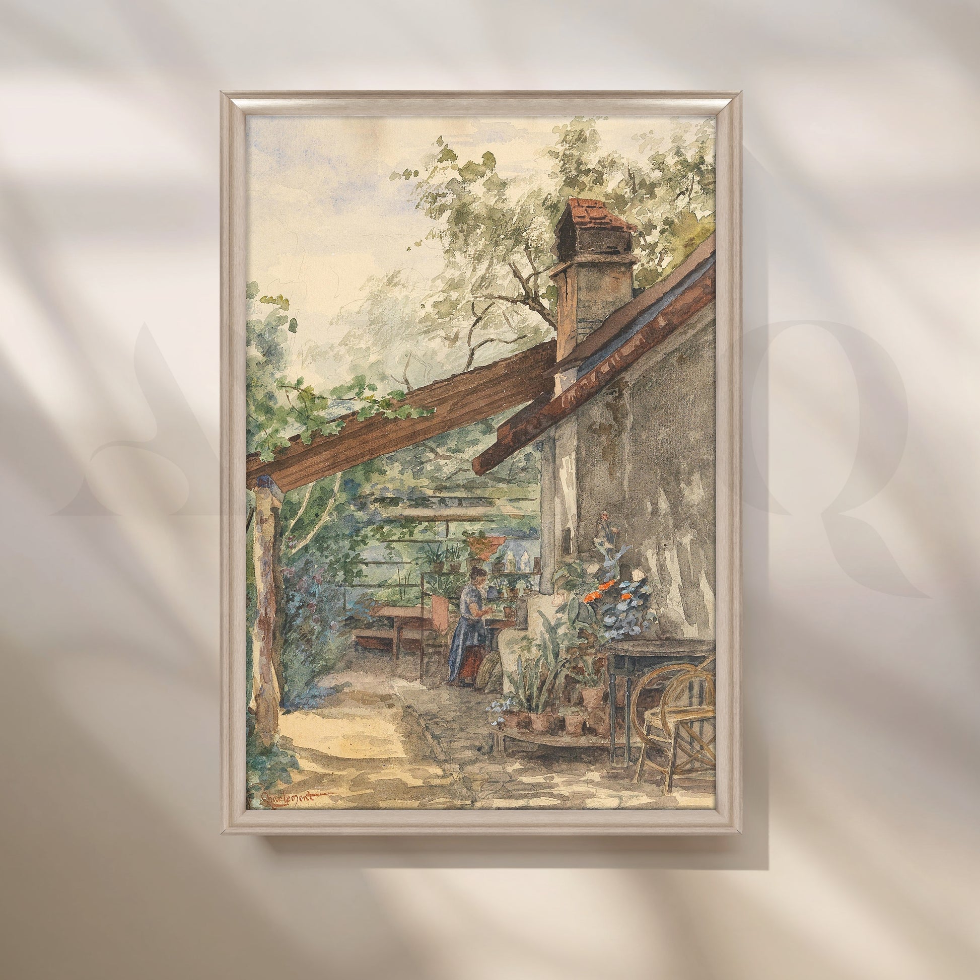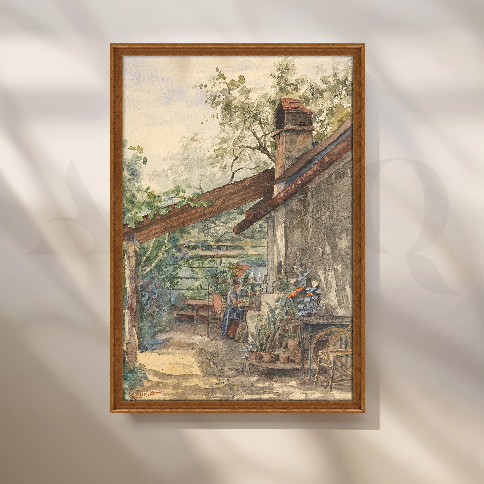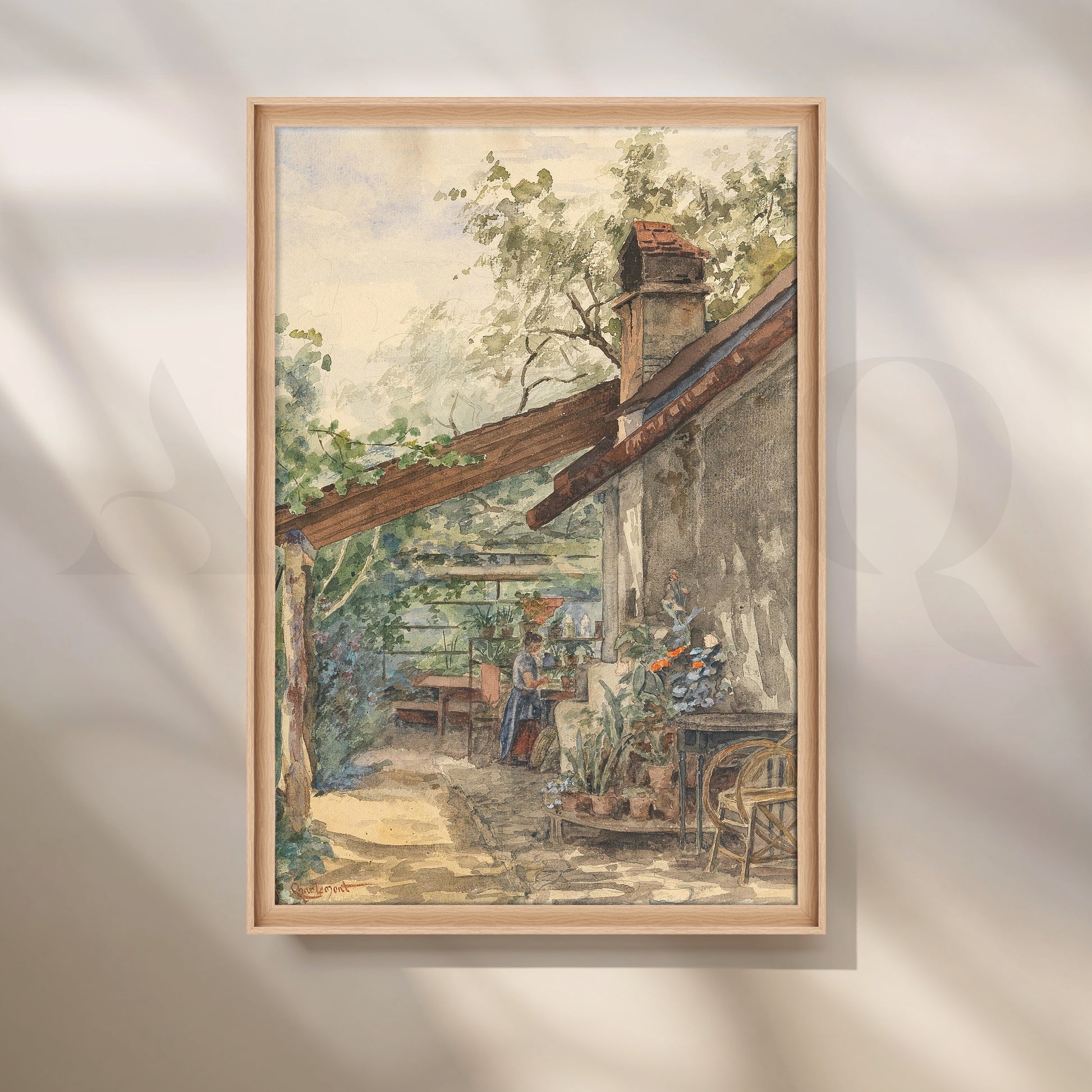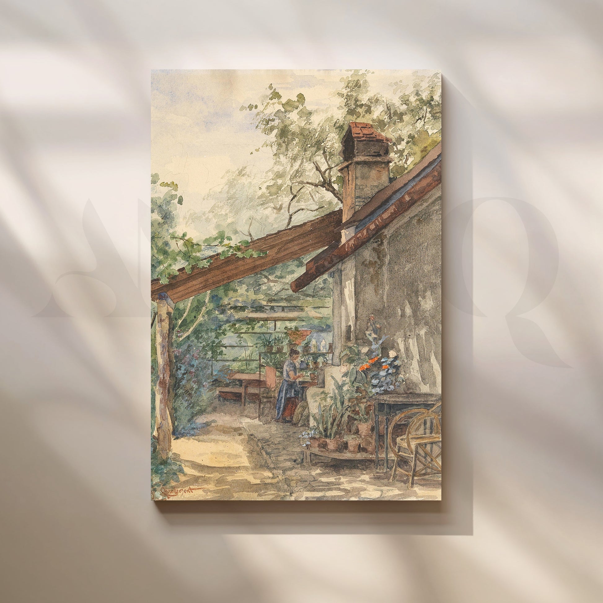 This charming canvas artwork shows a rustic cottage terrace filled with potted plants, wooden furniture and a woman gardening. Earthy tones and leafy greens create a warm, homely mood. Ideal dining room or kitchen wall art for farmhouse décor, plant lovers and cosy rustic interiors that celebrate slow living.