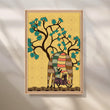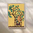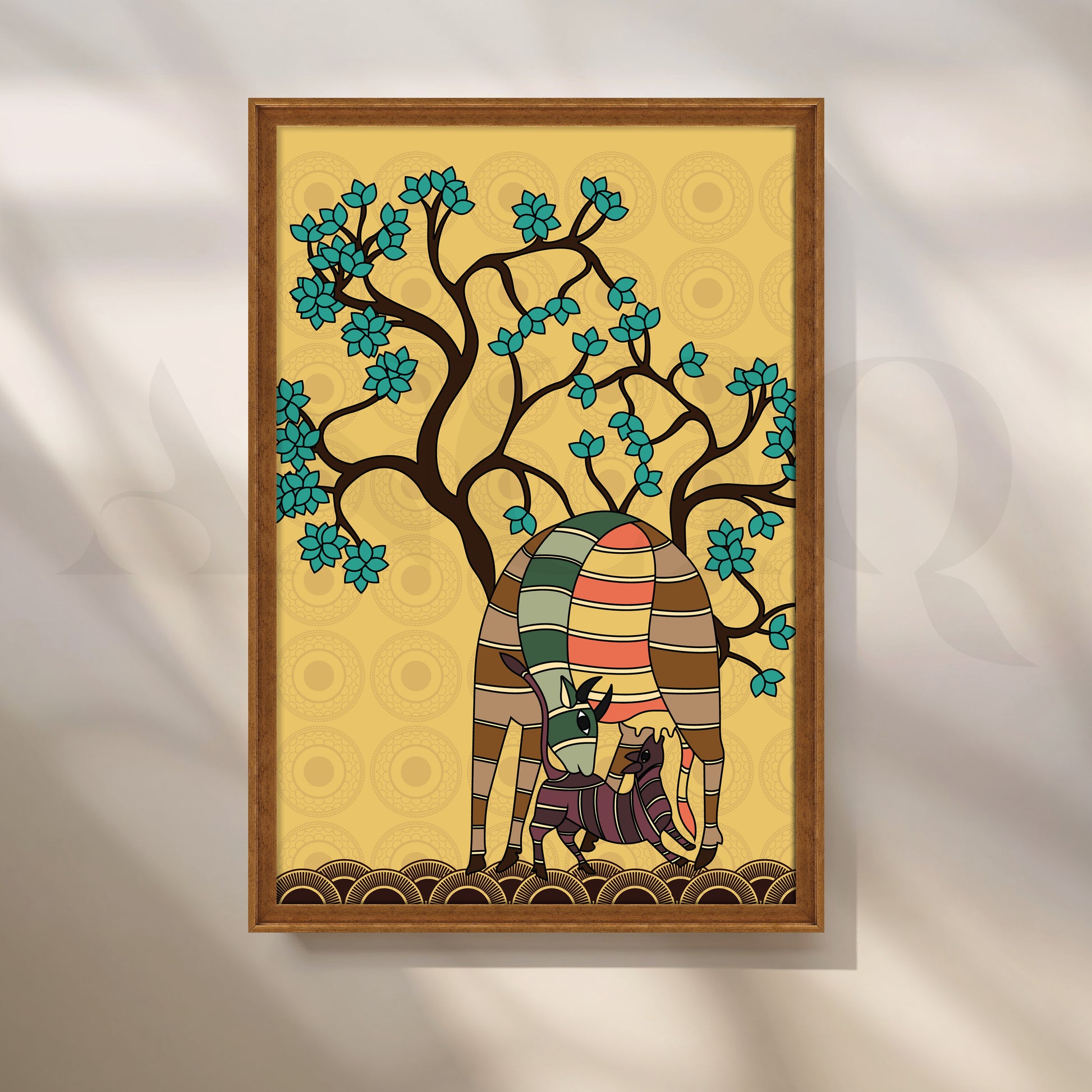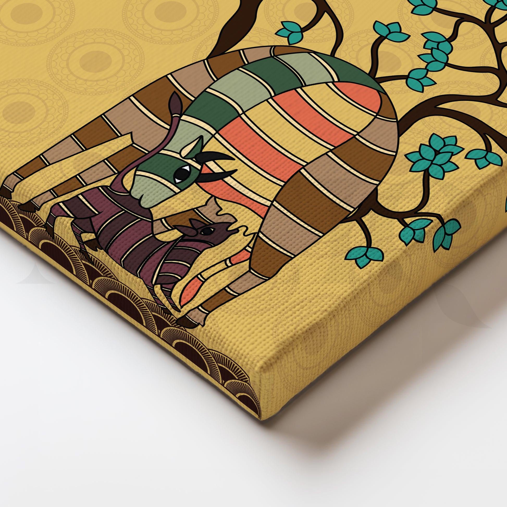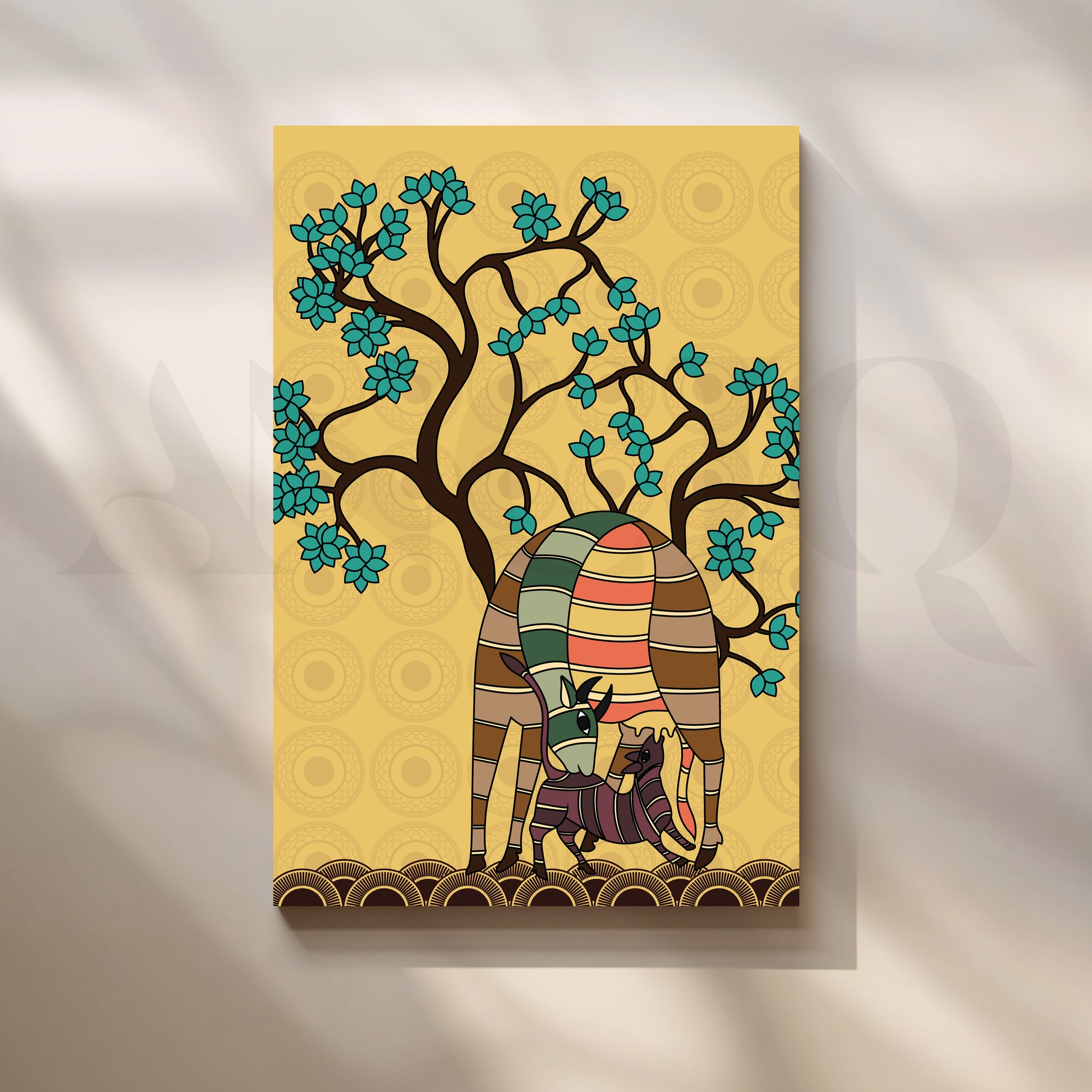 Honor the gentle symbolism of motherhood with Anciq’s “Sacred Bond – Cow & Calf” canvas artwork. A stylized mother cow and her calf, rendered in bold stripes of earthy tones, stand beneath a flowering tree with vivid turquoise blossoms against a golden background. Echoing Indian tribal and Gond-inspired art, this sacred cow wall art brings peace and prosperity to your pooja room, temple space, kitchen, or dining area.