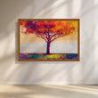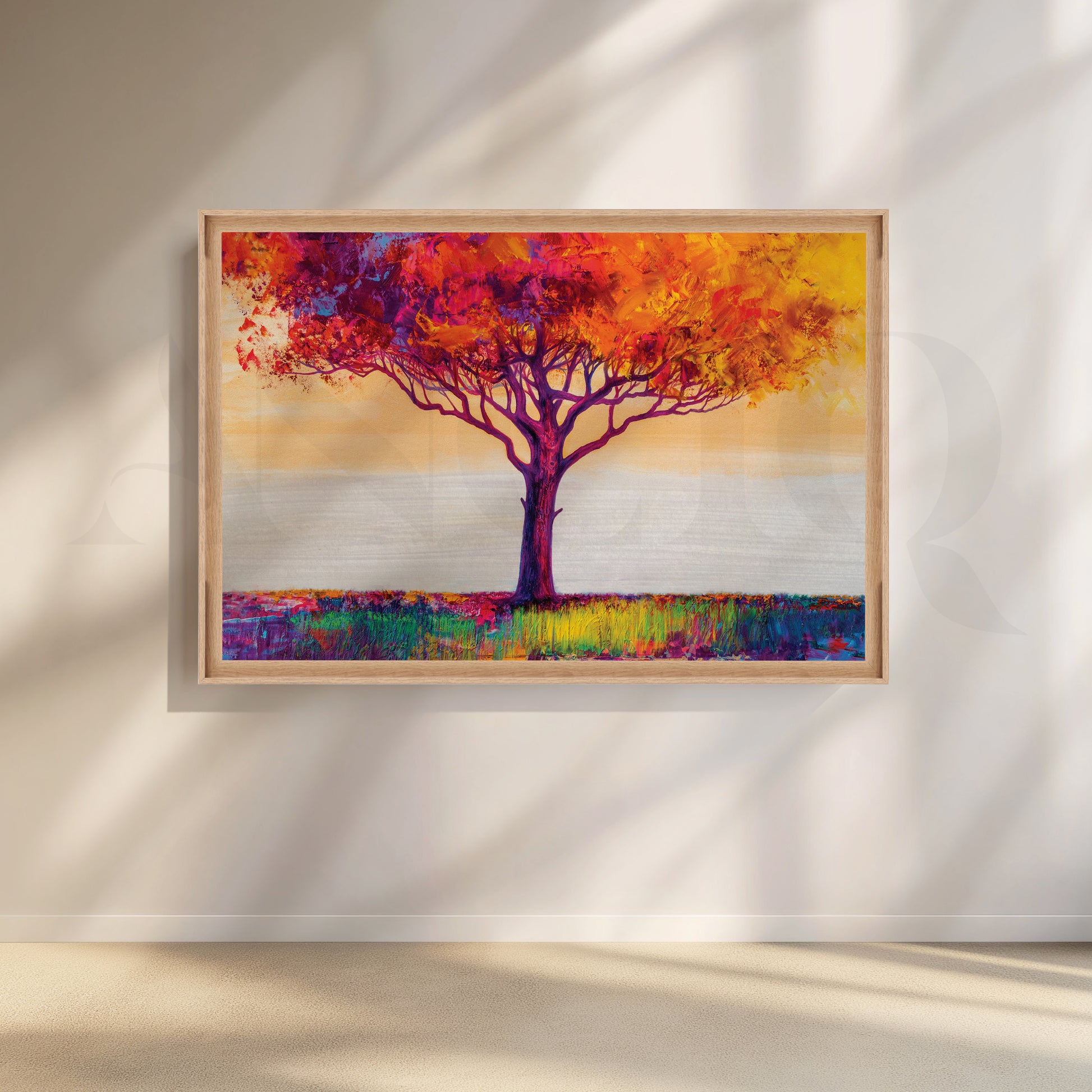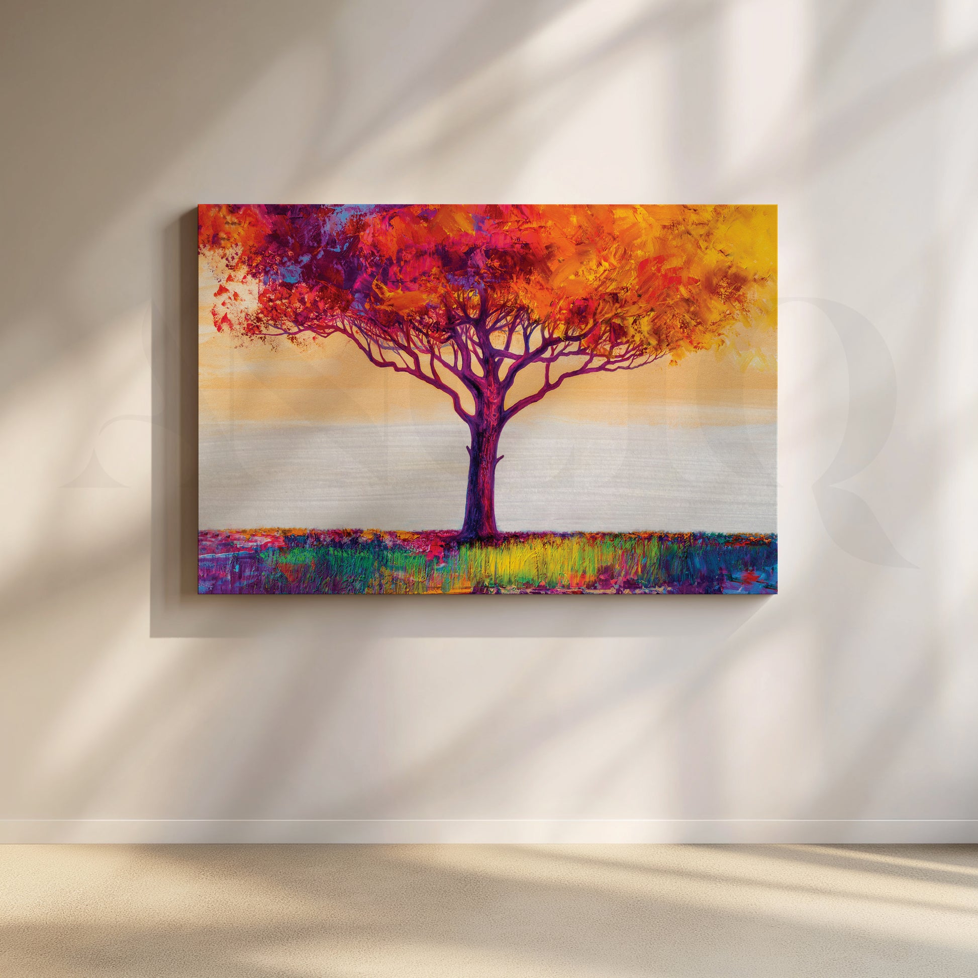 Capture the essence of autumn with this captivating painting. A lone tree explodes with fiery colors, its leaves a dazzling contrast against a serene field. This piece injects a burst of energy into any space, perfect for nature lovers and art enthusiasts alike.