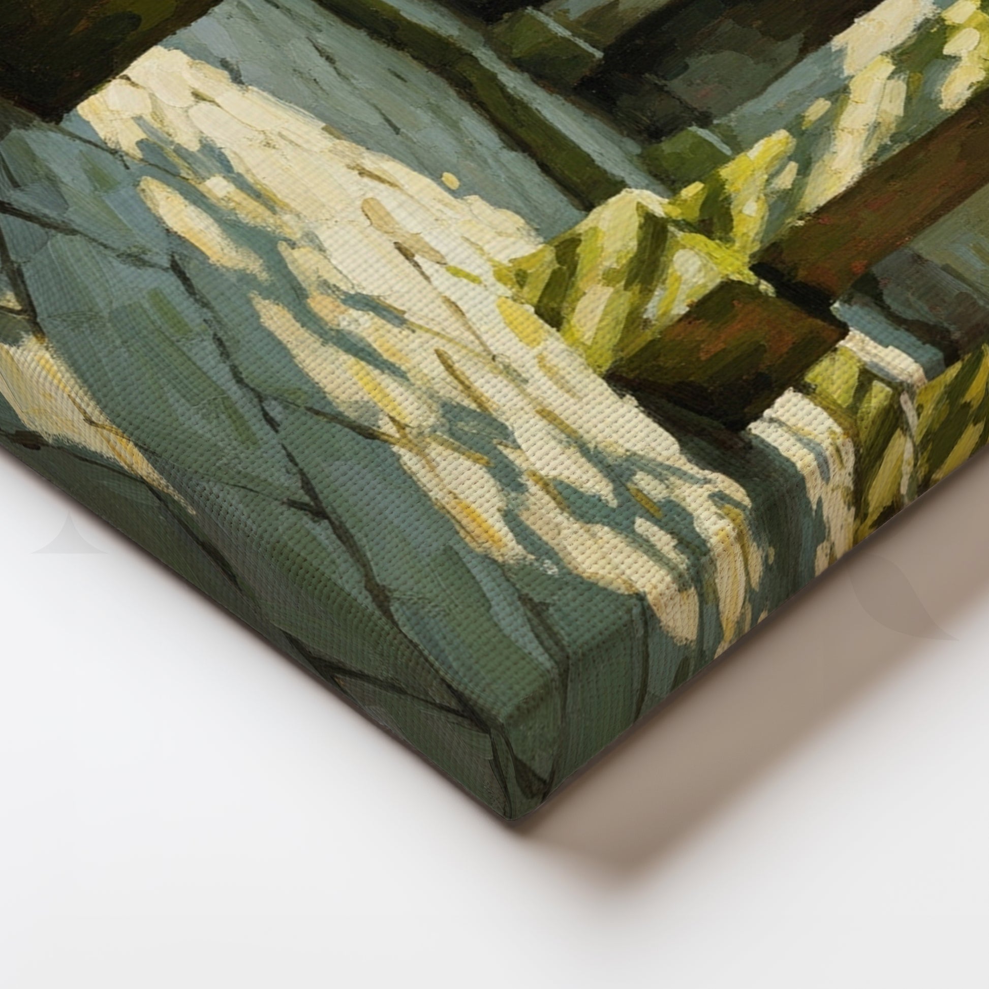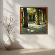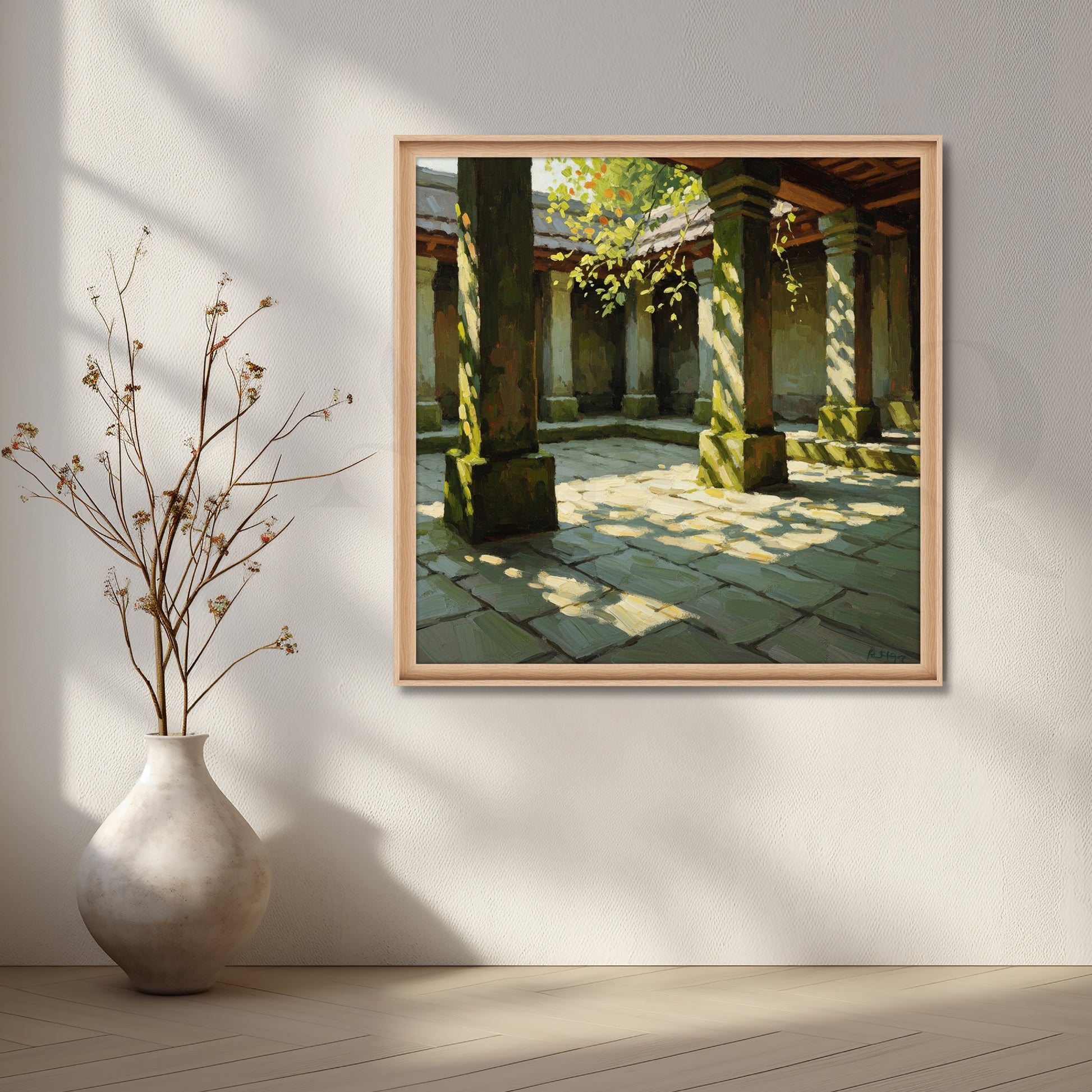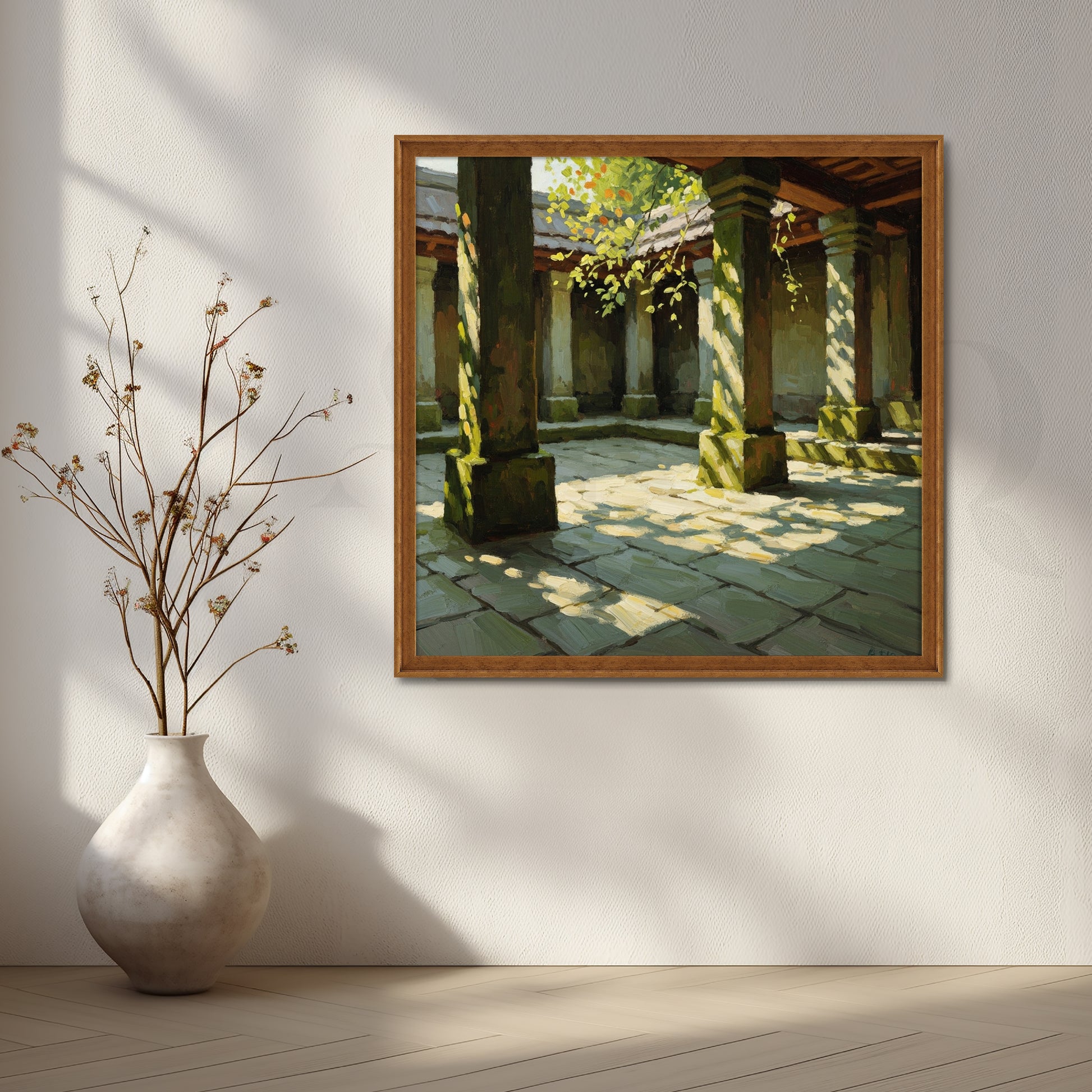 Anciq ‘Sacred Pillars of Light’ canvas artwork highlights sun-drenched stone corridors and vines in a tranquil courtyard setting. Designed for meditation rooms or peaceful nooks, this artwork exudes calm. Ideal keywords include zen wall art, spiritual courtyard painting, and temple-inspired canvas décor.