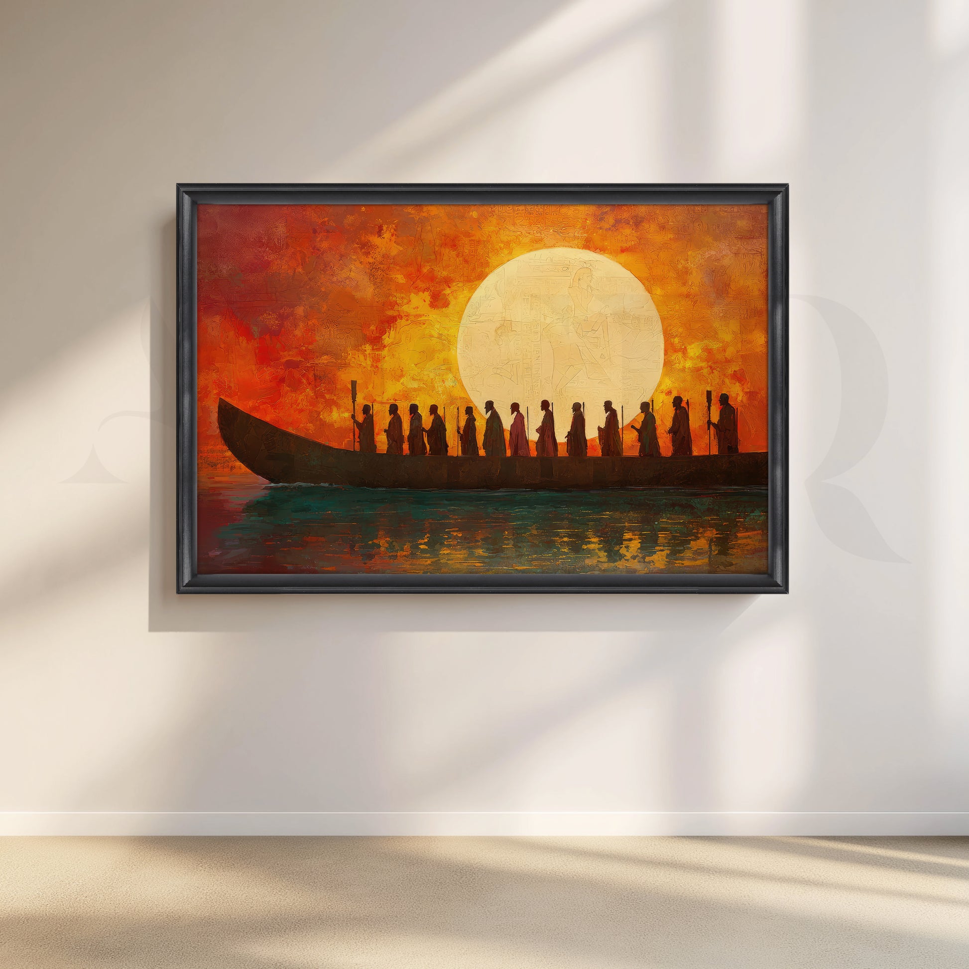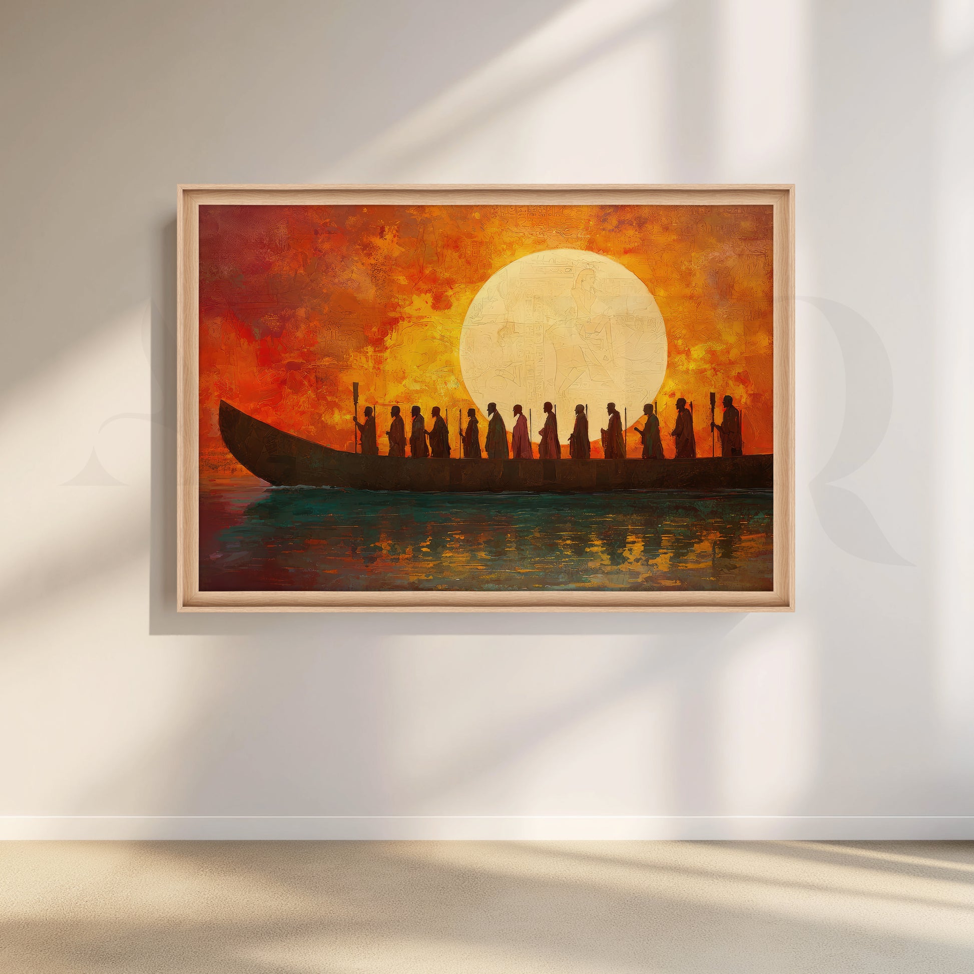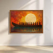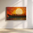 Anciq’s Sacred Sunset Voyage canvas artwork captures a dramatic boat journey across glowing waters beneath an enormous setting sun. Silhouetted figures stand together against a fiery orange and red sky, their reflections shimmering on the surface below. This bold sunset wall art is perfect for adding warmth and depth to your living room, hallway, office or entryway.