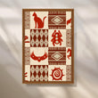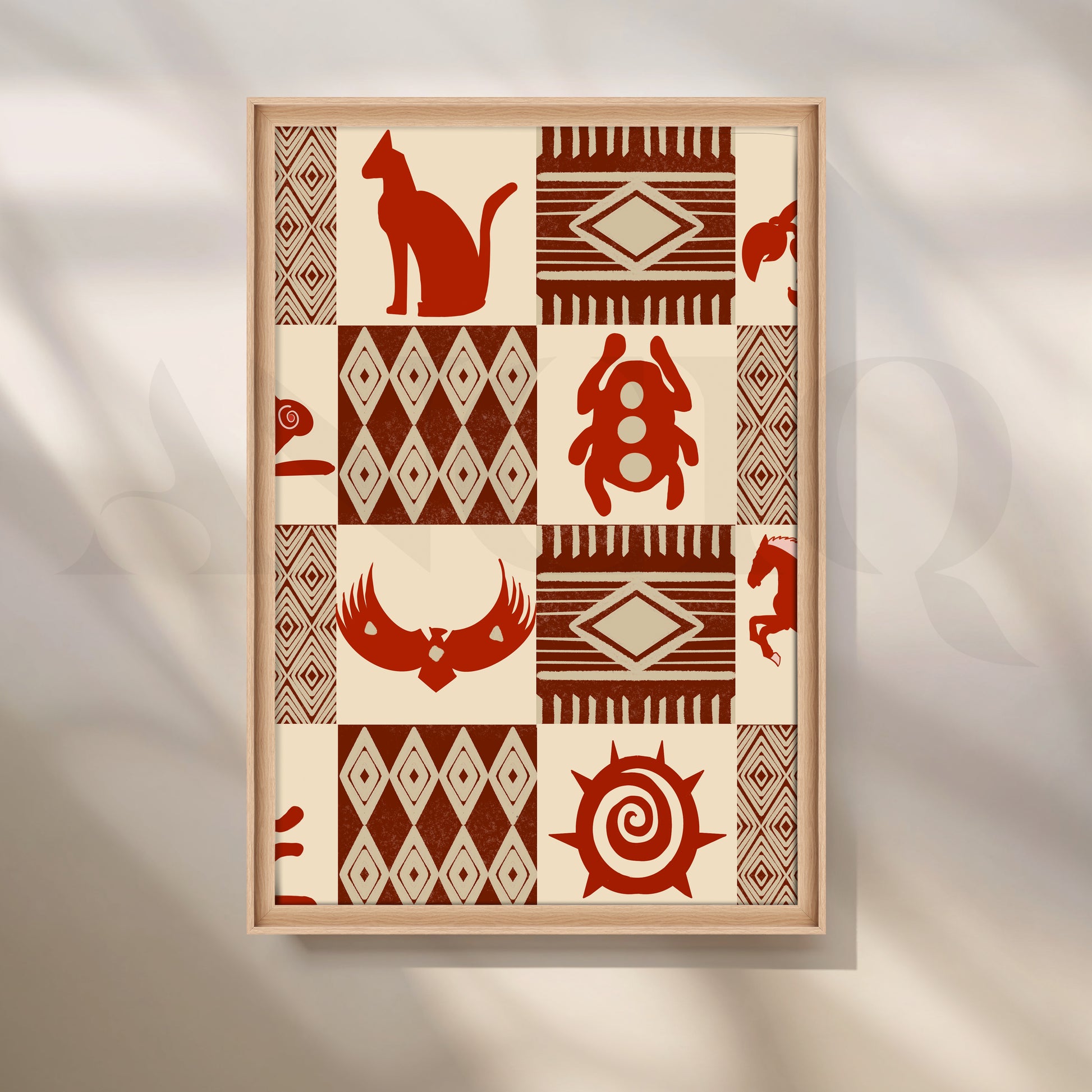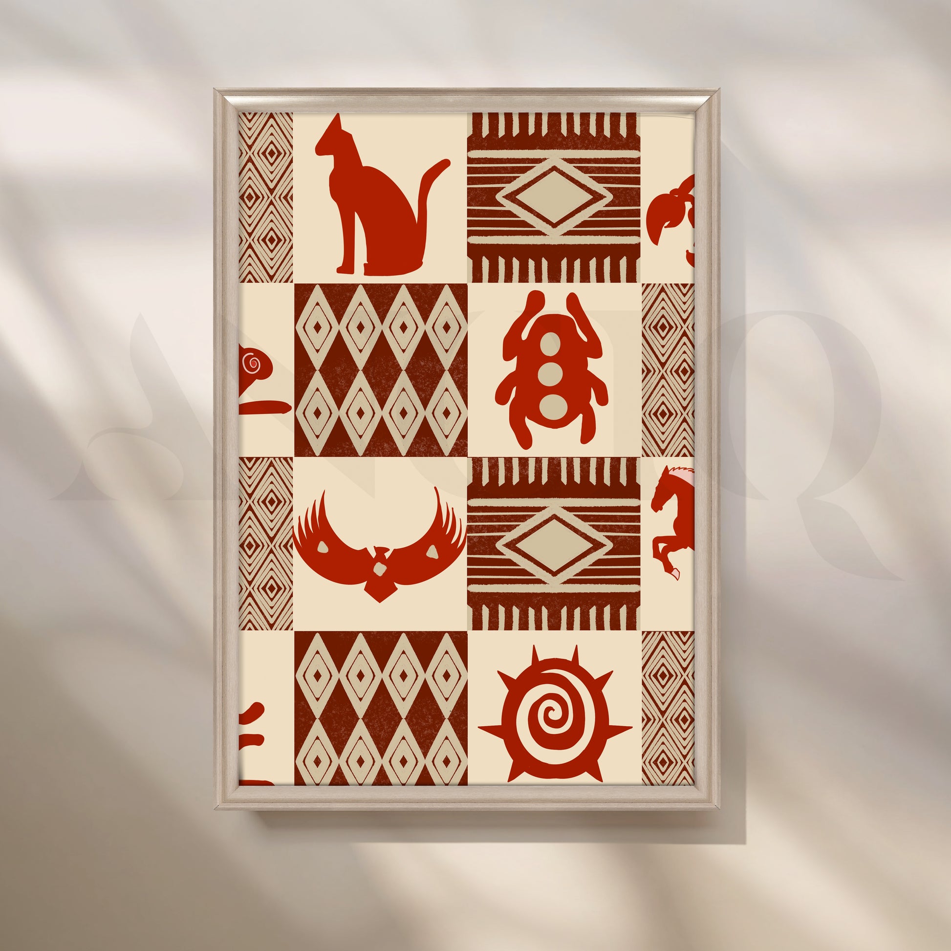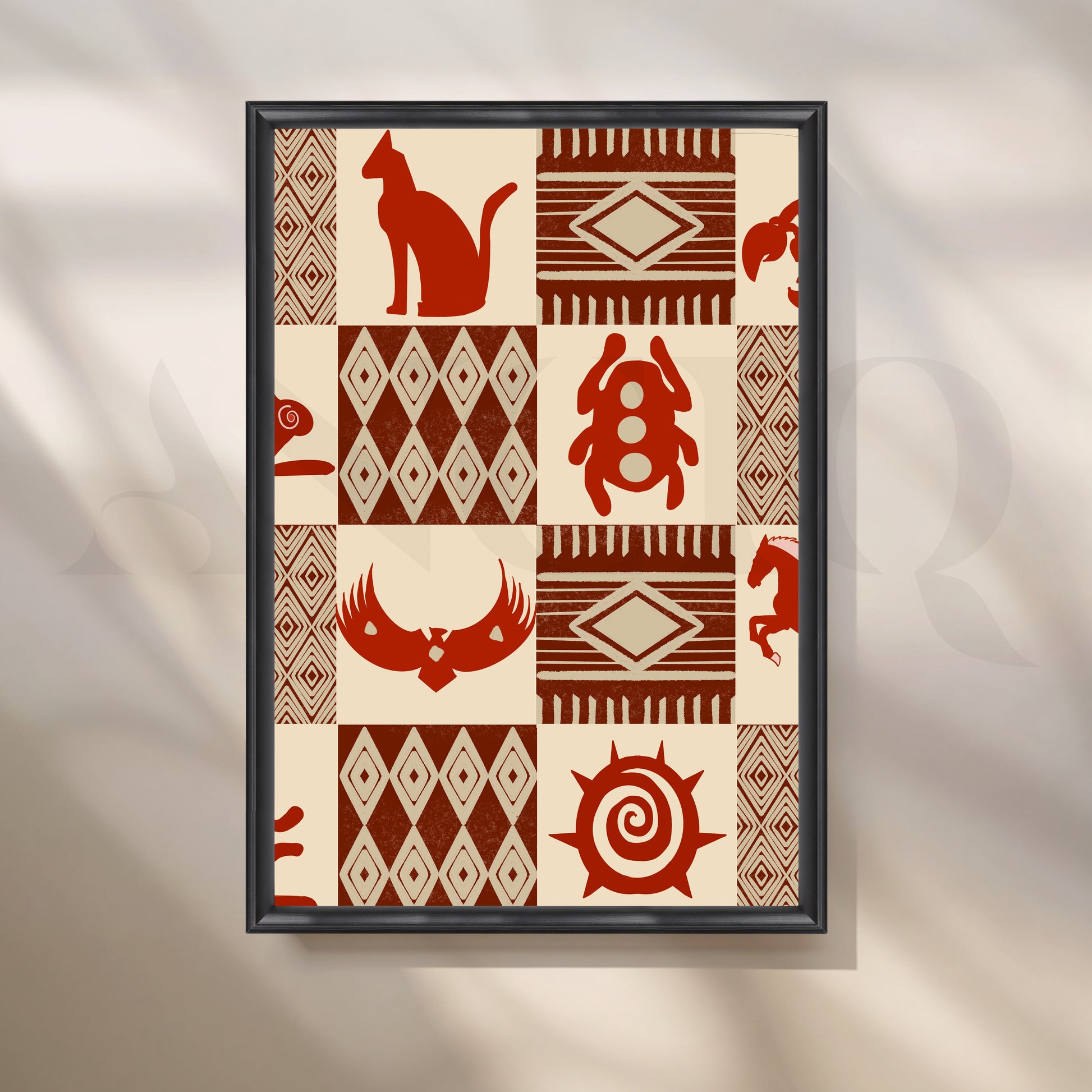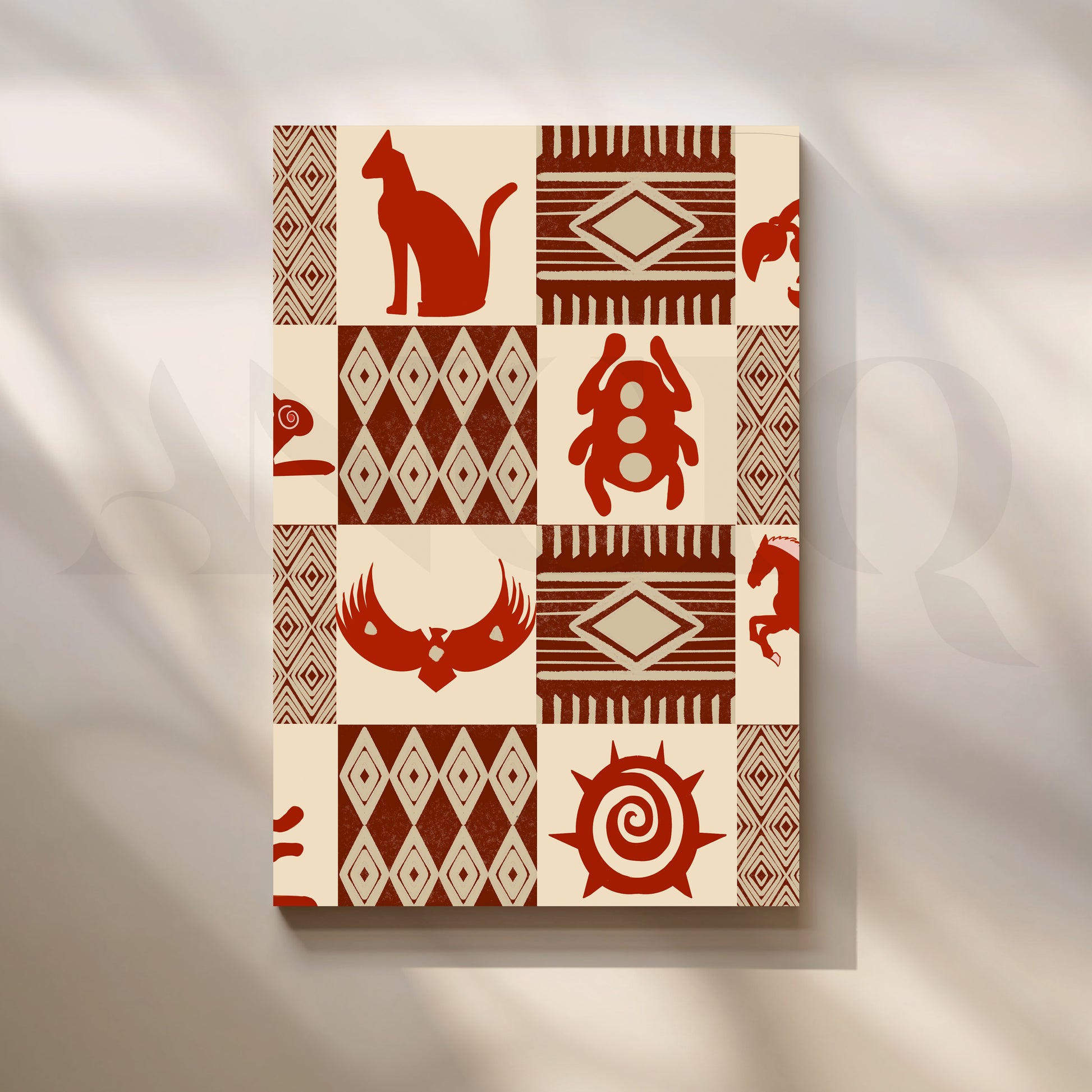 Minimal yet powerful, this Anciq artwork presents terracotta tribal motifs—cats, beetles, and sun spirals—in geometric tile patterns. Ideal for office walls or reading corners seeking subtle ethnic energy. Keywords: tribal symbol art, terracotta wall decor, earthy modern painting, cultural motif artwork, boho office wall art.