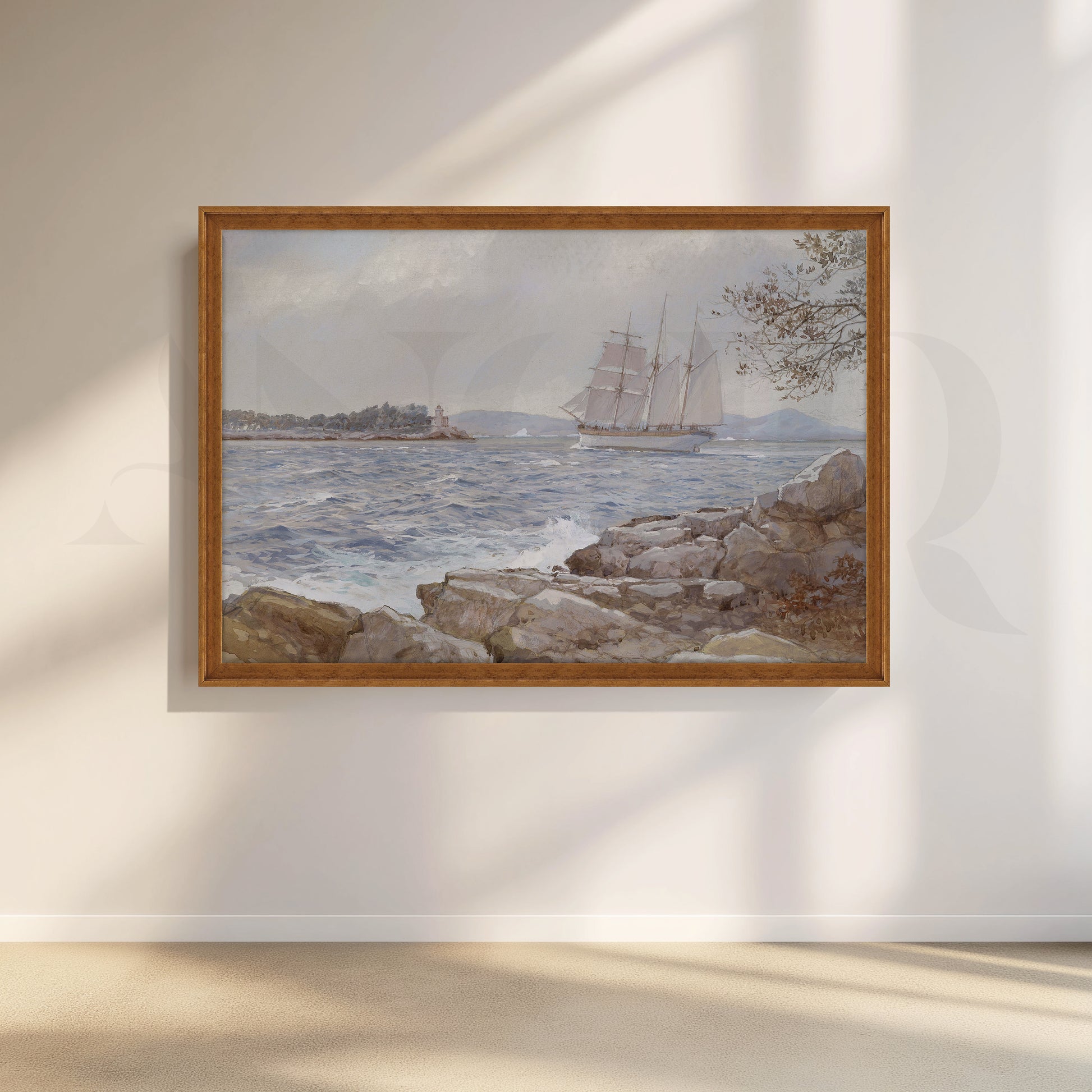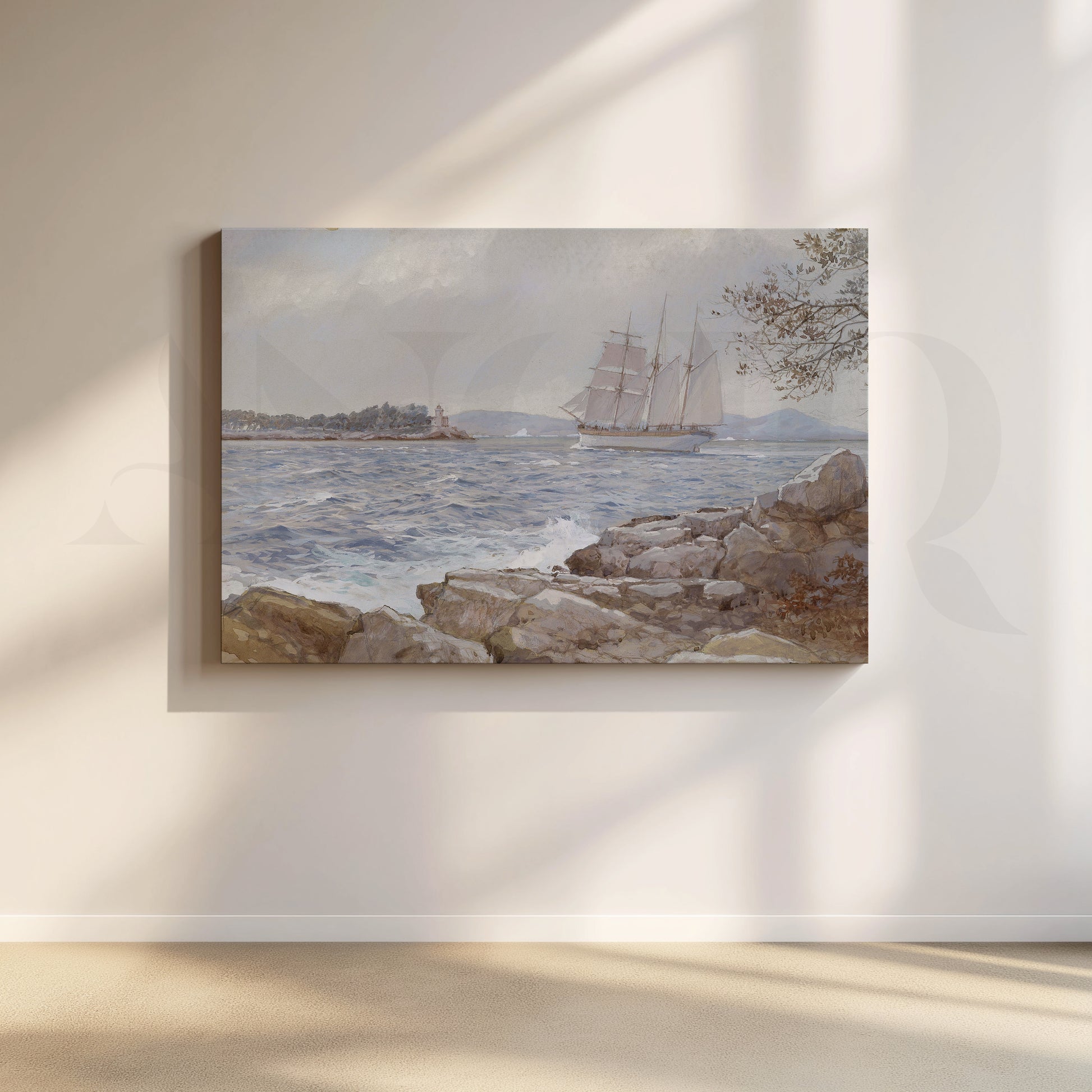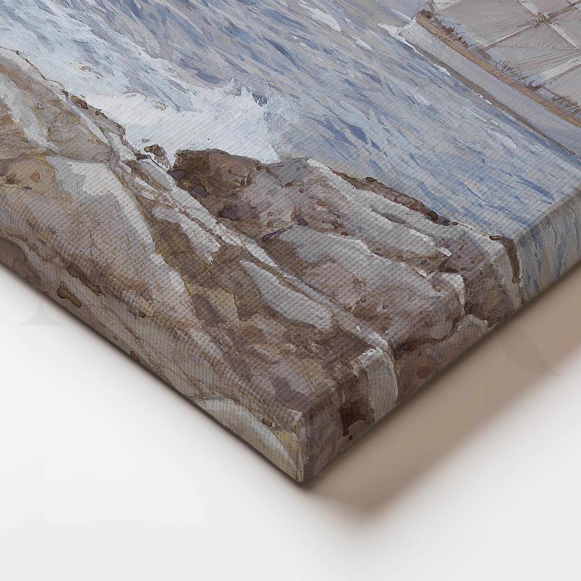 This seascape canvas artwork shows a tall-masted ship gliding past a distant lighthouse, with waves breaking over rocky shores. Gentle greys and ocean blues bring a soothing, nautical mood to your home. Perfect as living room wall art, office décor, or coastal bedroom wall art for those seeking sailing paintings and maritime canvas prints.