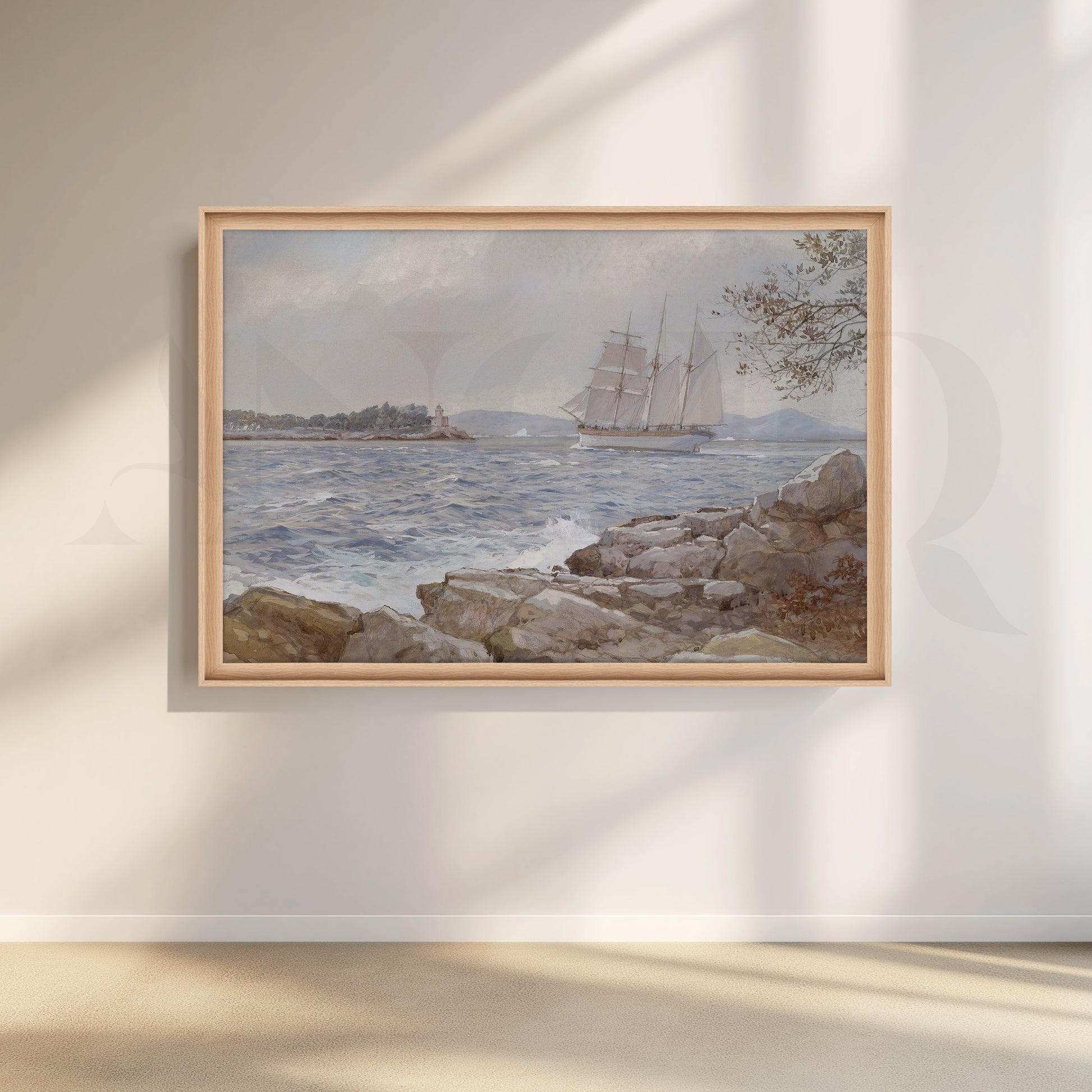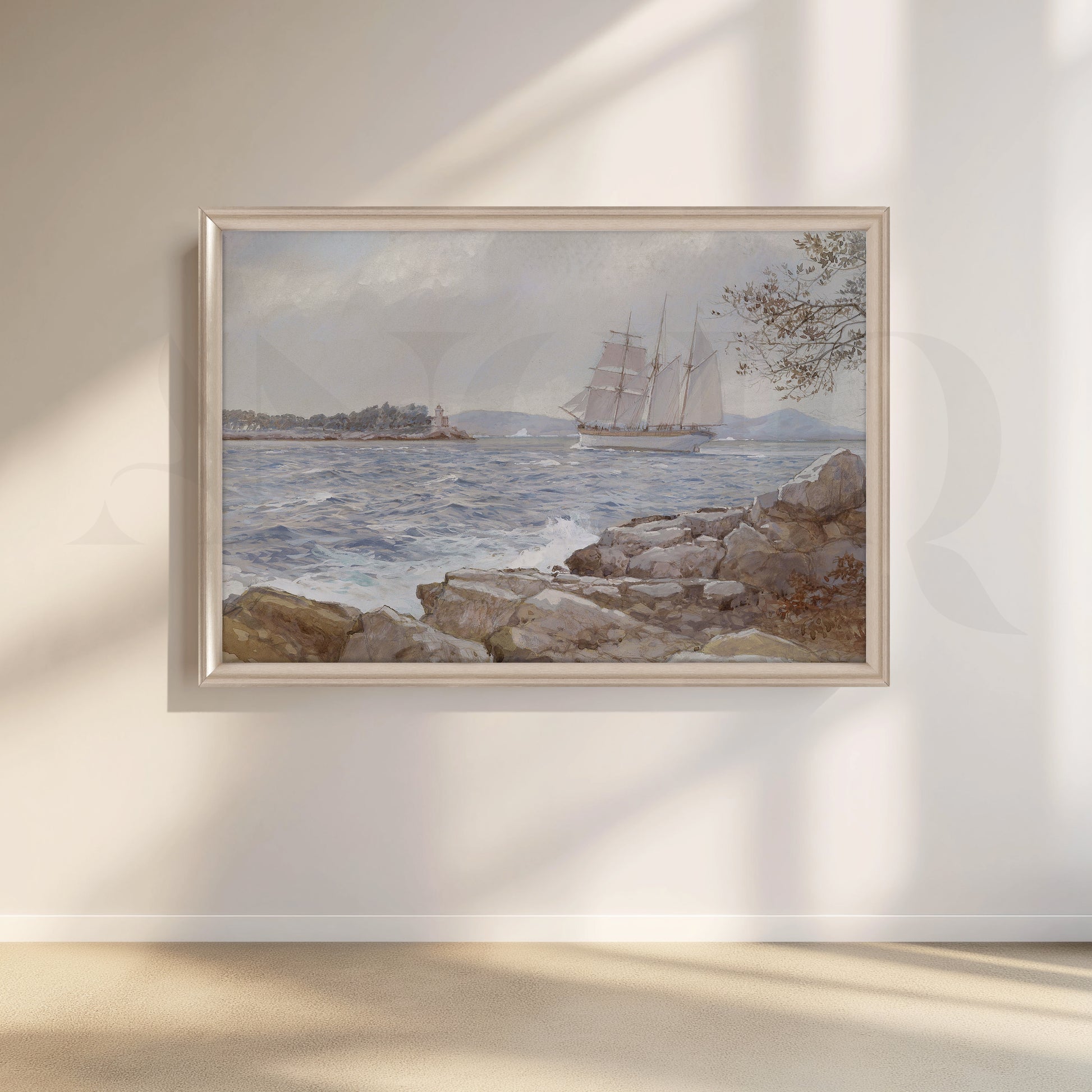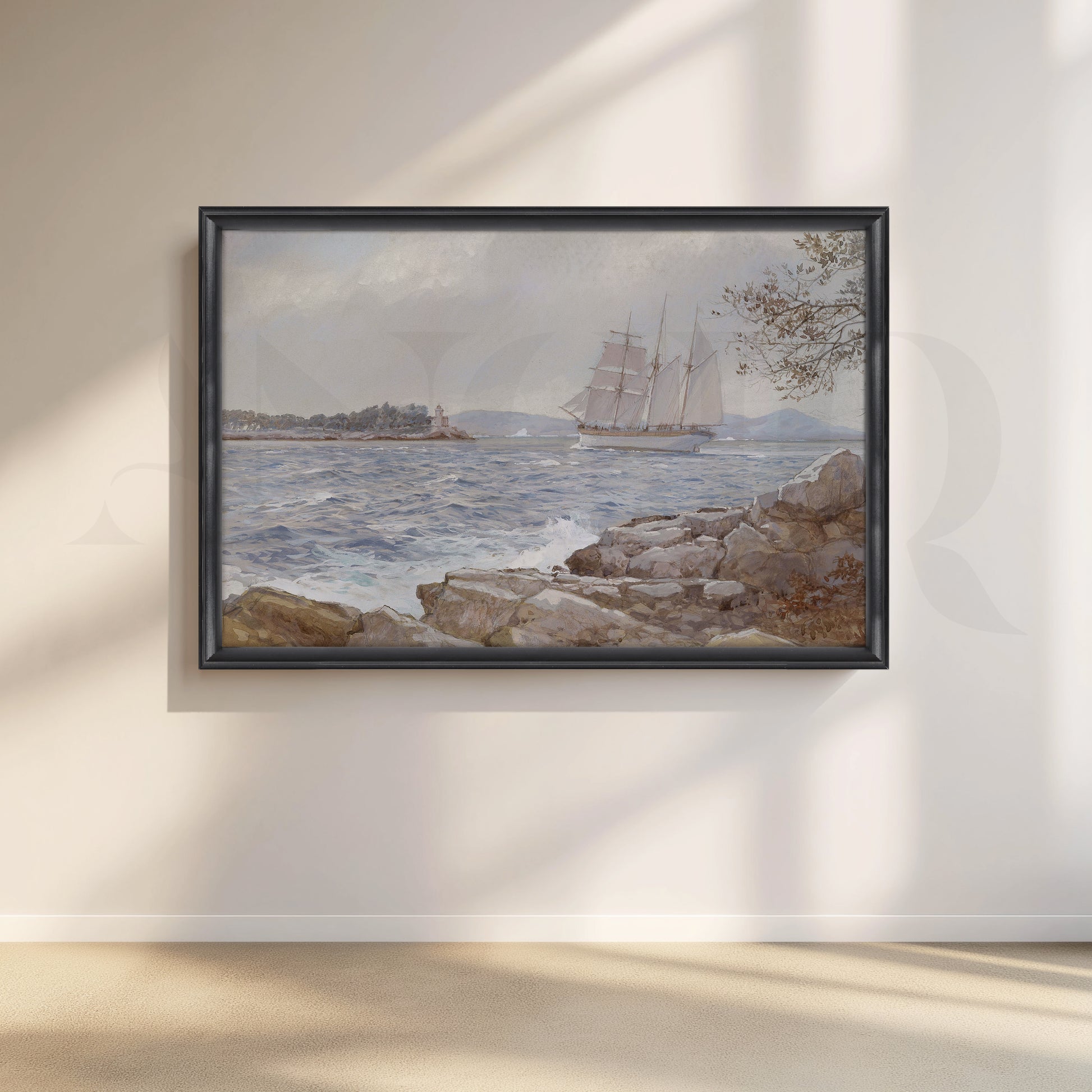 This seascape canvas artwork shows a tall-masted ship gliding past a distant lighthouse, with waves breaking over rocky shores. Gentle greys and ocean blues bring a soothing, nautical mood to your home. Perfect as living room wall art, office décor, or coastal bedroom wall art for those seeking sailing paintings and maritime canvas prints.