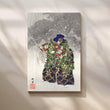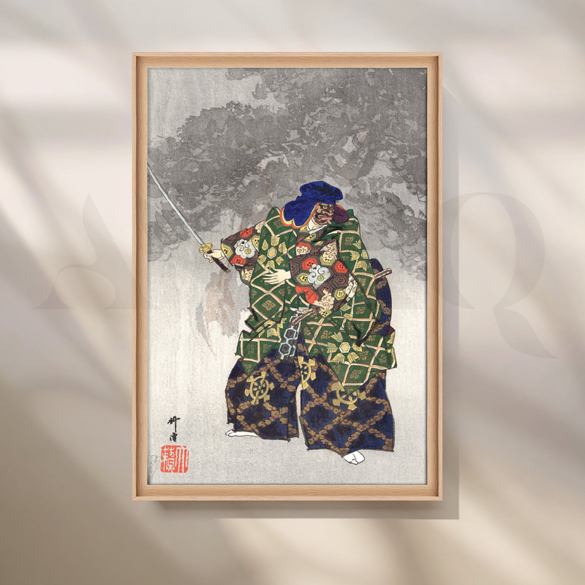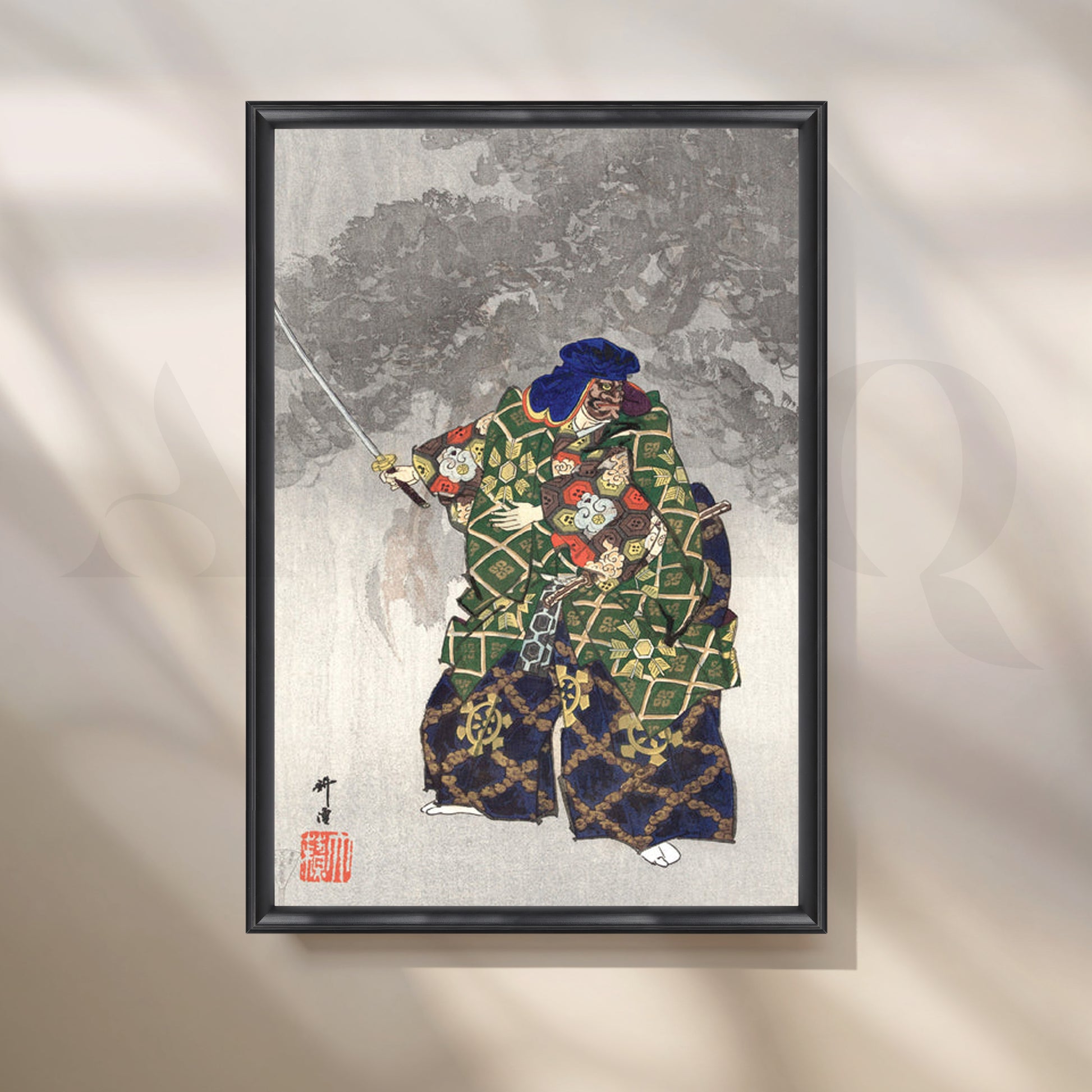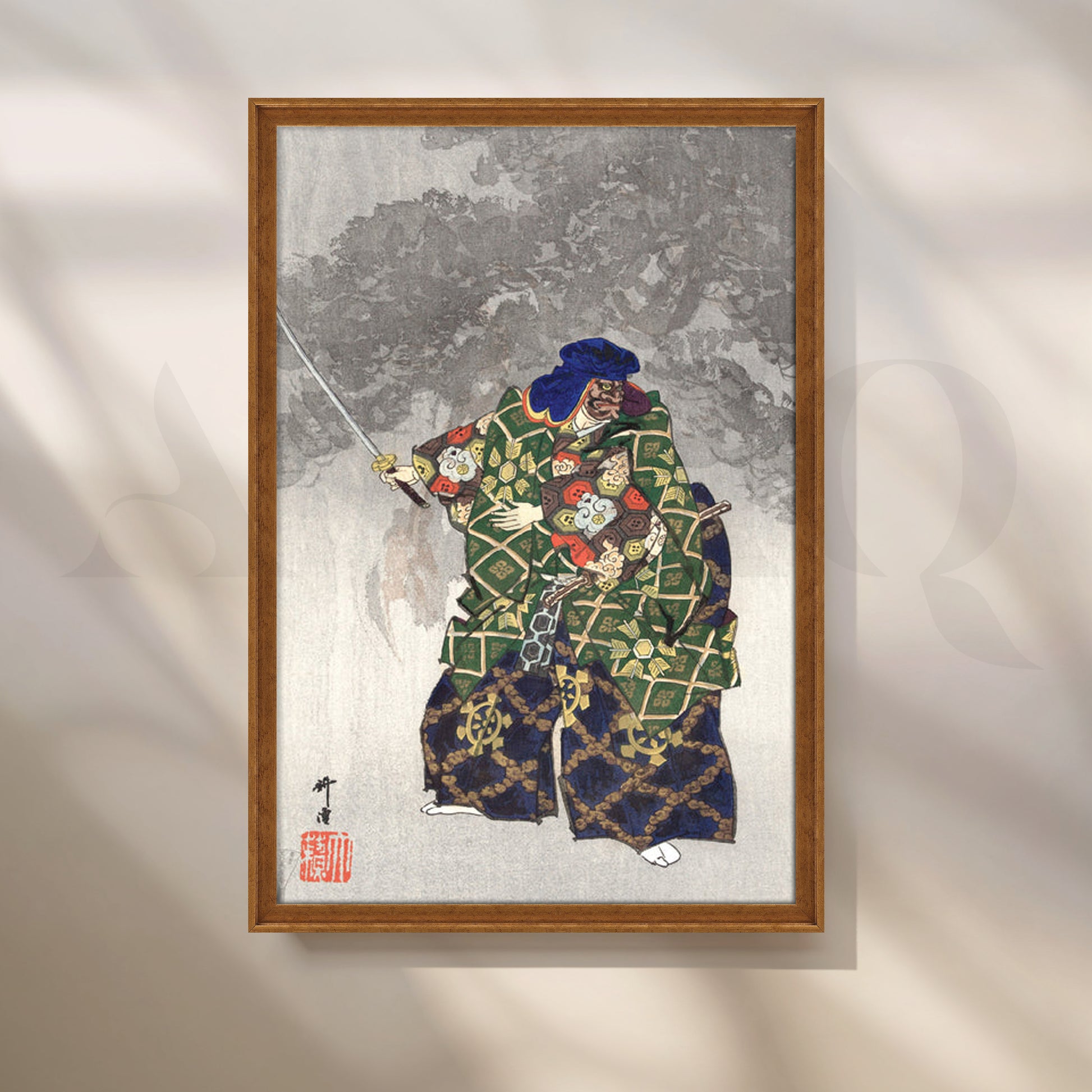 Commanding and refined, this Japanese wall art features a stoic samurai brandishing a sword, cloaked in deep green, indigo, and gold patterns against a misty gray backdrop—evoking classic ukiyo-e texture and timeless elegance. The bold warrior motif adds heritage drama to modern wall art collections while staying calm and minimalist enough for zen décor. Perfect as a statement samurai canvas painting above a sofa, console, or desk, it suits a study, office, entryway, or masculine living room. Ideal for shoppers searching vintage Japanese poster, warrior art print, ukiyo-e canvas, Japanese home décor, and large living room art.