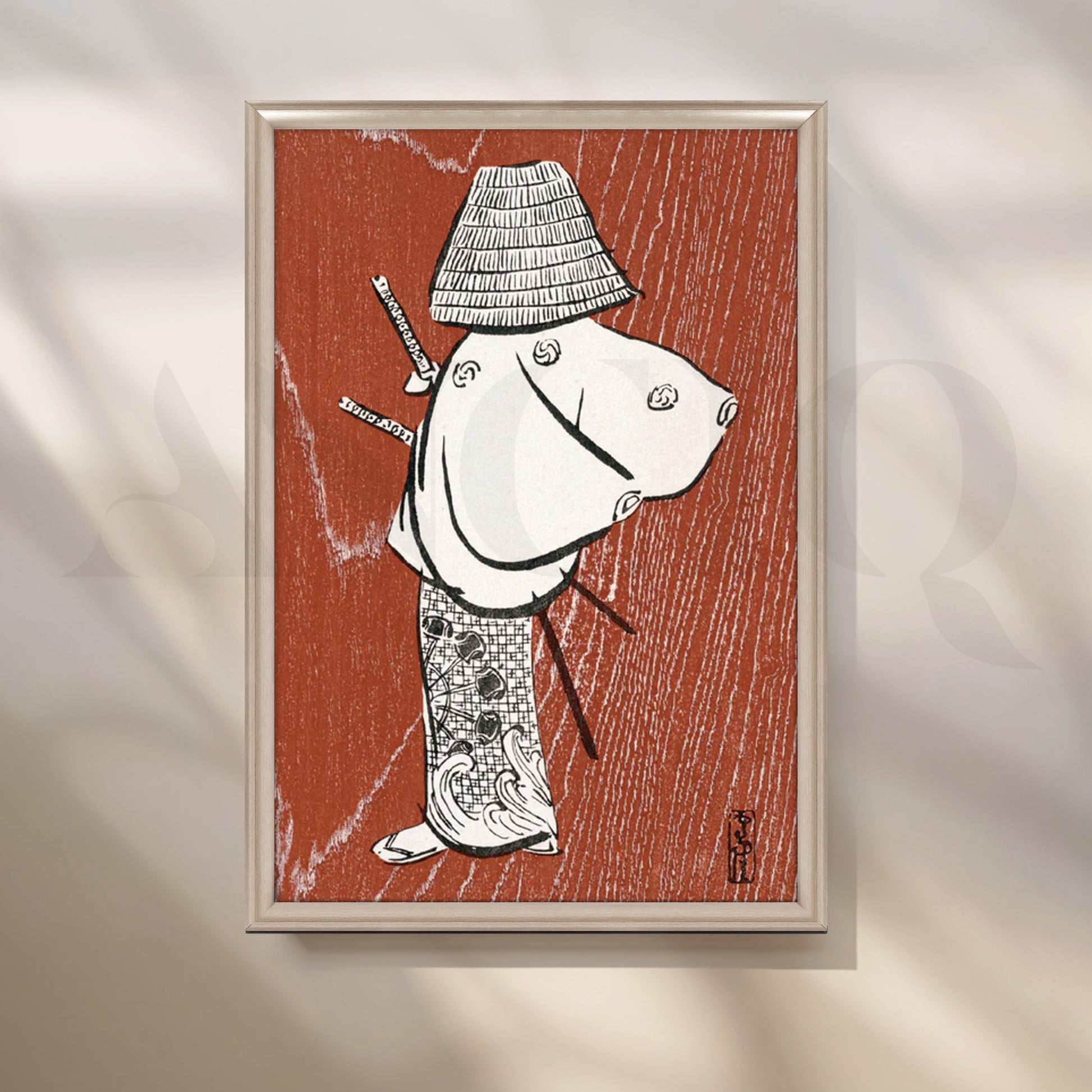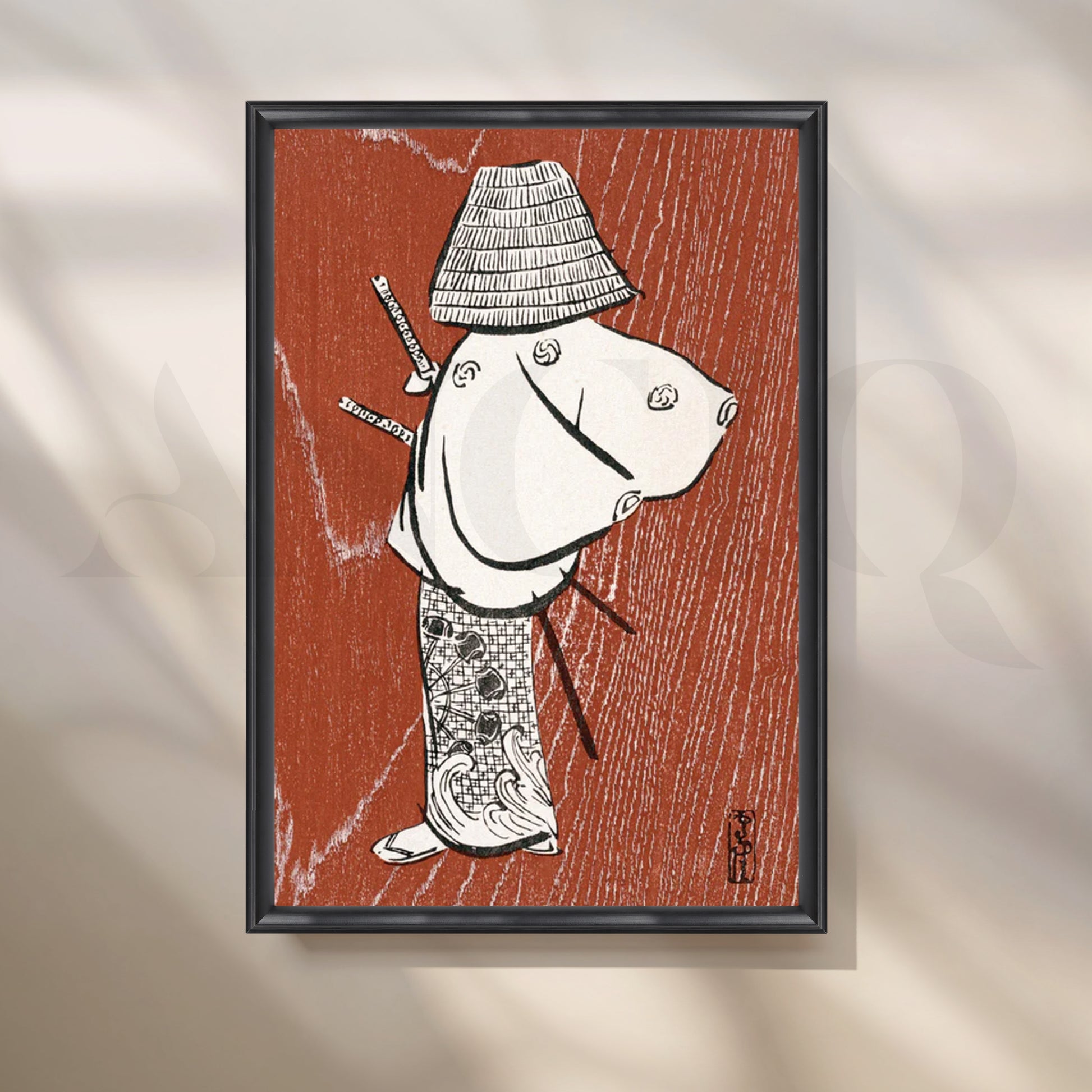 Channel serene strength with this Japanese wall art inspired by vintage ukiyo-e woodblock prints. A lone samurai in a woven straw hat and kimono is rendered in bold black and white linework over a warm terracotta, wood-grain field—perfect for Japandi, wabi-sabi, or minimalist interiors. This modern canvas painting adds quiet drama to a home office, study, entryway, or living room, pairing easily with natural woods and neutral décor. Ideal search terms include “Japanese samurai wall art,” “ukiyo-e canvas print,” “Zen décor,” “minimalist art for office,” and “modern Asian wall art,” making it a striking focal piece or an elevated addition to a gallery wall.