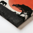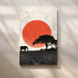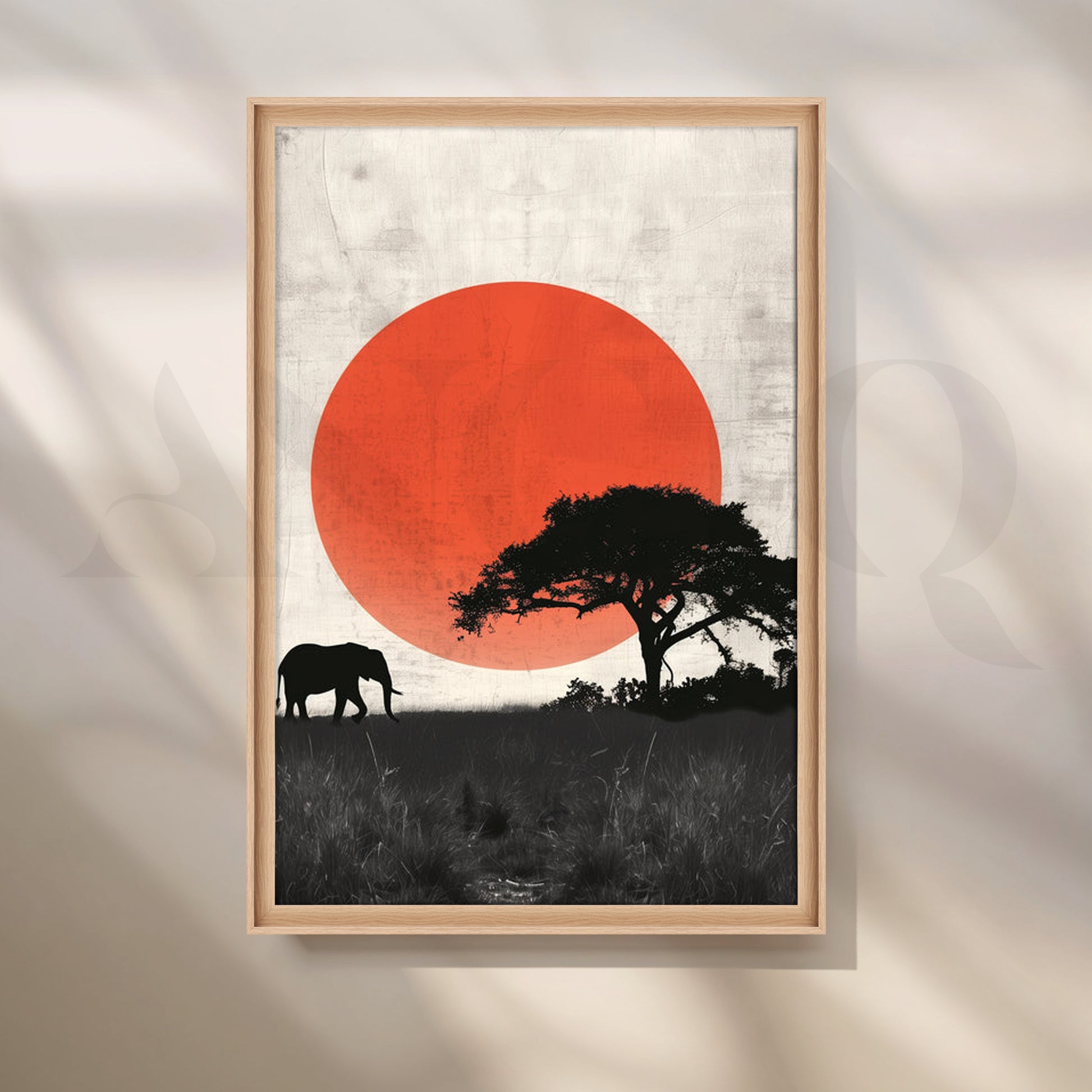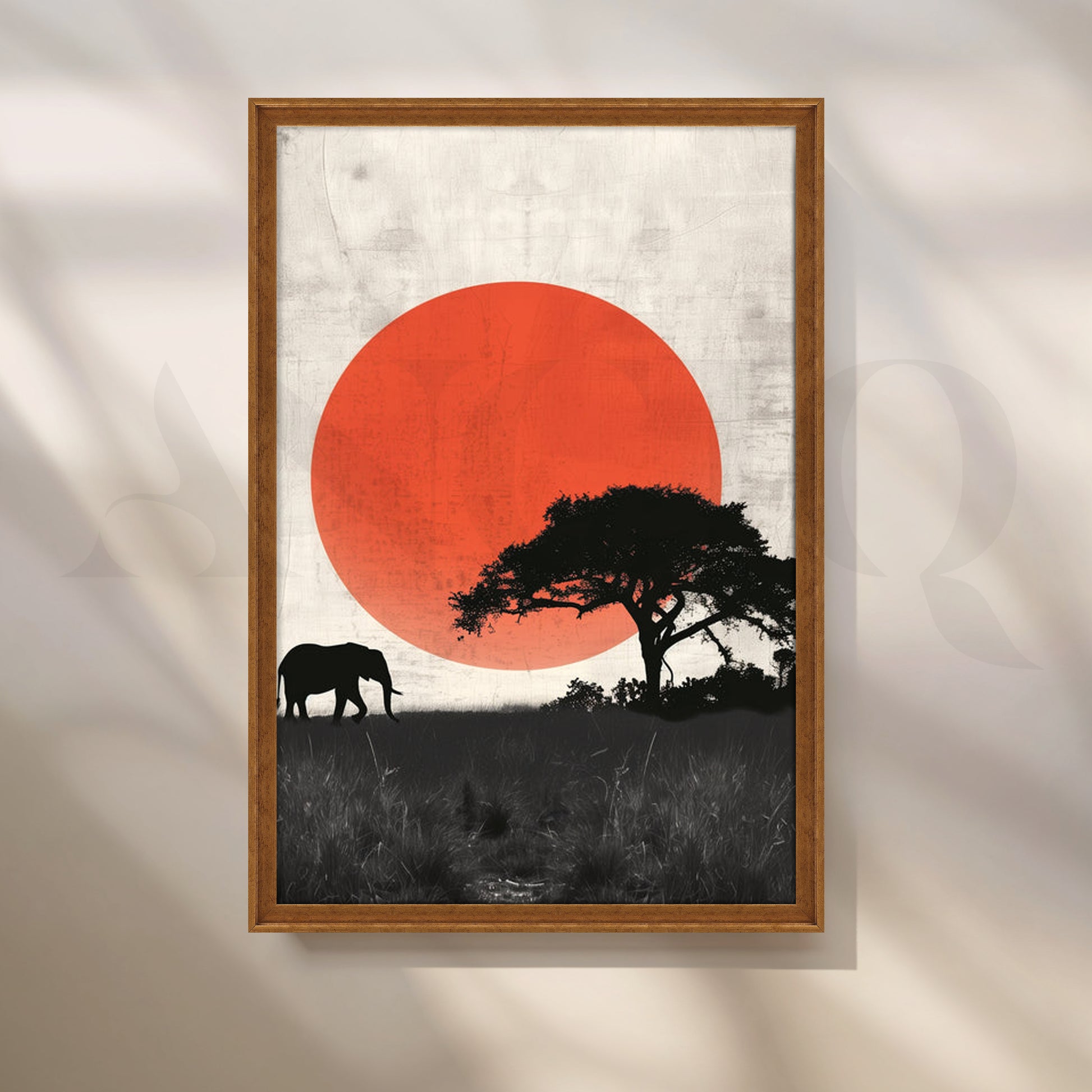 Serene wildlife wall art featuring an elephant and acacia silhouette against a dramatic crimson sun—quiet, minimalist composition in black, ivory, and rust. Ideal as large living room art, den décor, or nature-inspired entryway piece. This modern canvas painting adds warmth and wanderlust, perfect for safari décor, boho interiors, and neutral palettes.