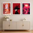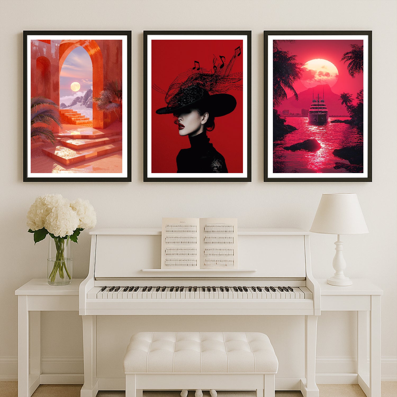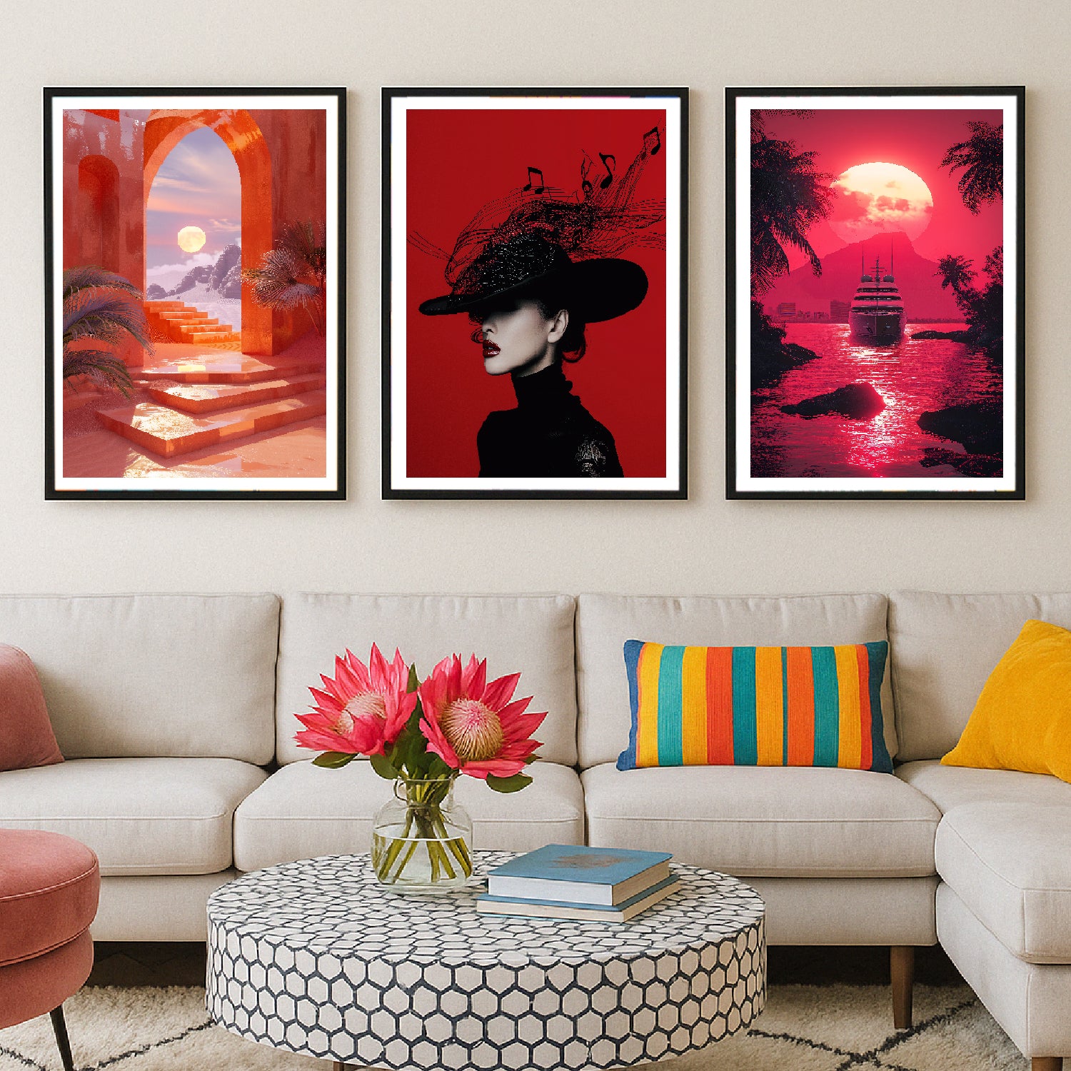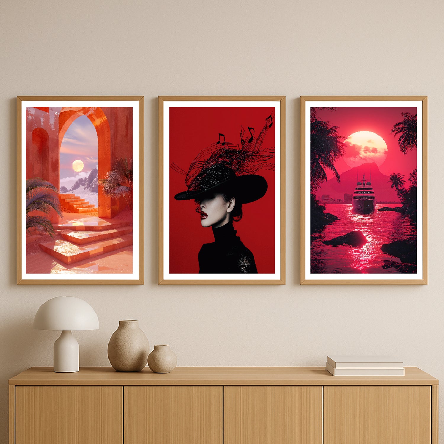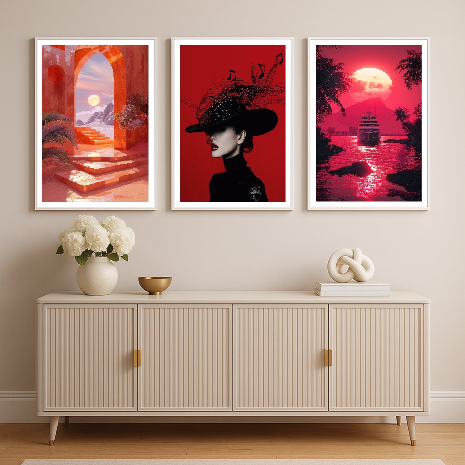 Scarlet Sunset Drama Gallery Walls bring together architectural glow, elegant fashion, and a fiery seascape. These Gallery walls add cinematic flair and sophistication to entryways, lounges, or modern luxury interiors.