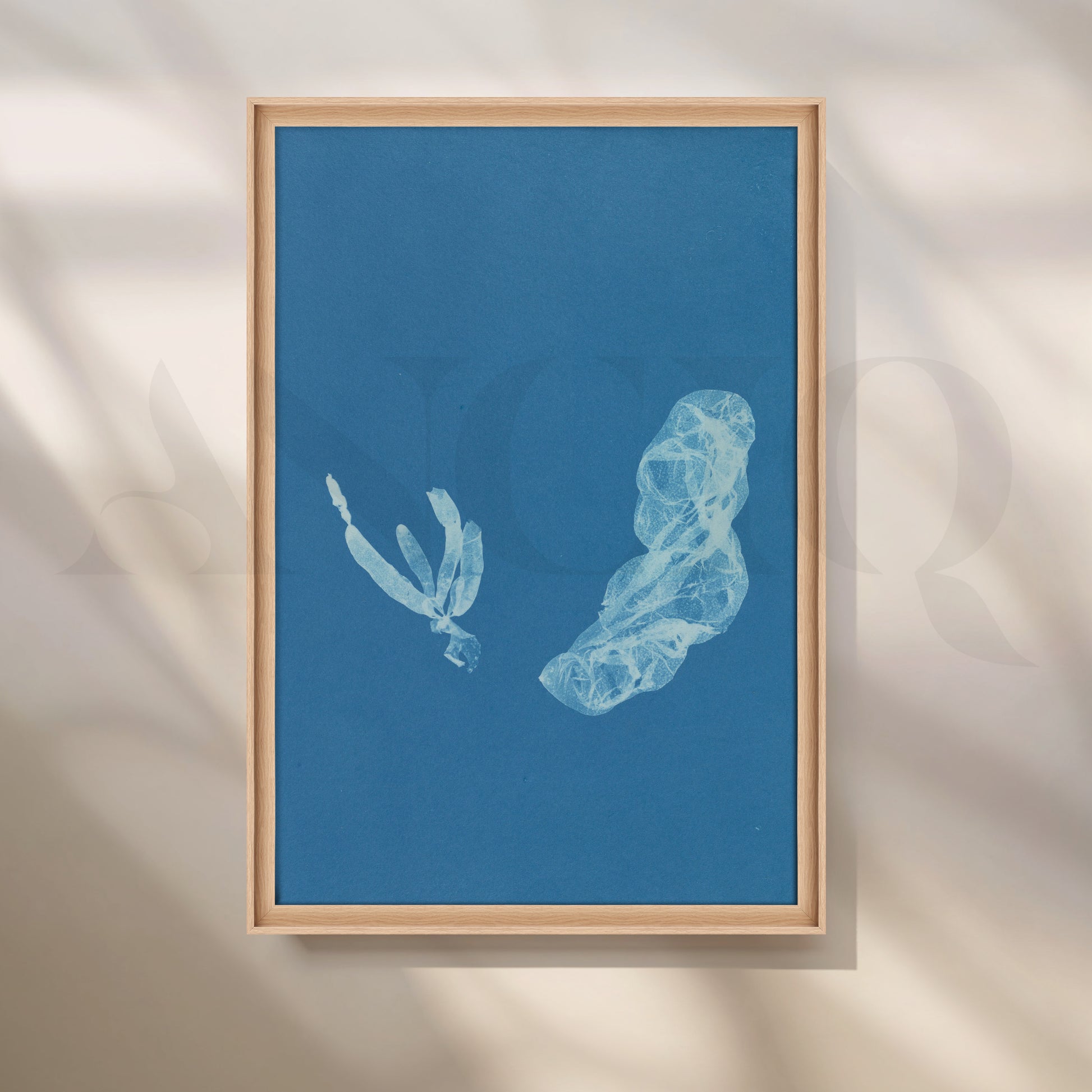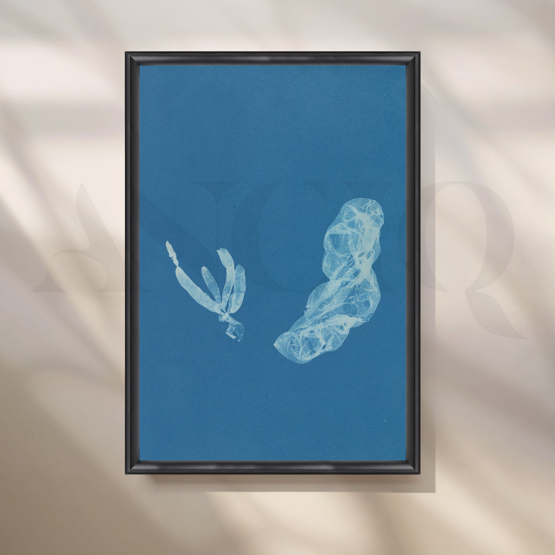This cyanotype-inspired botanical artwork in deep blue evokes calm and curiosity. Ideal for gallery walls, study rooms, or reading nooks, it pairs well with natural light and wooden tones for a coastal-modern feel.
