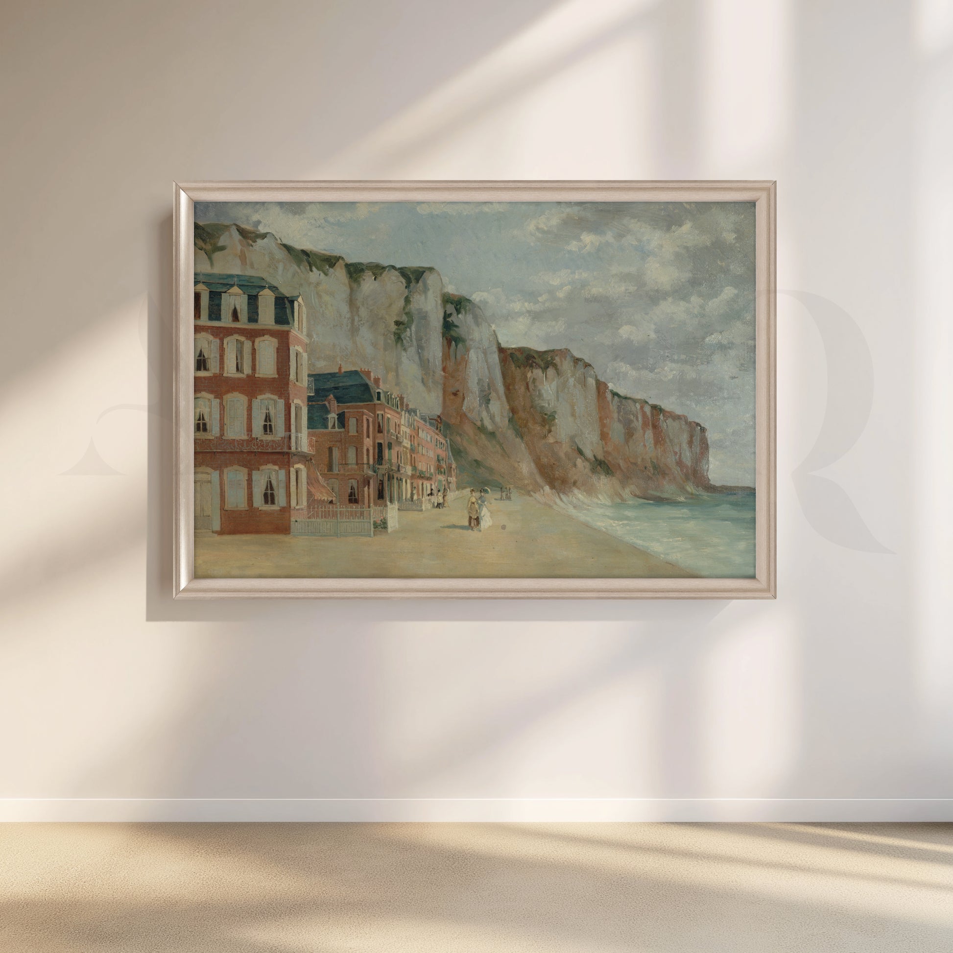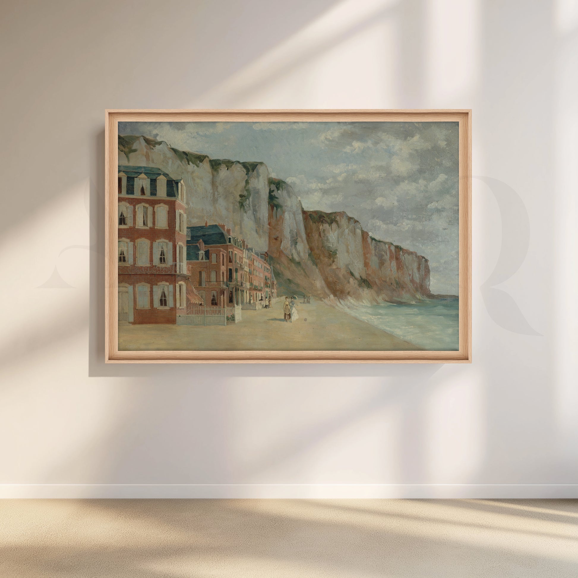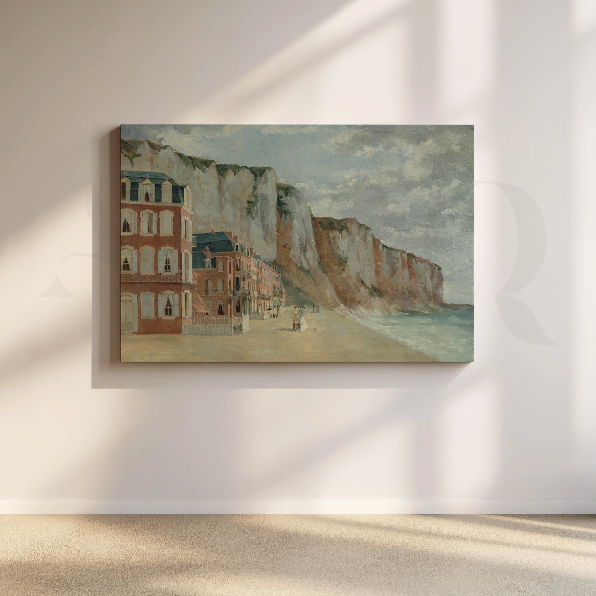 This coastal canvas wall art captures a quiet promenade lined with townhouses beneath dramatic seaside cliffs. Soft neutrals and muted blues create a calming, vintage look, perfect as living room wall art, bedroom décor, or for a serene hallway. Ideal for anyone searching for coastal canvas art, beach wall décor, or classic European seascape paintings.