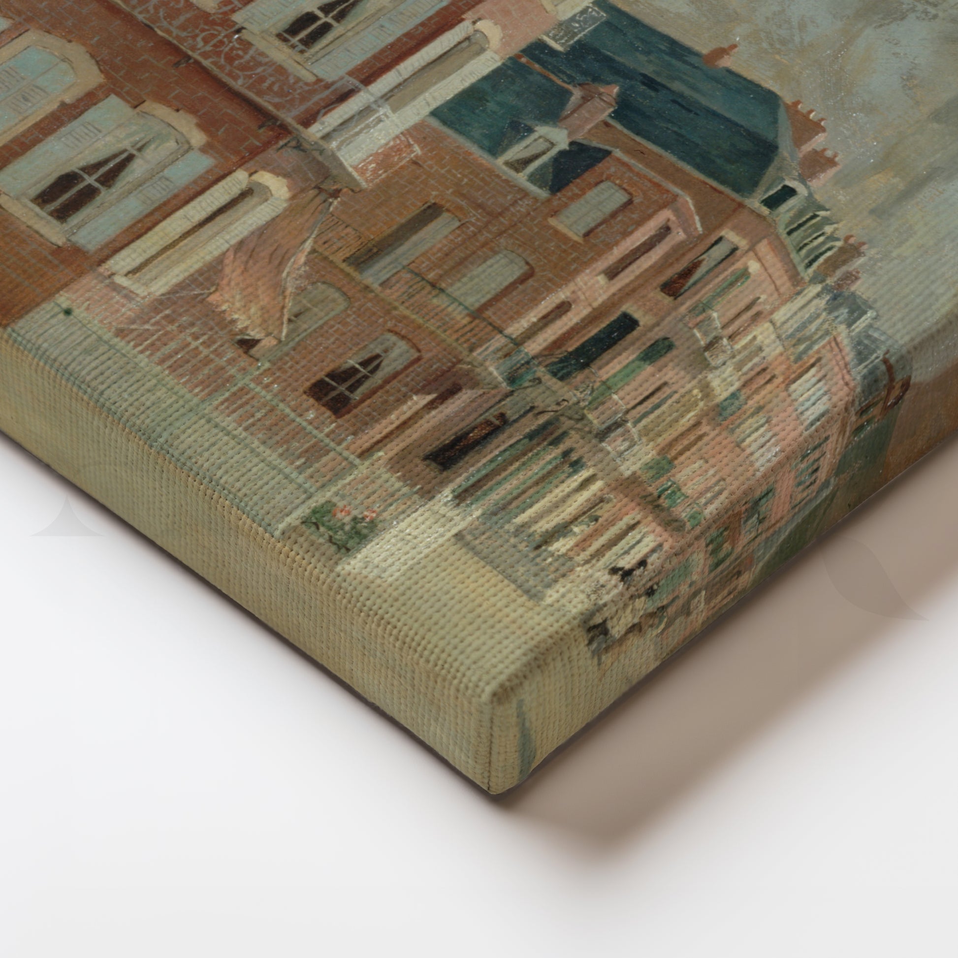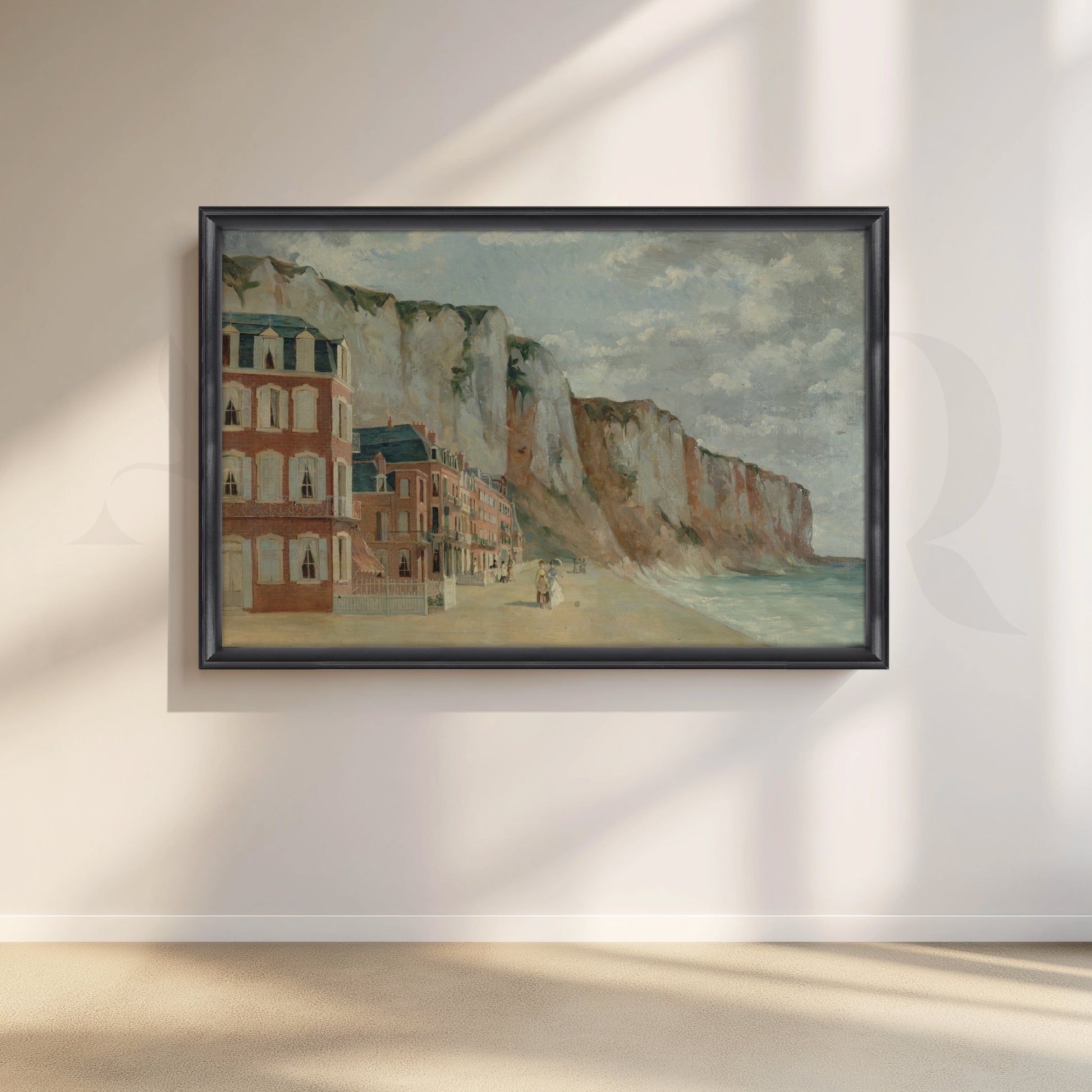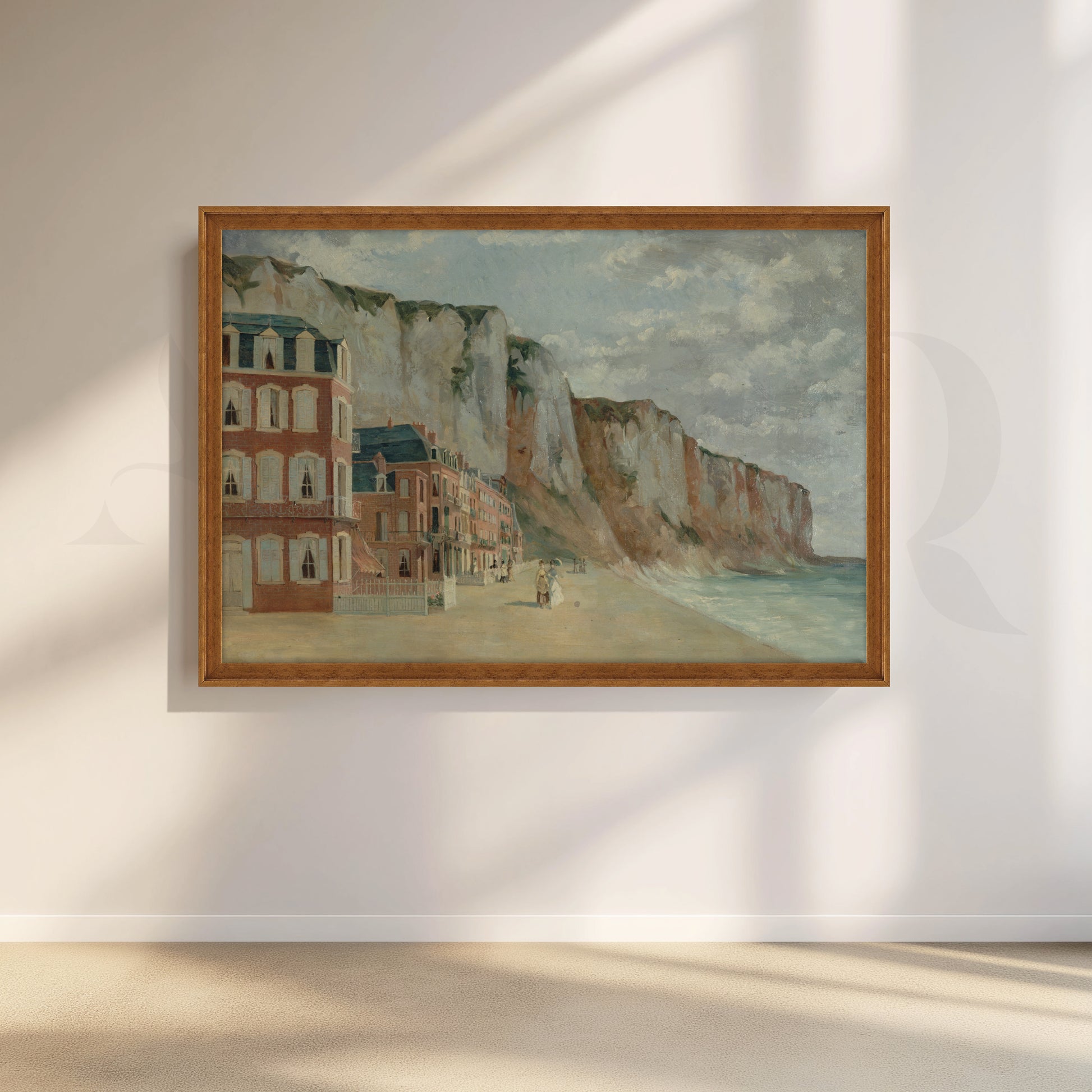 This coastal canvas wall art captures a quiet promenade lined with townhouses beneath dramatic seaside cliffs. Soft neutrals and muted blues create a calming, vintage look, perfect as living room wall art, bedroom décor, or for a serene hallway. Ideal for anyone searching for coastal canvas art, beach wall décor, or classic European seascape paintings.