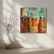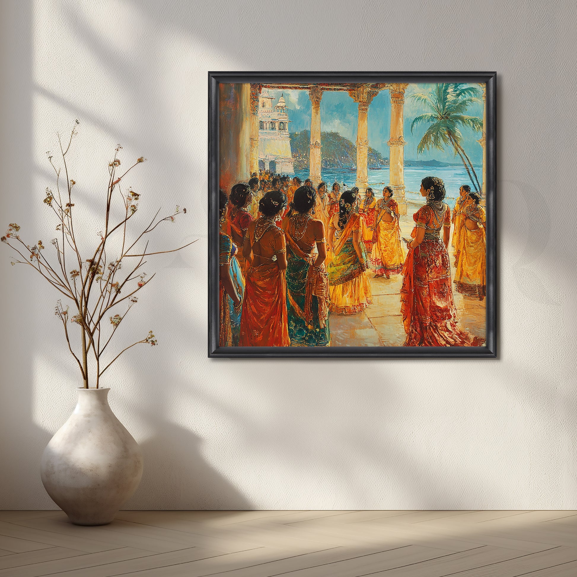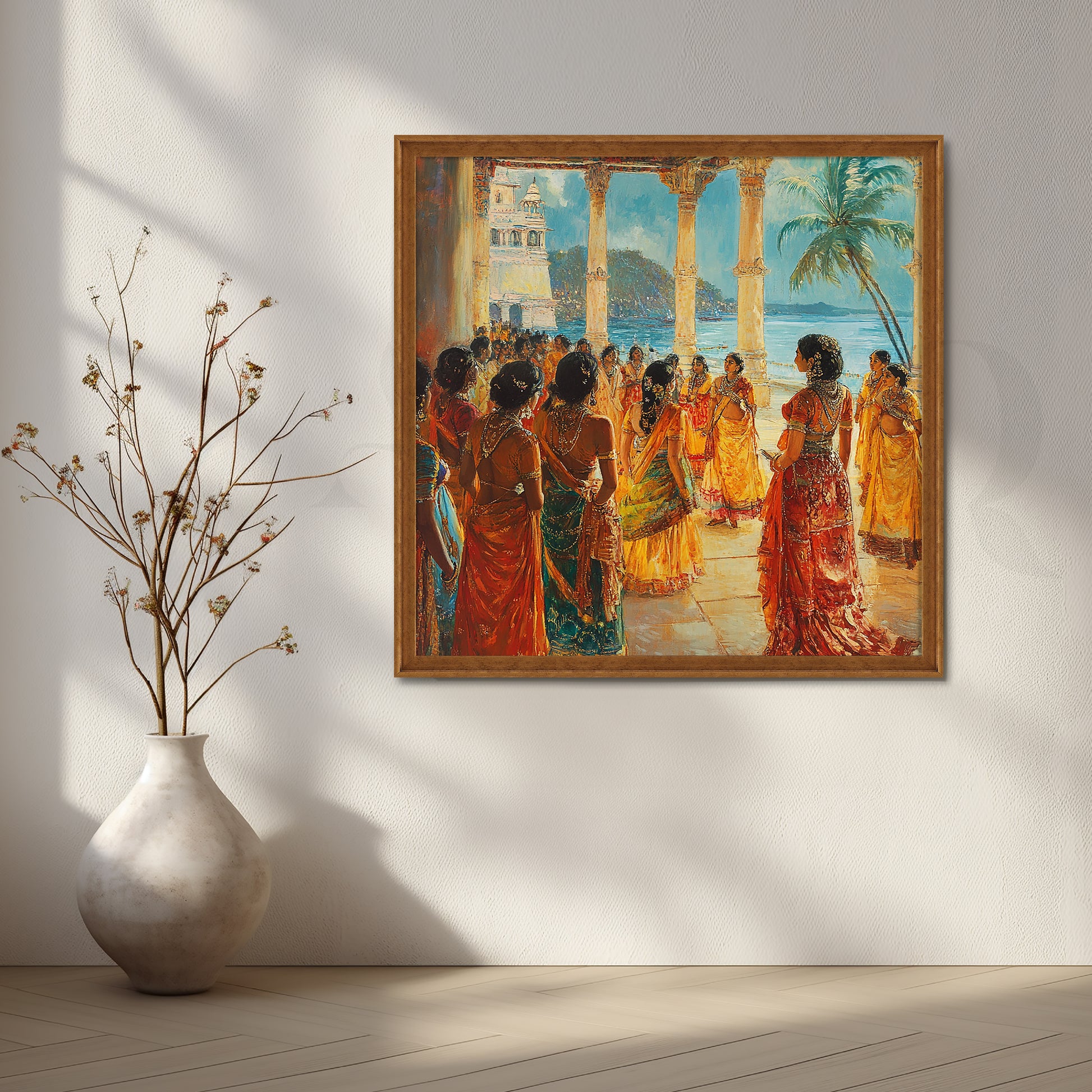 Make a grand first impression with Anciq’s “Seaside Palace Soirée” canvas artwork. Set in a sunlit coastal courtyard, richly dressed women in jewel-toned saris gather beneath carved stone pillars, their gold jewellery glowing against turquoise seas and blue hills. The lively yet elegant composition captures the charm of royal celebrations and traditional Indian culture.