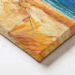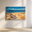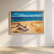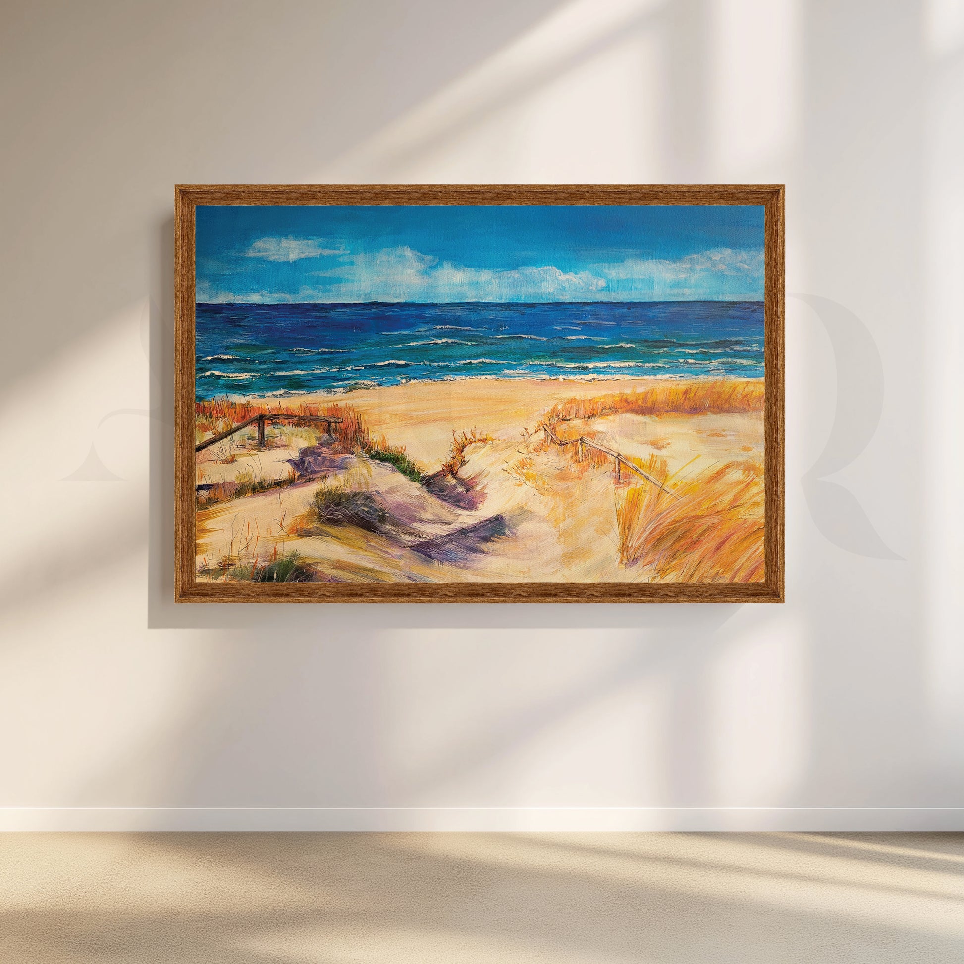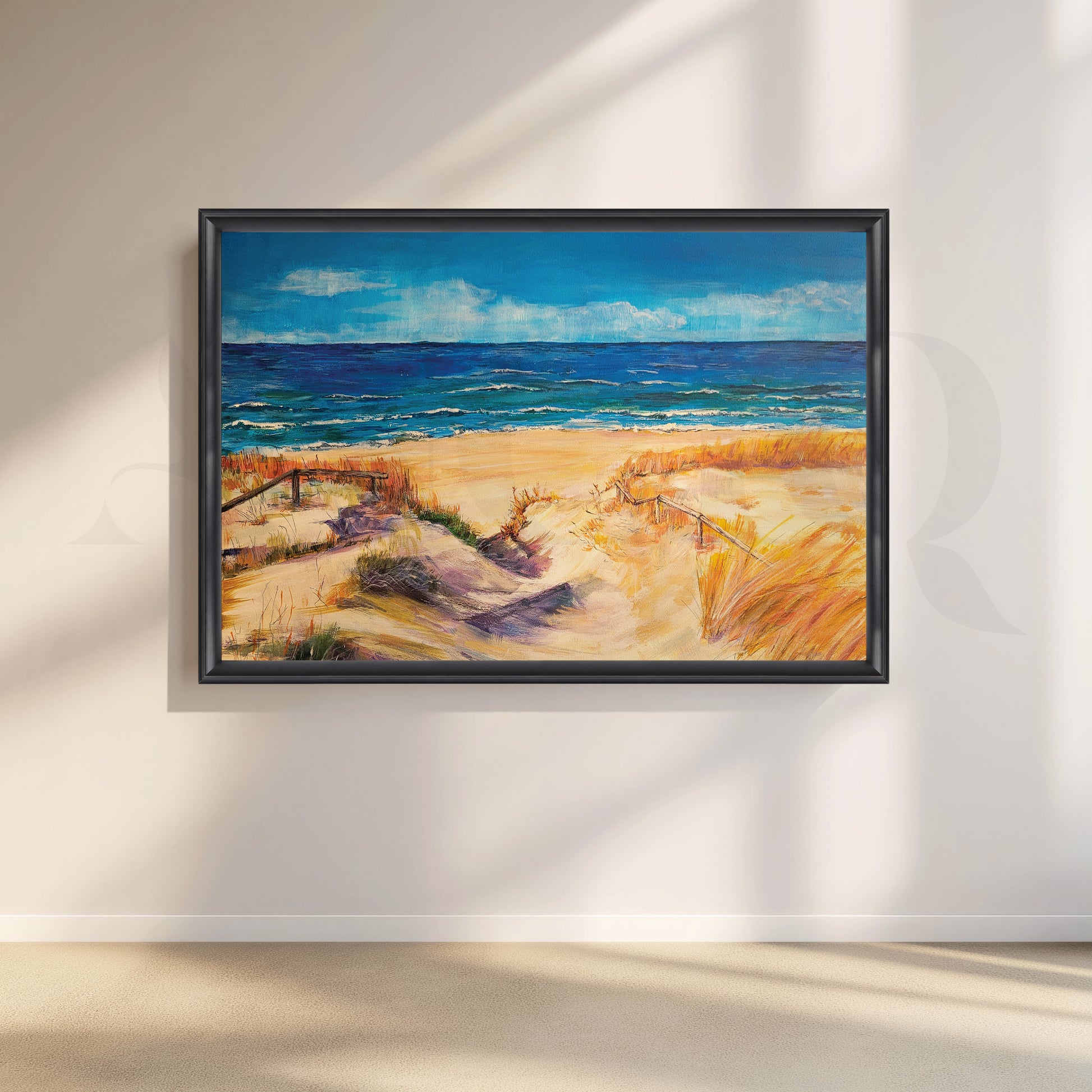 Lose yourself in the serenity of this captivating landscape. Warm sand stretches towards a turquoise ocean, where frothy waves crash against the shore. Painted in canvas, this piece brings the calming beauty of the coast to your home.