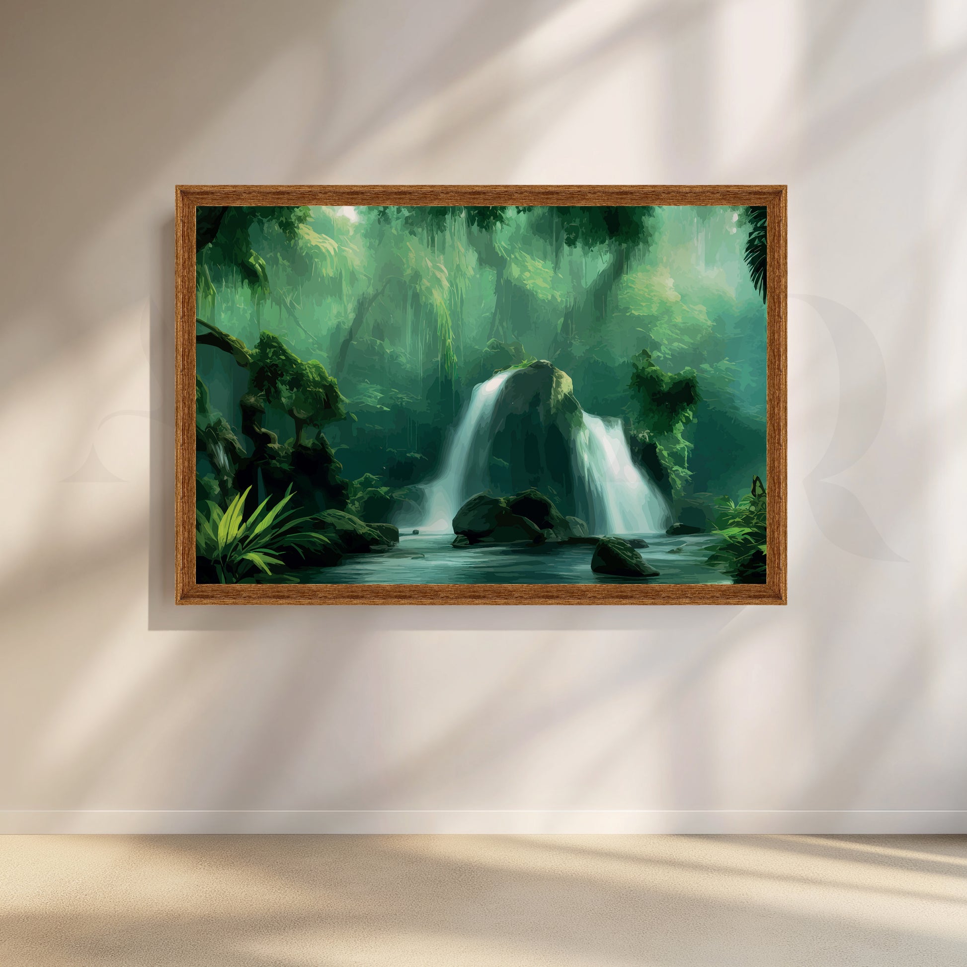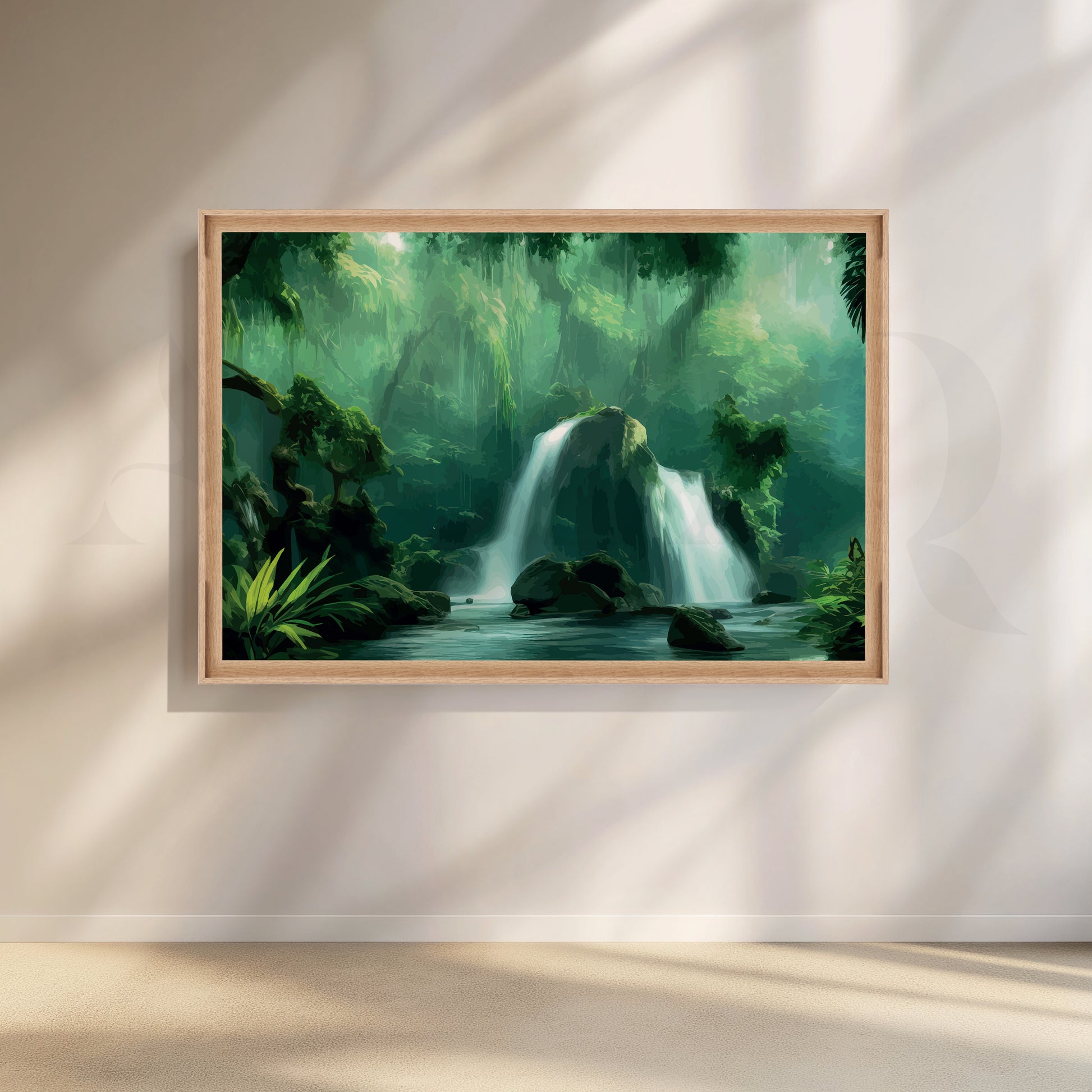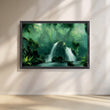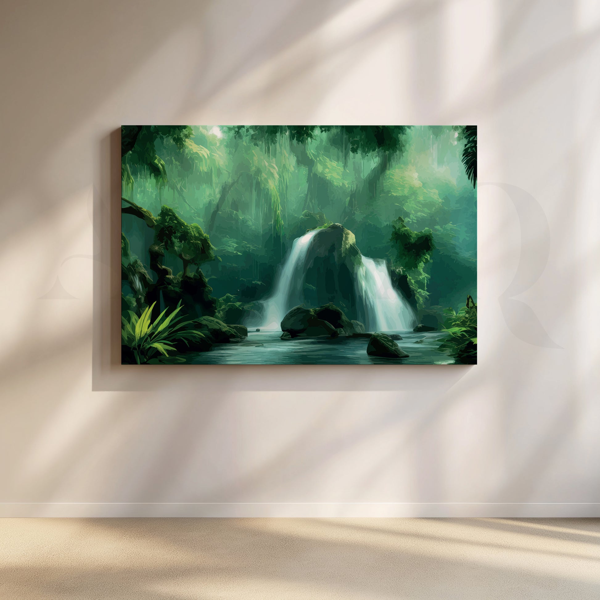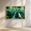 Bring the serenity of the forest into your home with this stunning canvas painting. Lush green foliage surrounds the waterfall, creating a peaceful and inviting atmosphere. Created with fade-resistant inks and stretched on hardwood surfaces, these high quality prints are a beautiful and lasting addition to any room.