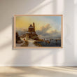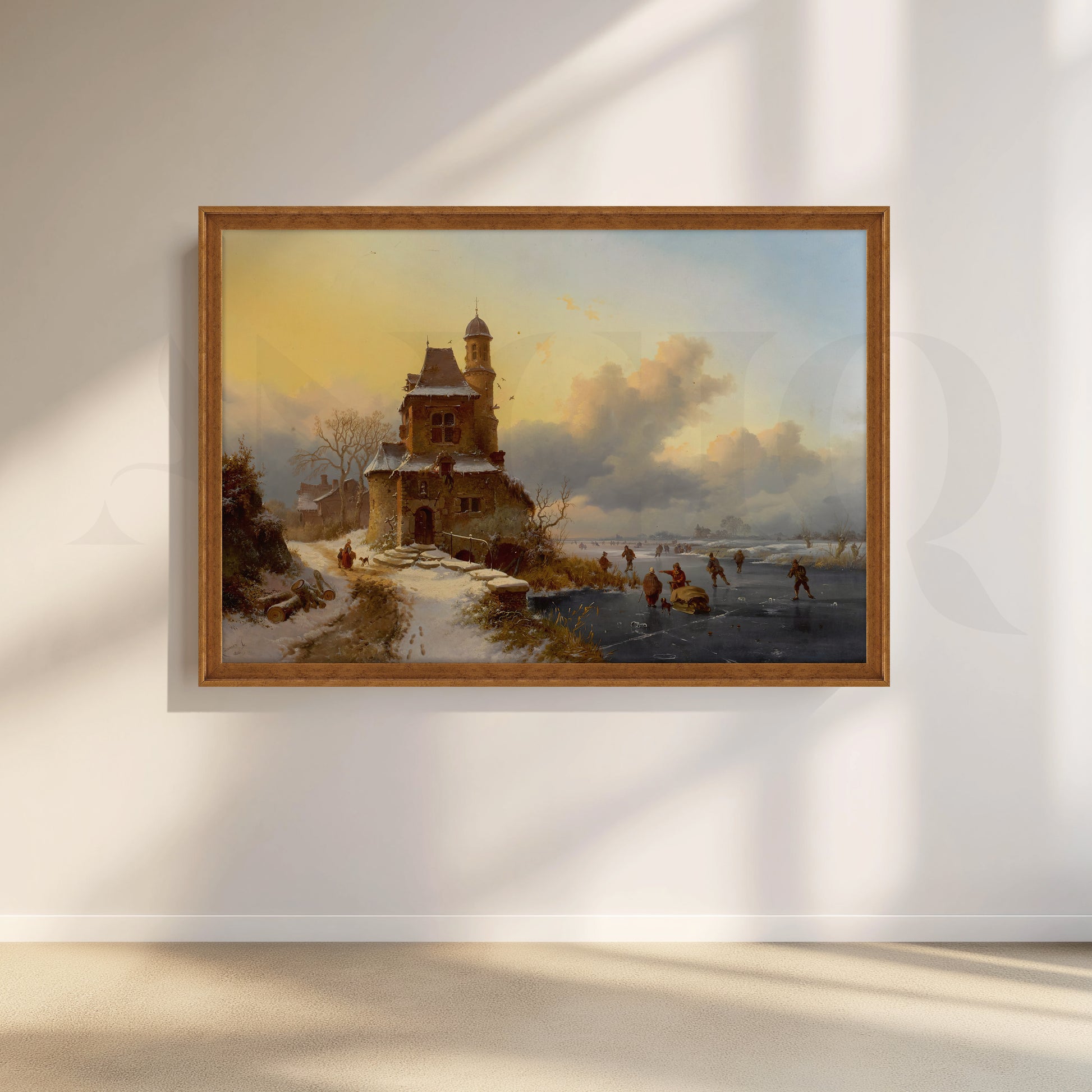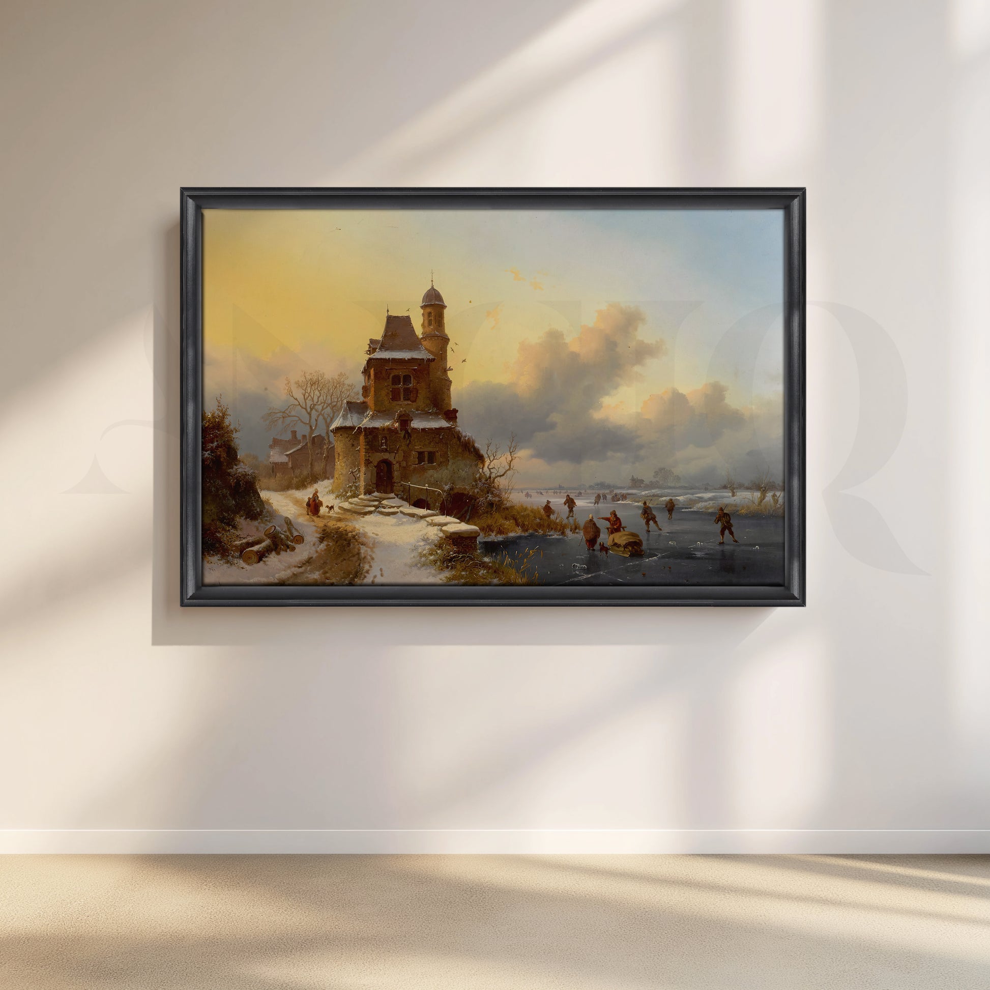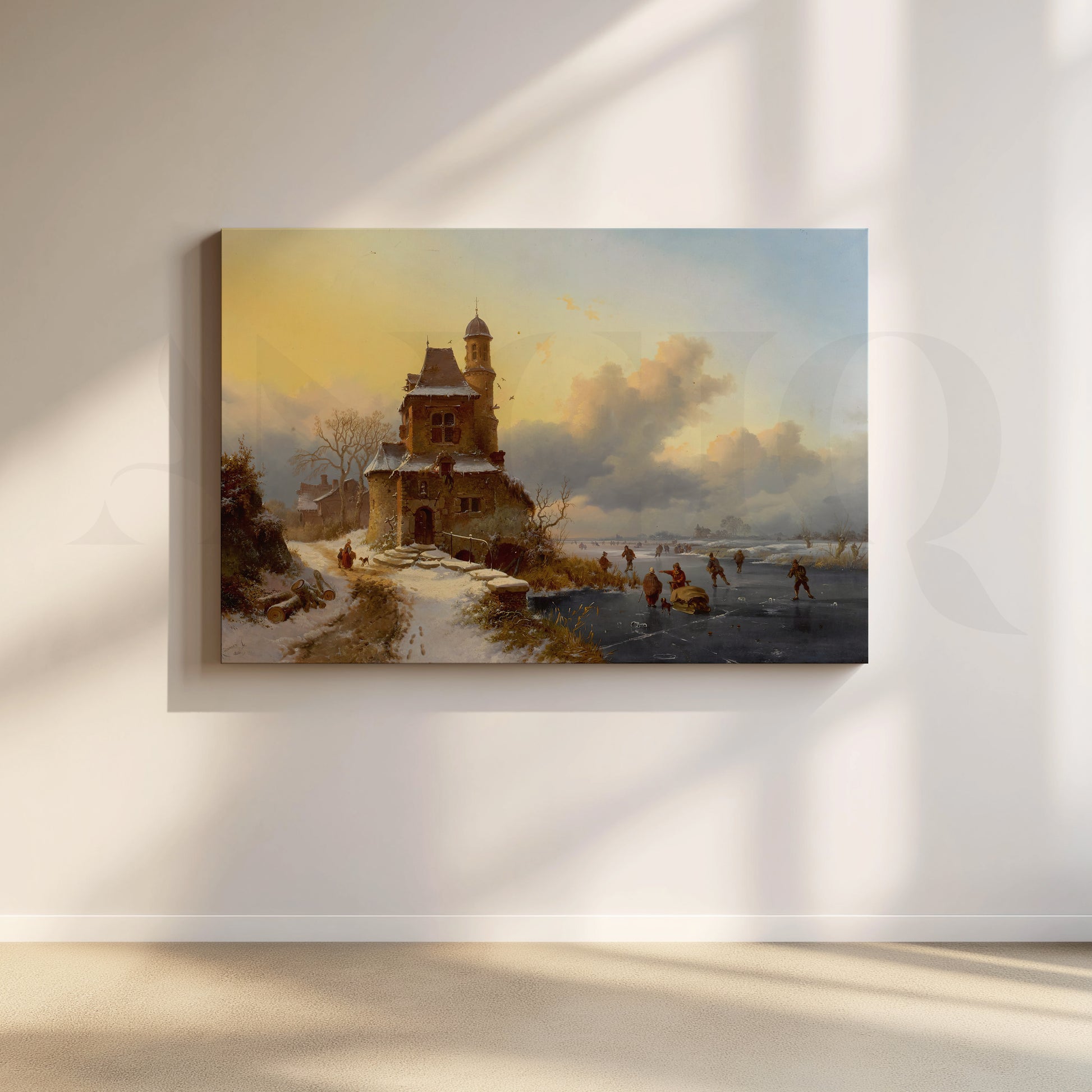 This dramatic snow castle river view canvas artwork shows skaters gliding on a frozen river beside an old stone tower under golden winter skies. Perfect landscape wall art for hallways, living rooms, and offices, it blends historic European architecture, icy water reflections, and warm light, adding depth, character, and vintage charm to any décor.