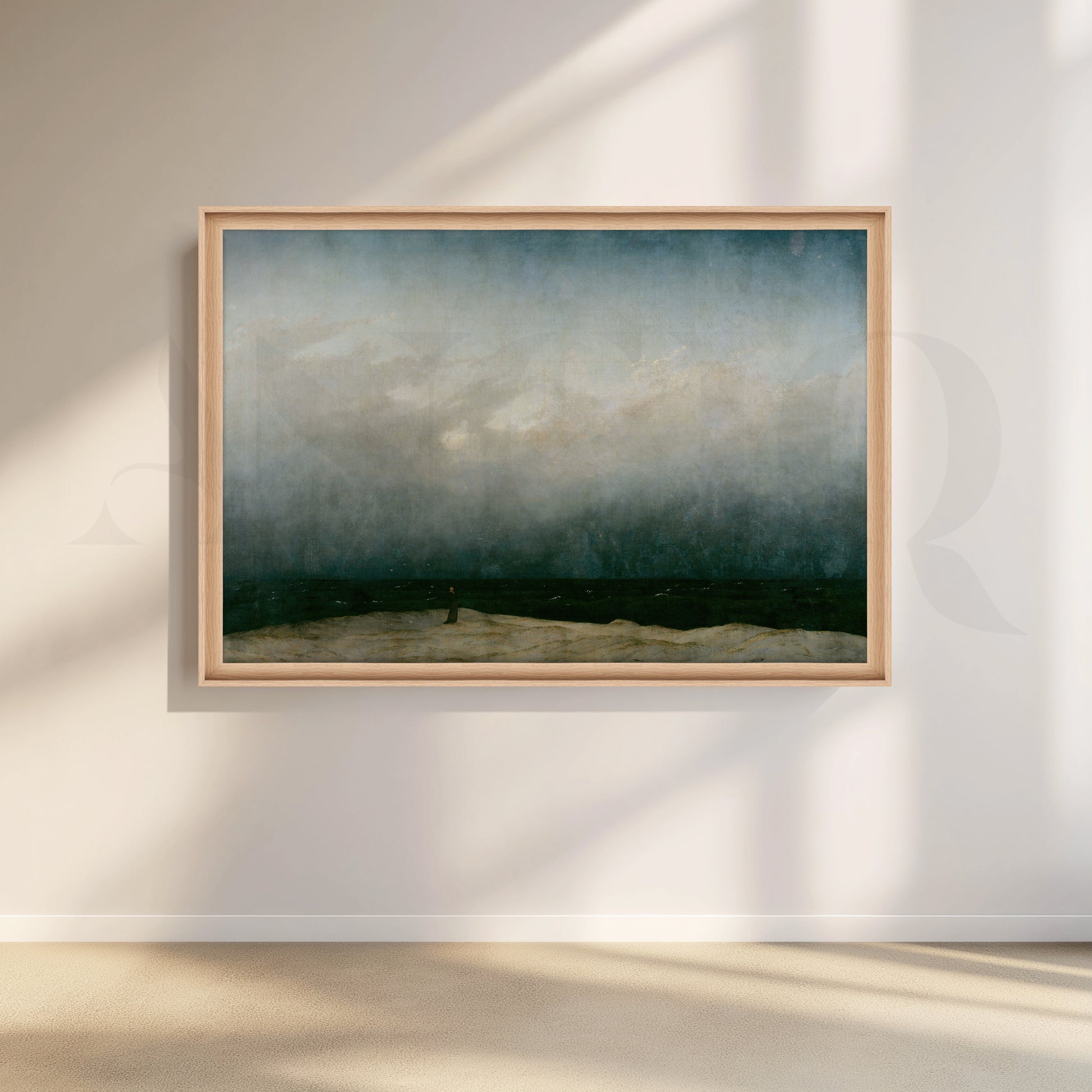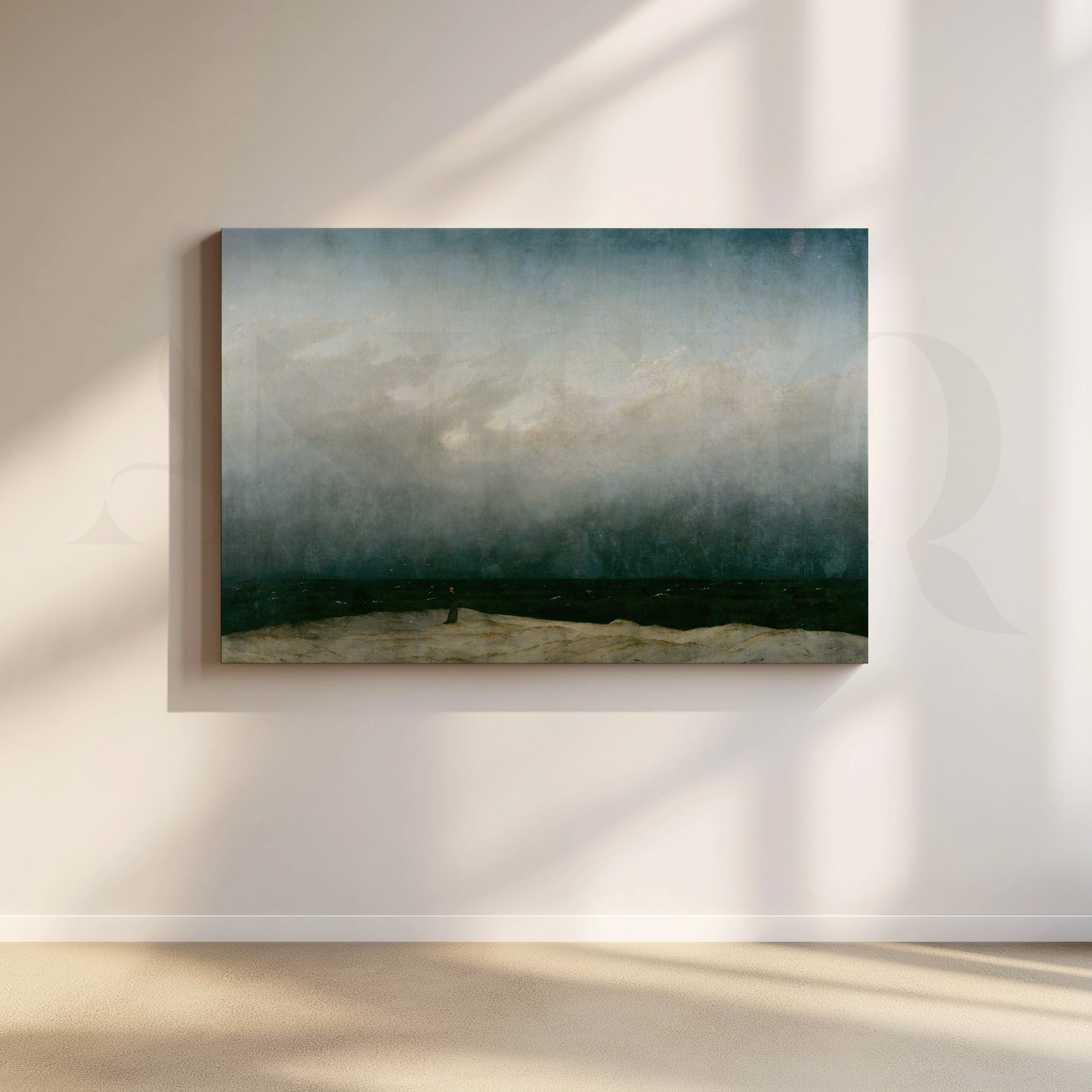 Minimal coastal seascape with a vast moody sky, dark ocean band and soft sandy foreground—calming blue-grey tones inspired by Romanticism. Perfect large wall art for modern living rooms, offices and studios. Keywords: minimal seascape wall art, coastal canvas painting, abstract landscape print, blue grey ocean art, serene wall décor, modern coastal artwork, large canvas for living room.