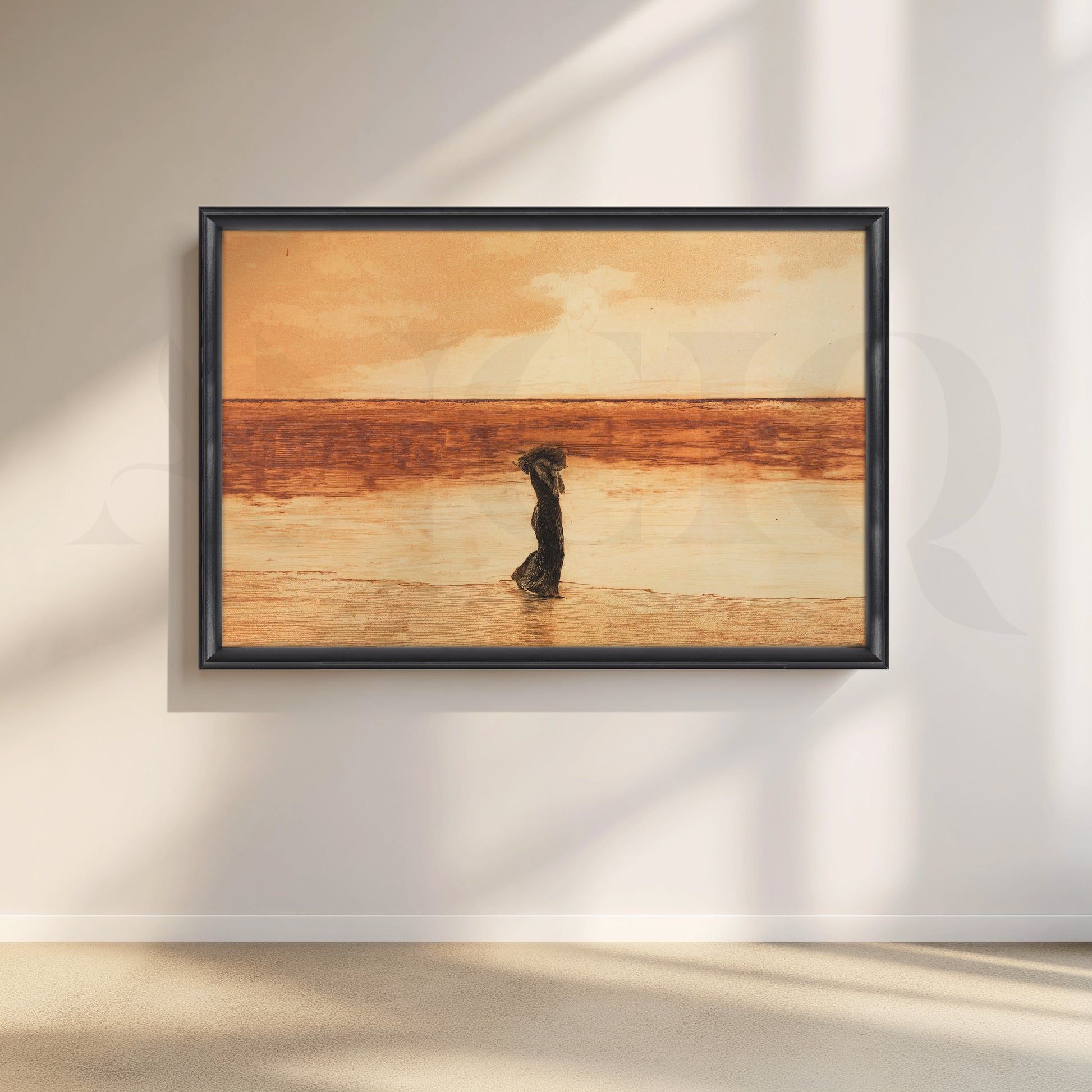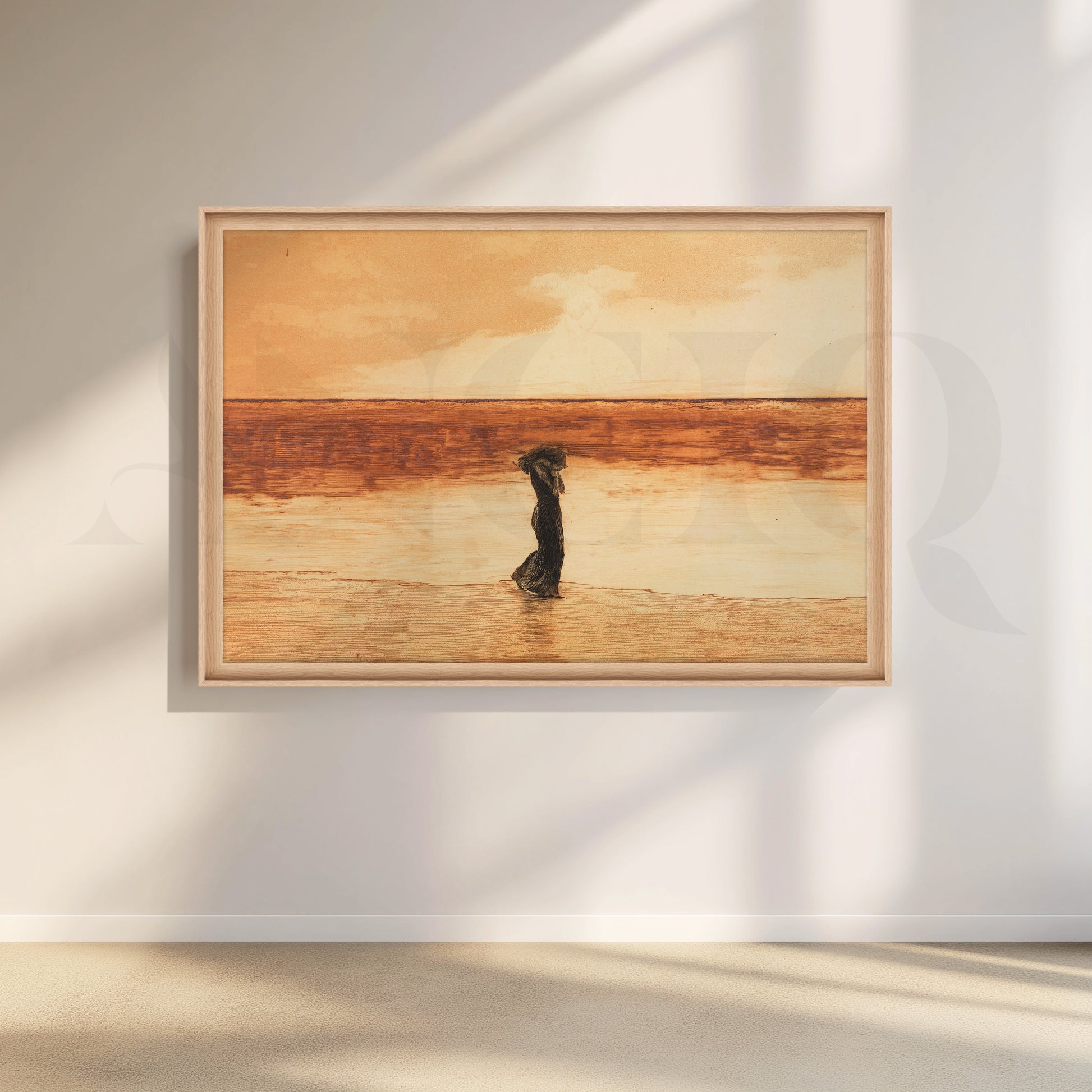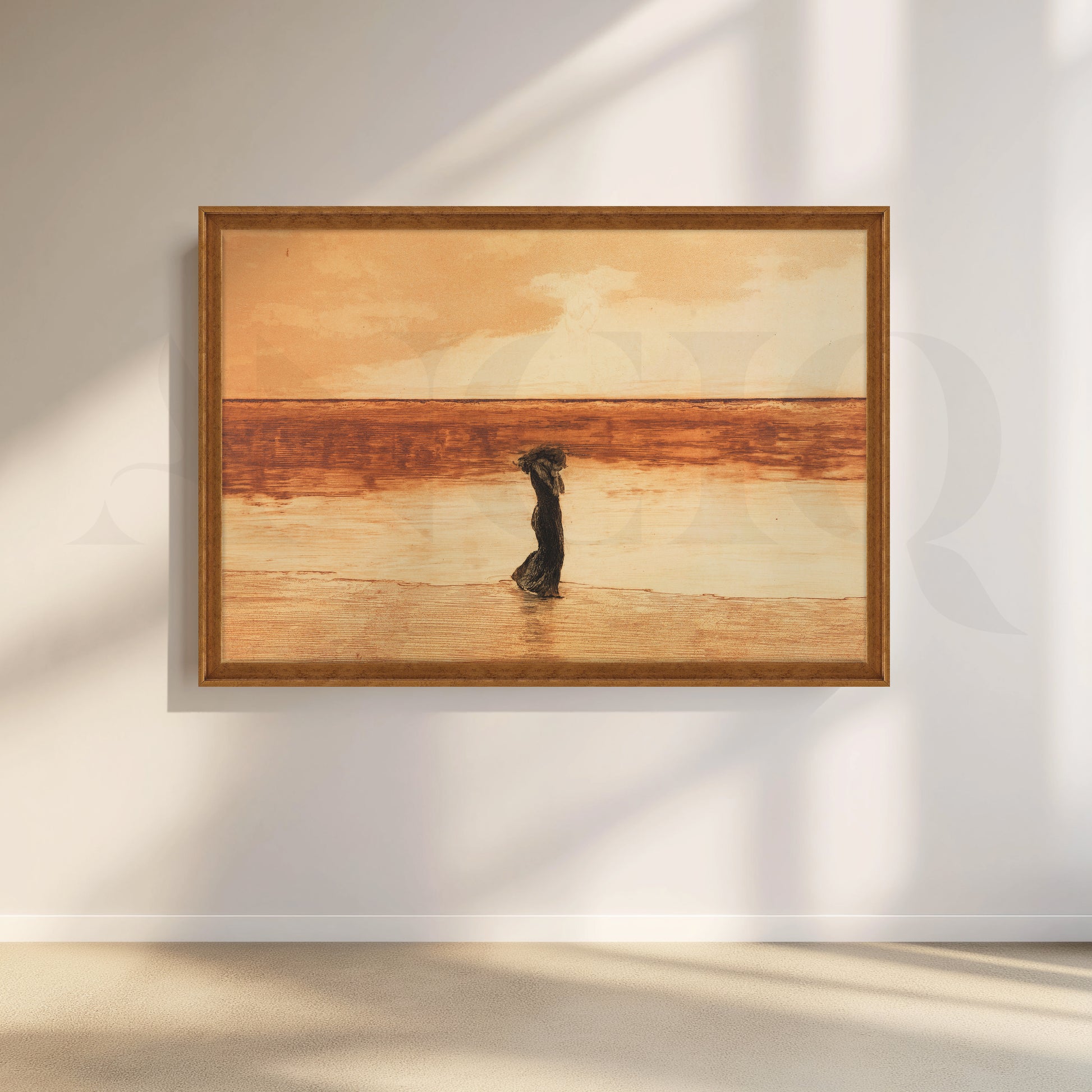 A lone figure stands by a quiet tide line under a copper-peach sky—minimalist, meditative, and serene. Subtle grain and warm neutrals make this coastal scene soothing bedroom wall art and a perfect piece for calm, mindful interiors. Ideal search terms: minimalist beach painting, serene coastal canvas, modern seascape art, neutral bedroom wall decor, sunset shoreline print, mindfulness artwork, warm beige wall art.