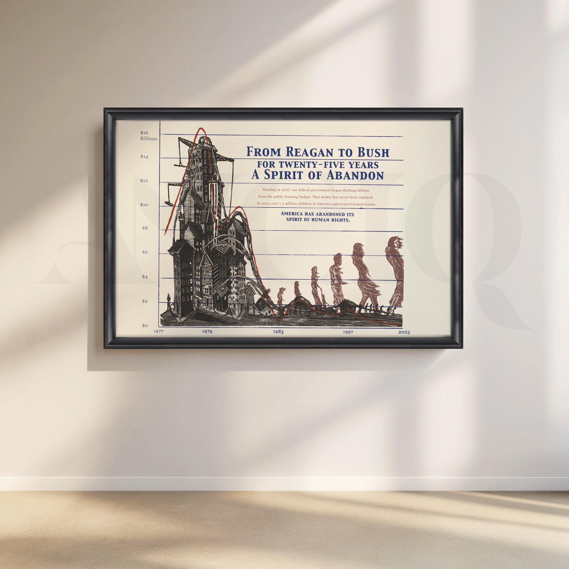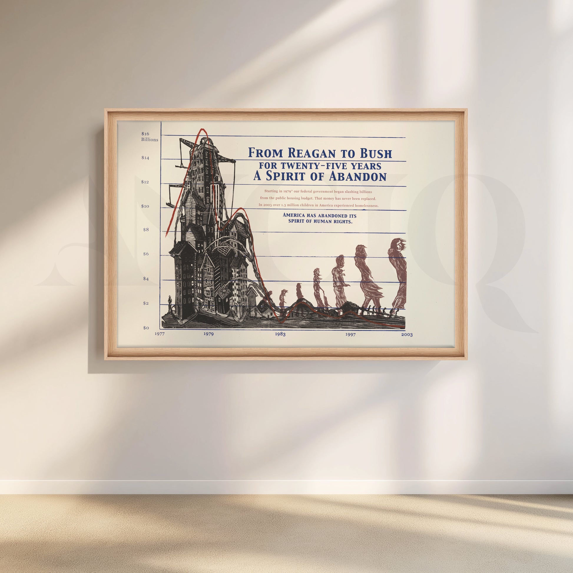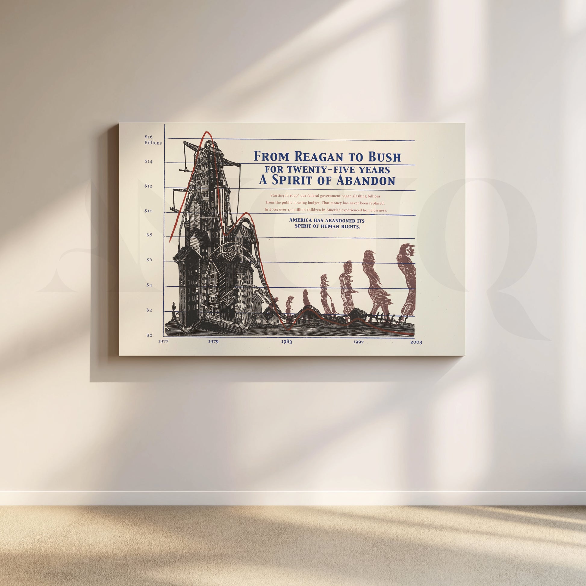 Anciq ‘Spirit of Abandon’ Canvas Artwork portrays the socio-political shift from Reagan to Bush through powerful imagery and economic data. Ideal for study rooms, offices, or reading corners, this monochrome print speaks to viewers interested in history, rights, and American cultural commentary.