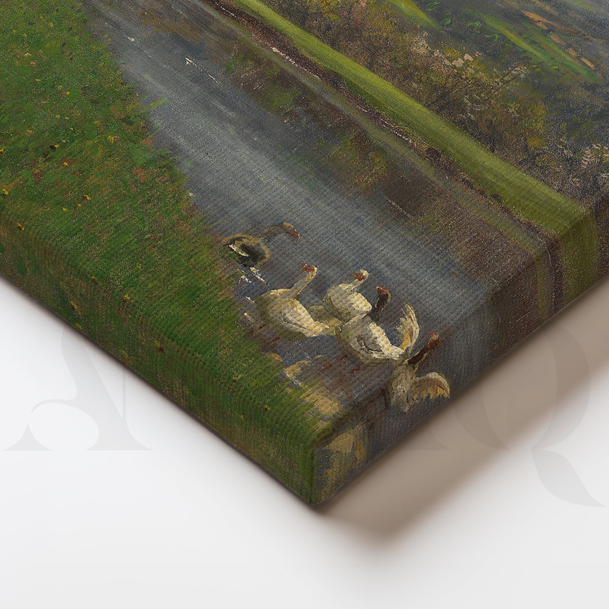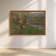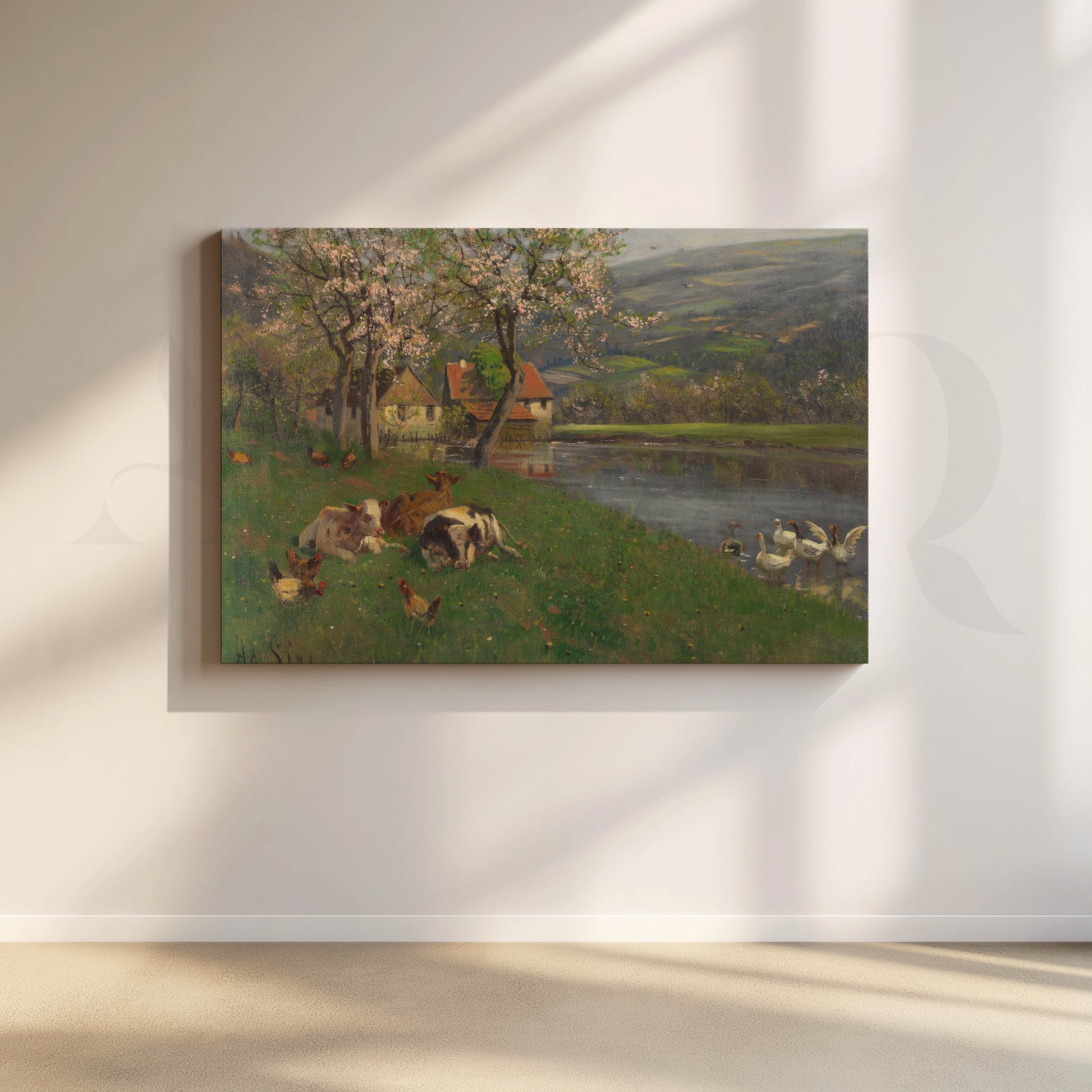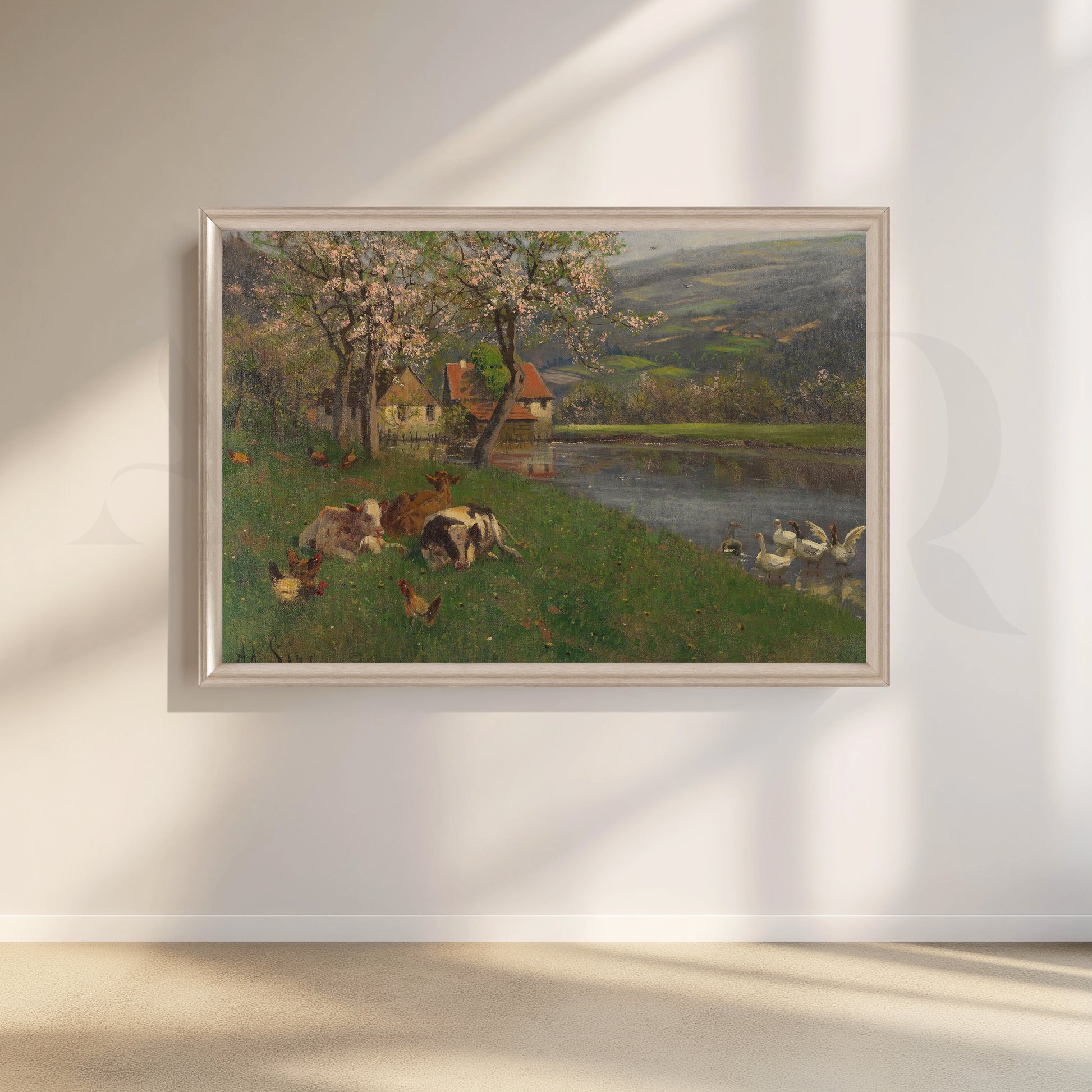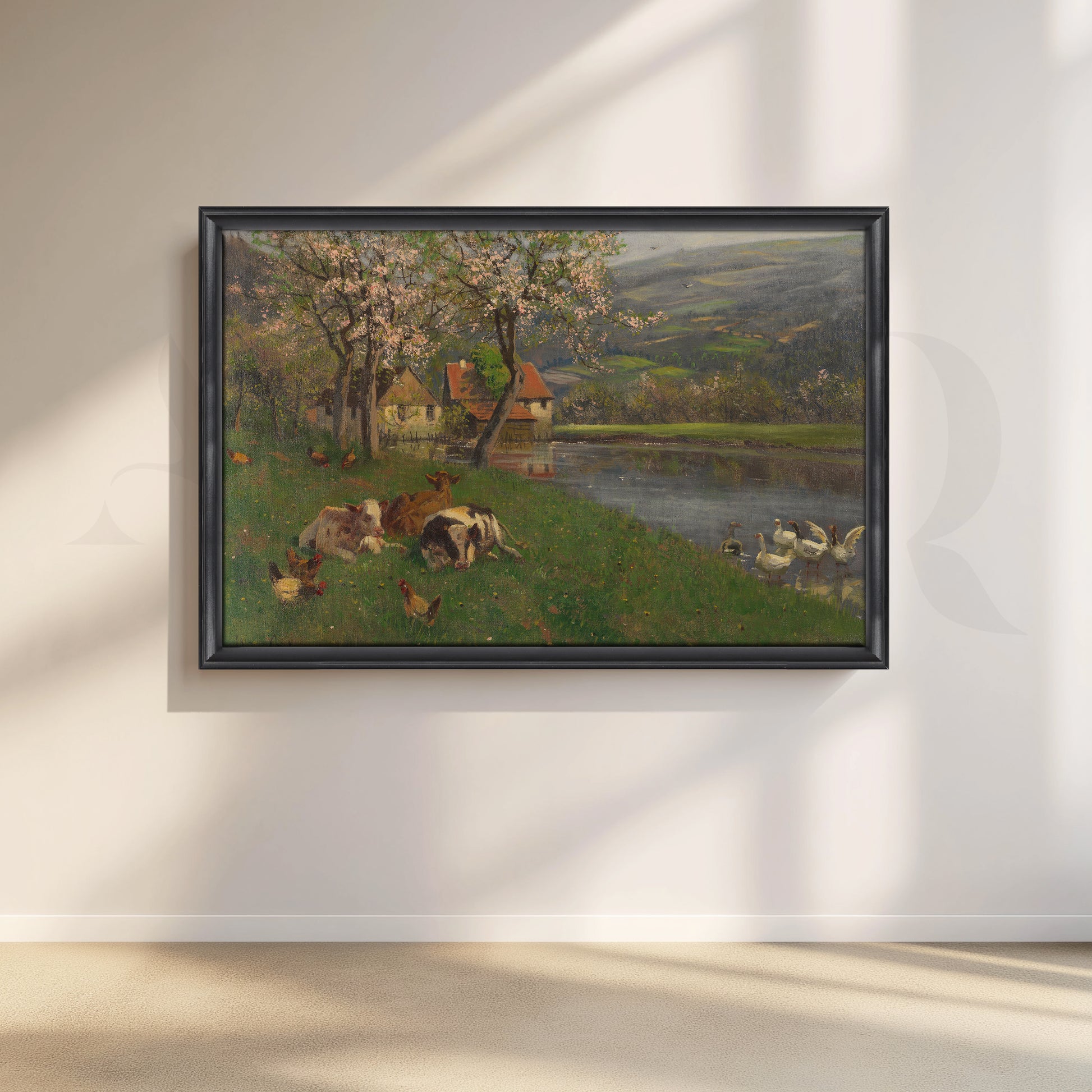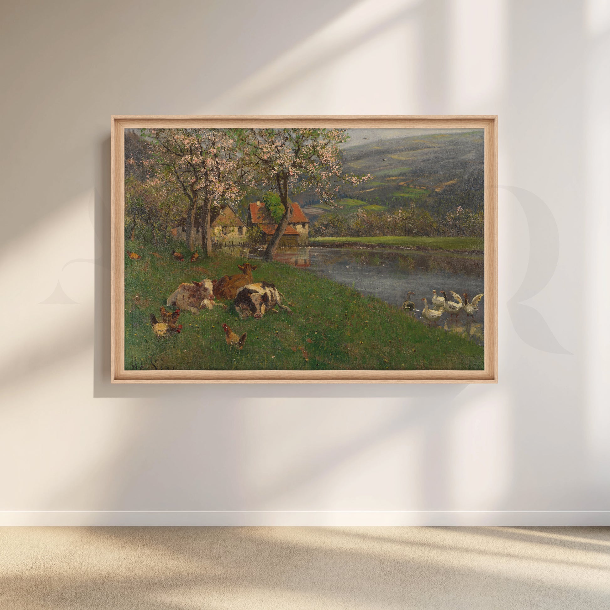 A serene countryside landscape with grazing cows, chickens on the grass, and geese by a calm river under soft blossom trees. This classic pastoral canvas wall art adds warmth to living rooms, dining areas, and farmhouse-style interiors—perfect for nature décor lovers.
