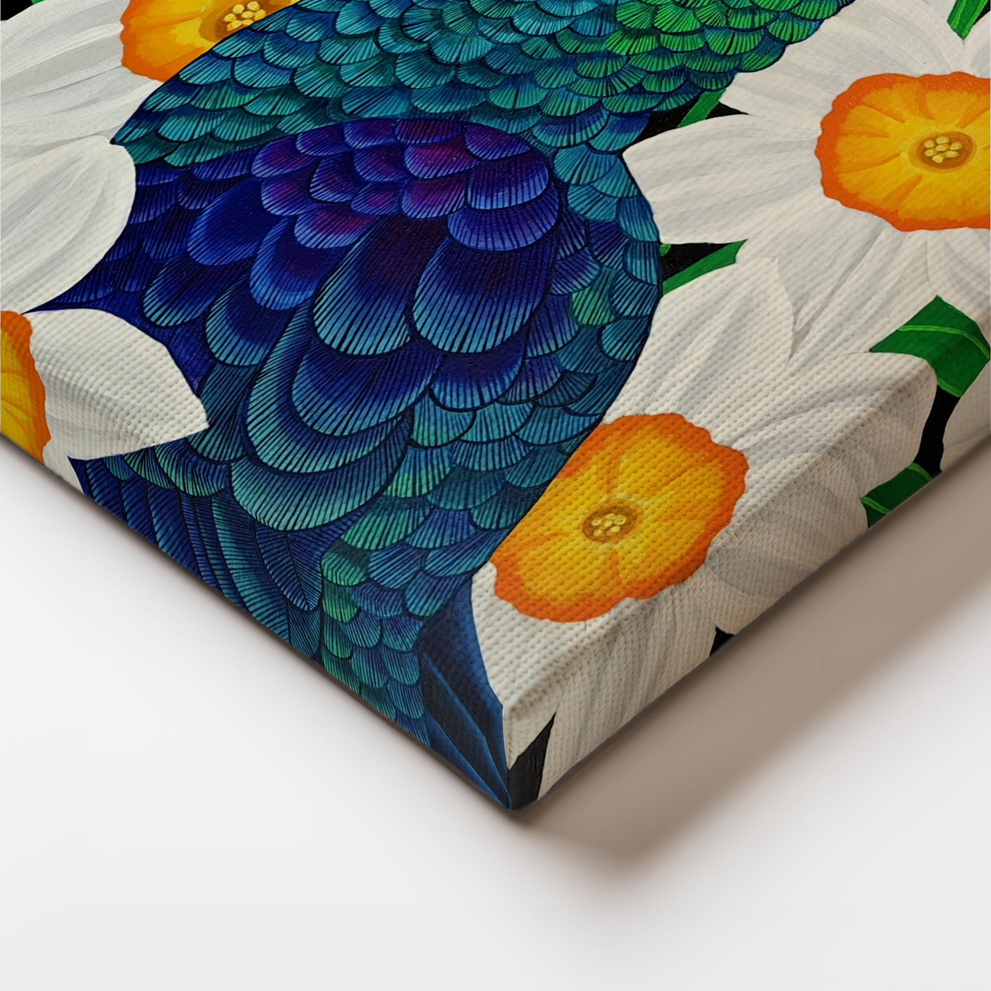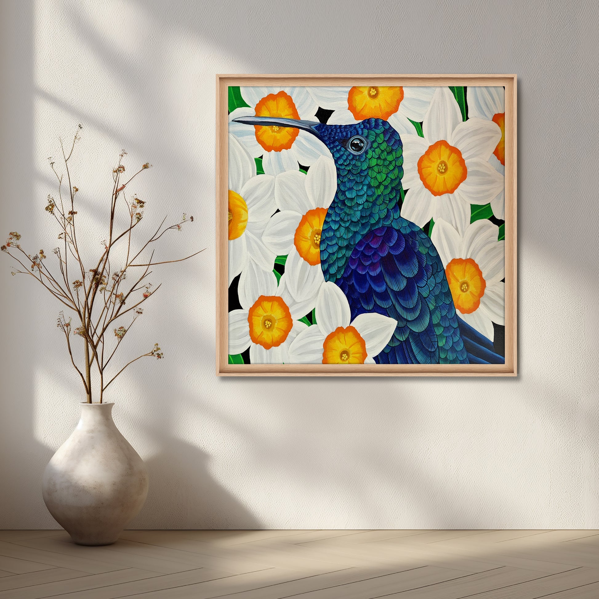 This work displays a dazzling beauty and daffodils that welcome the season of new beginnings - Spring. With the smallest strokes of details and layers of color, the painting focuses on the brilliant emerald- violet plumage of the ' Green Crowned Woodnymph ' - a hummingbird species known for its iridescent throat and crown. With meticulous attention to details , the lines are hand painted on each feathers to resemble the beauty of such species. It is a simple yet splendid representation of the Spring Season with daffodils garden in a pitch black backdrop and the stunning subject of the painting that adds both depth and definition to the overall composition. Made in 2024.