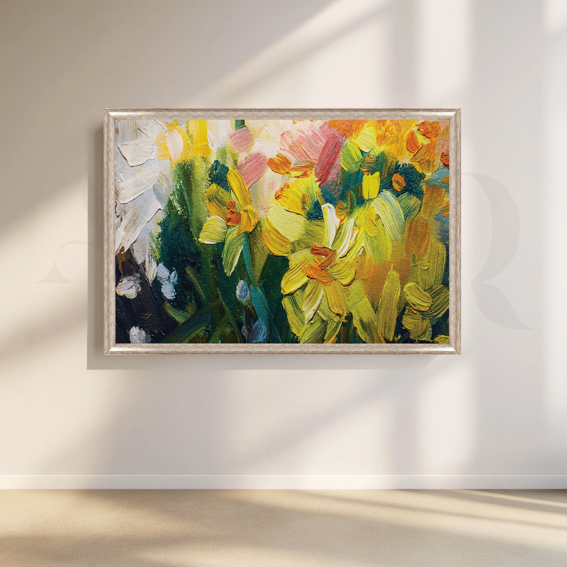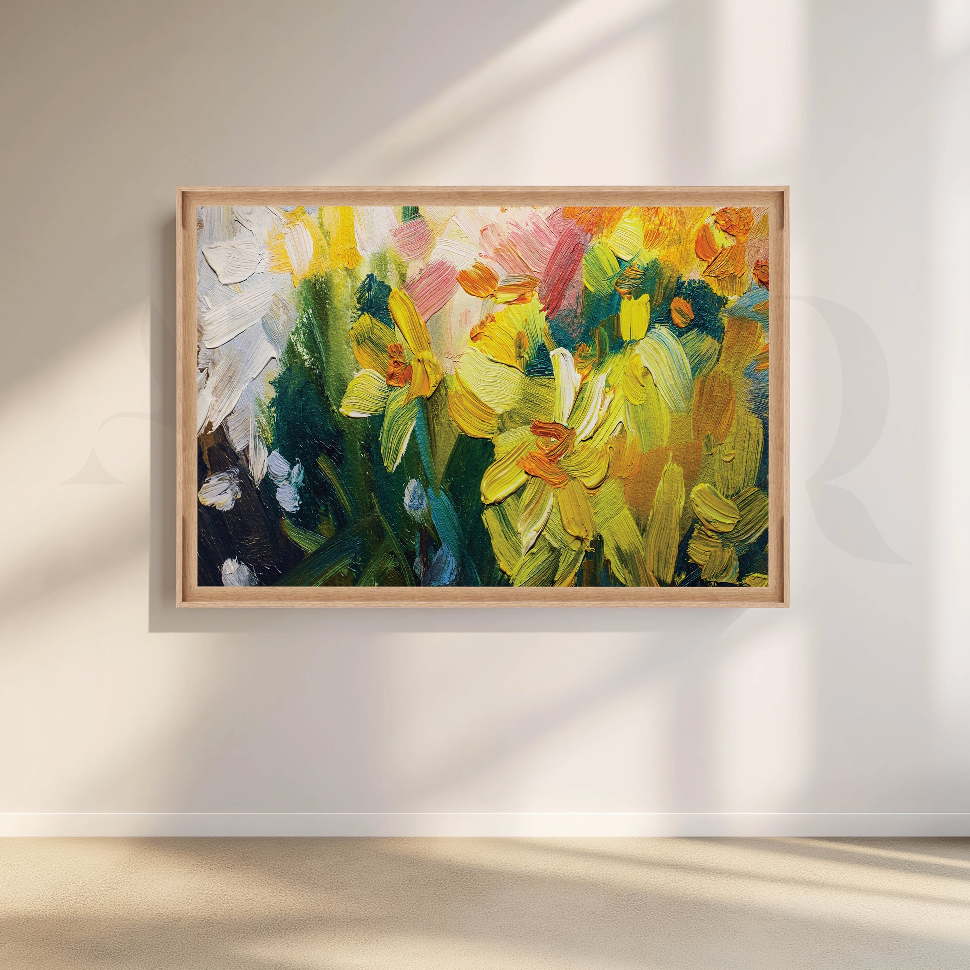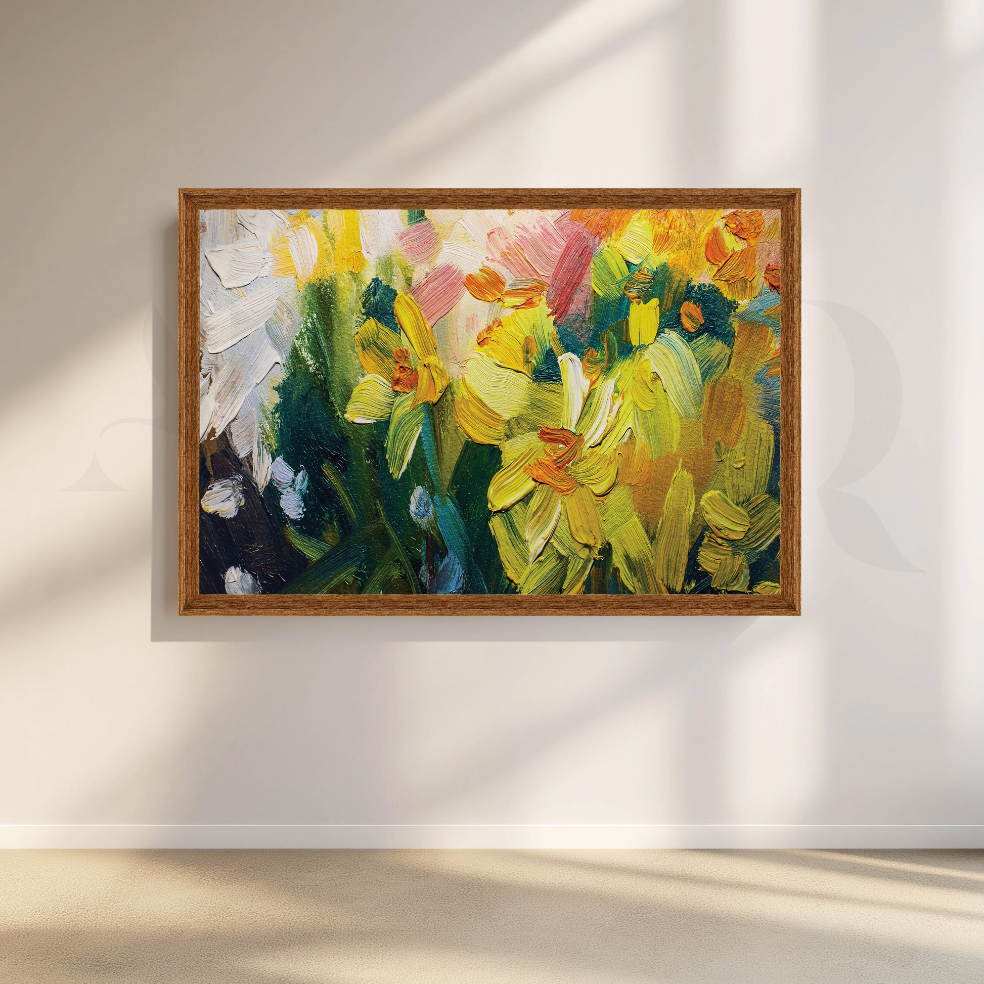 This close-up painting of flowers is a vibrant and textural artwork. The creativity of using the rich colors, create a sense of depth and realism. This artwork can be a great element in adding to your home decor or office space as it defines peace.